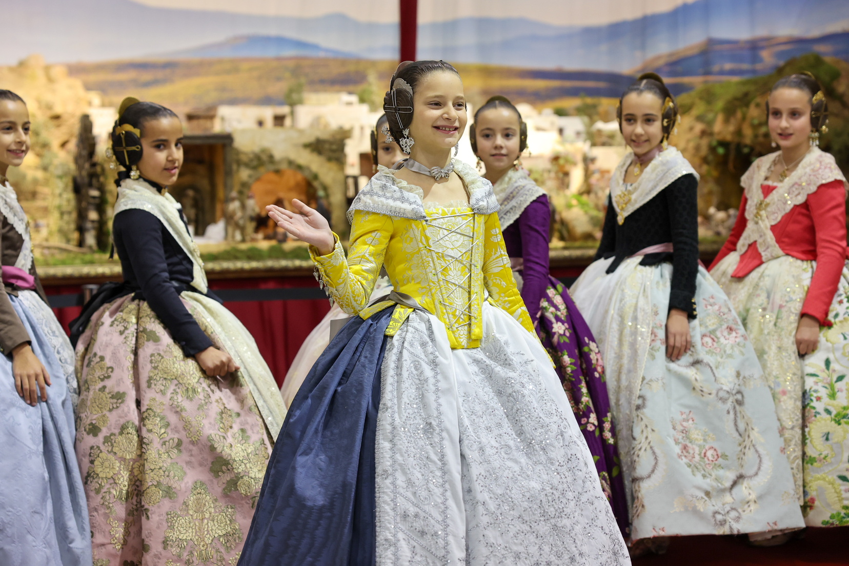 El estilismo se completa con un exquisito aderezo en plata de Paco Artola, ejemplo de la orfebrería fallera más refinada. Las peinetas de Pua Artesanía aportan delicadeza y autenticidad, mientras que las manteletas de Artesanía Valencia cierran el conjunto con una elegancia clásica, fiel a la tradición.