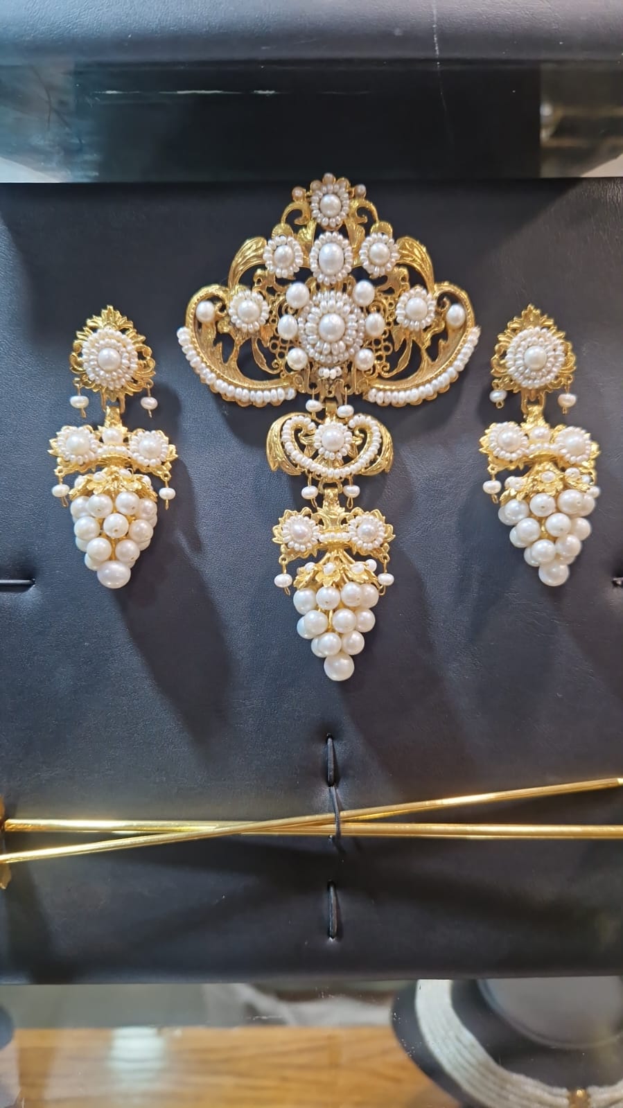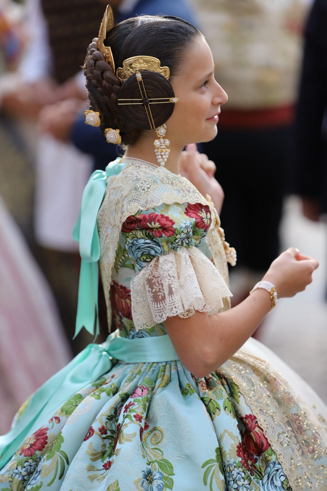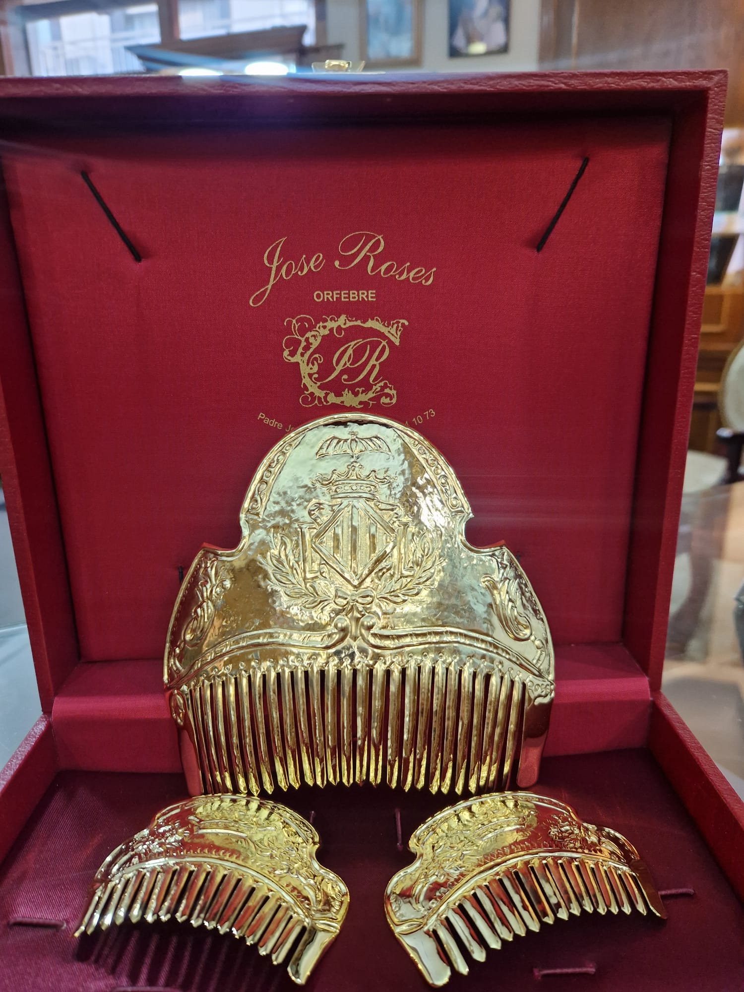 El conjunto se complementa con unas peinetas cinceladas con el escudo de València, elaboradas con gran precisión. El aderezo, de estilo clásico de racimo, pertenece al orfebre José de “Roses”, reconocido por su trabajo artesanal y su capacidad para realzar la elegancia de las falleras sin sobrecargar el conjunto.