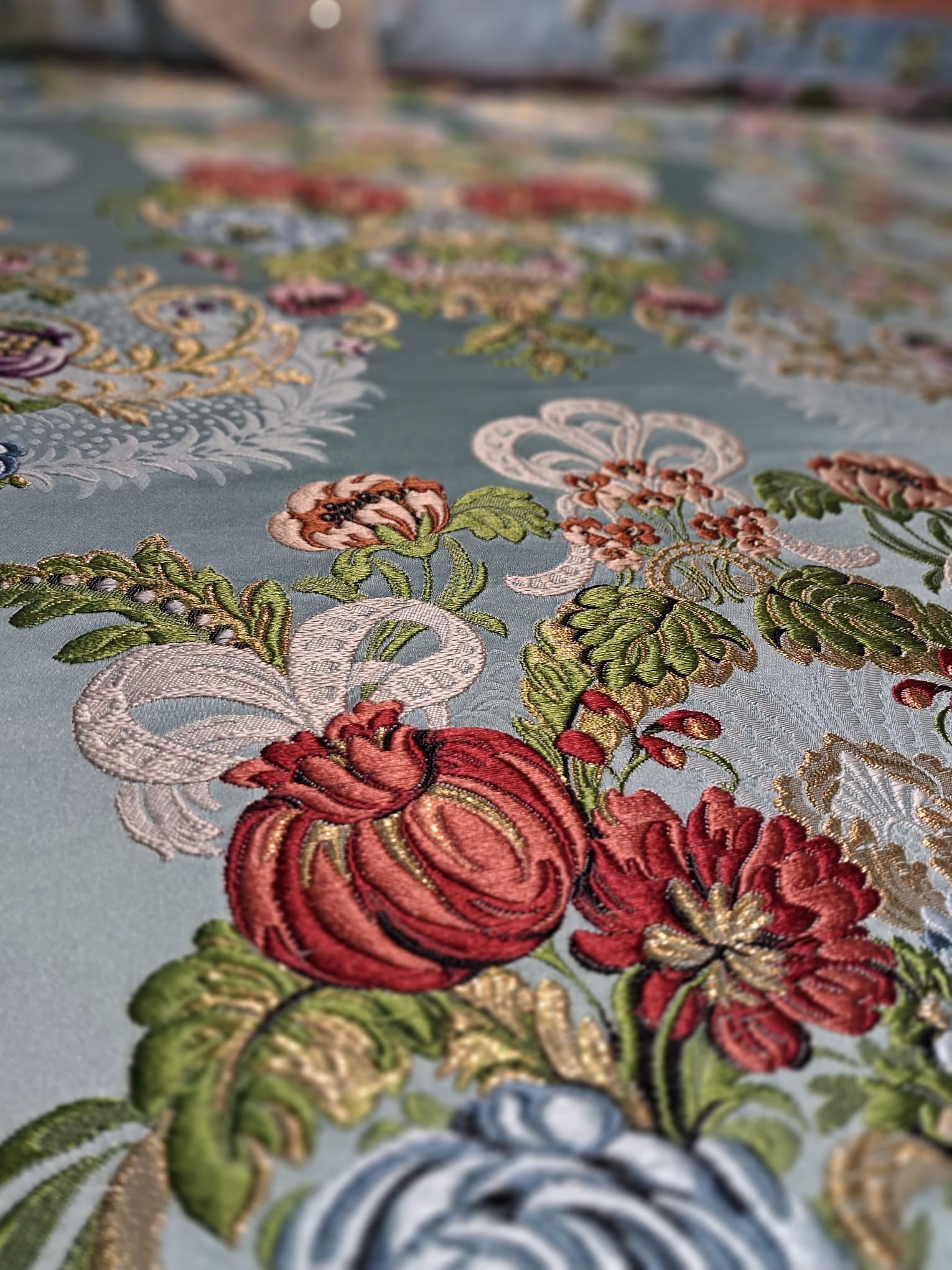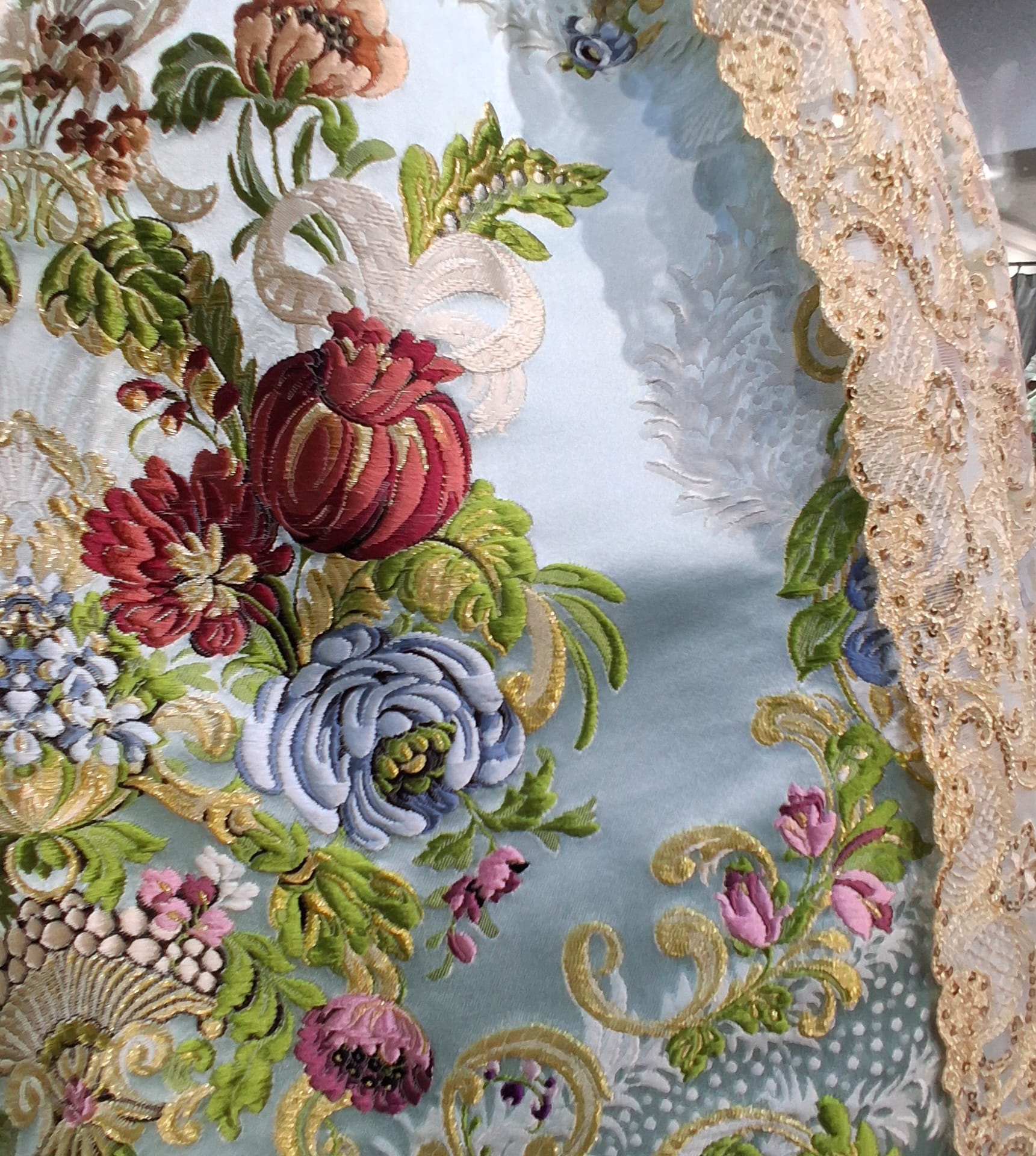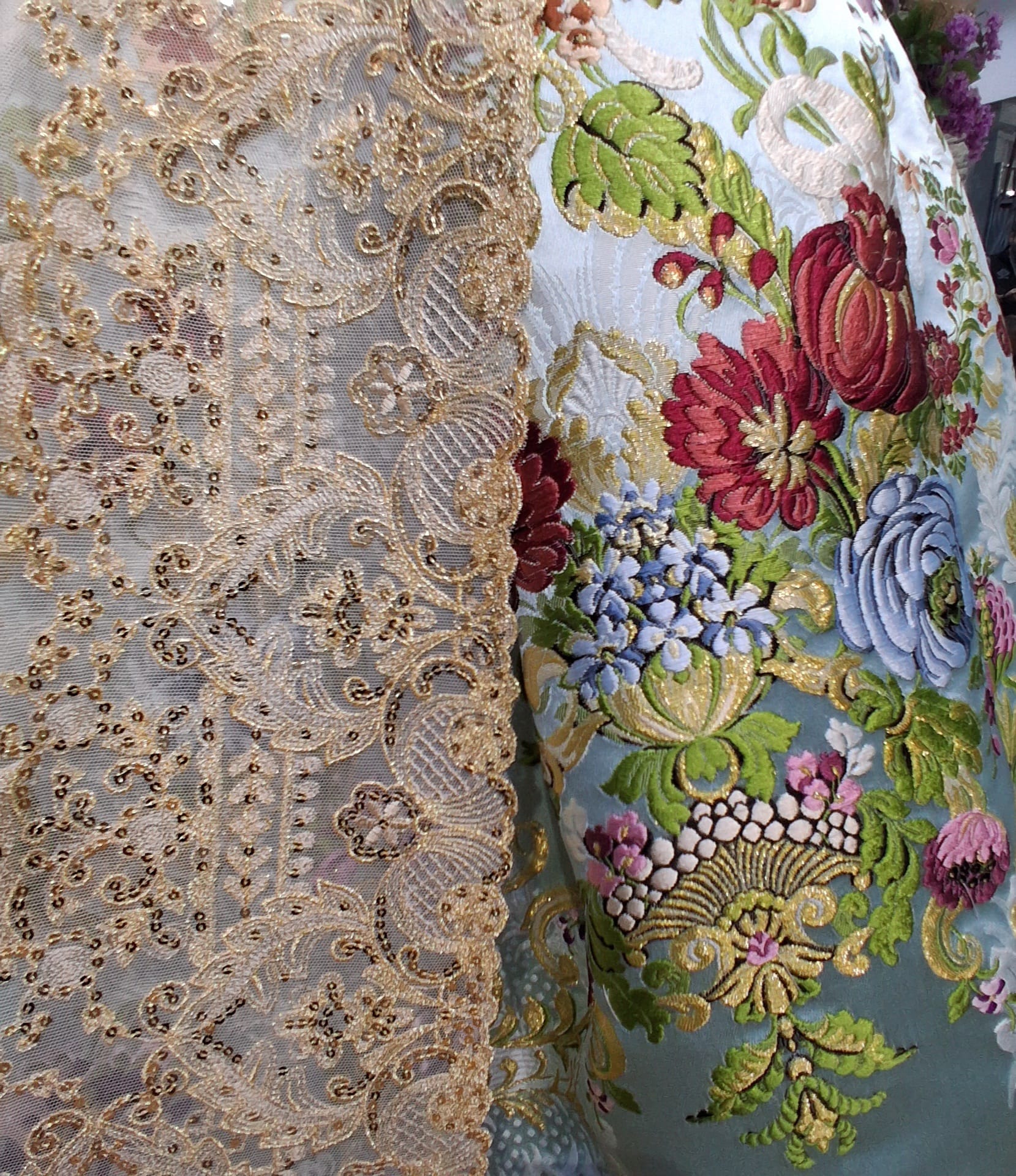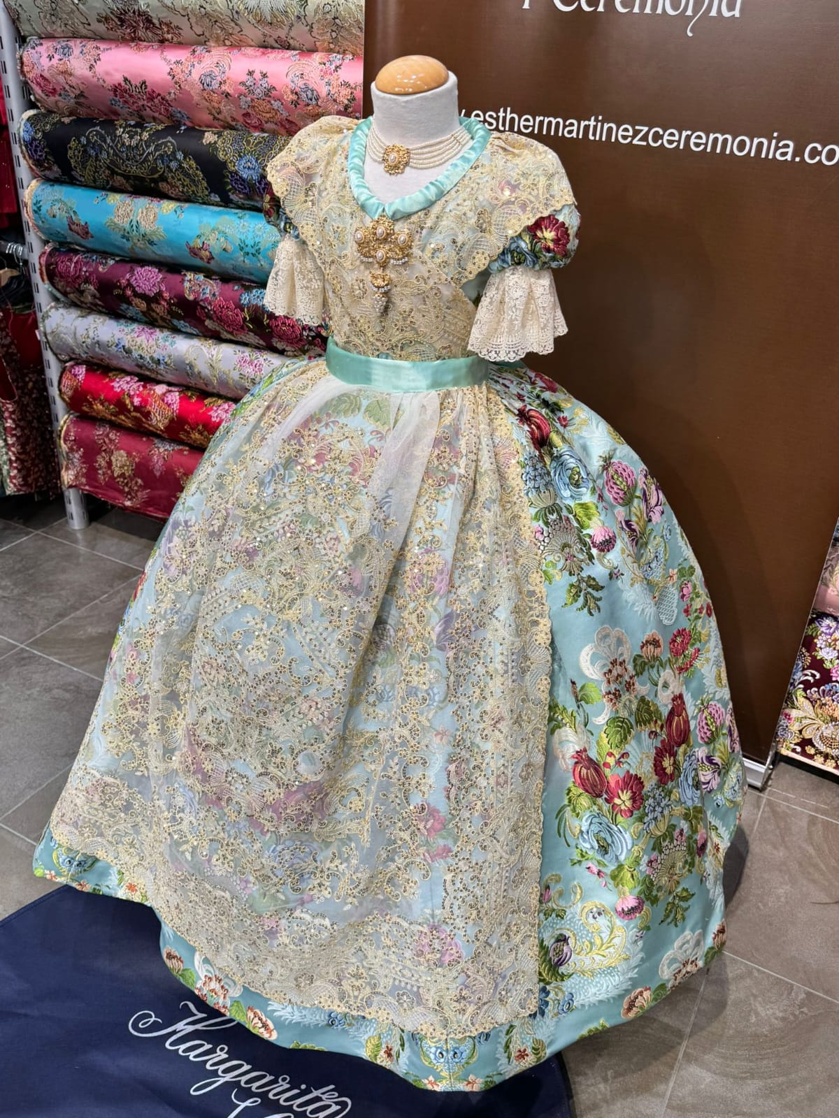 Para esta ocasión se ha seleccionado la seda Quaresma en un tono verde surf, un tejido de Vives y Marí que destaca por la riqueza de su dibujo. El diseño incluye granadas, lazos y palmas, elementos que aportan nobleza, armonía y una belleza muy característica a esta pieza textil. El resultado es un traje equilibrado, luminoso y perfecto para una Fallera Mayor Infantil en un acto de alto protocolo.
