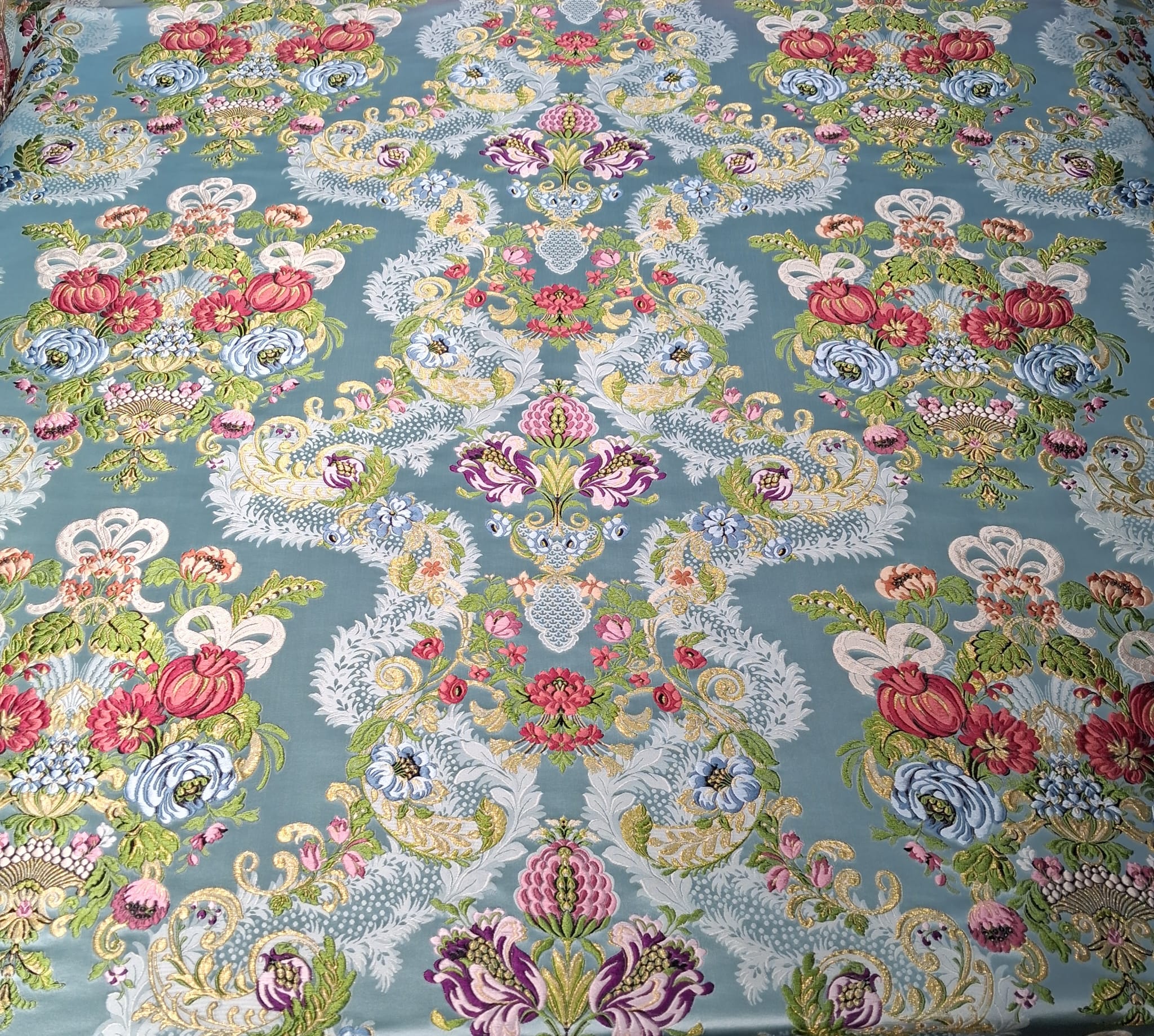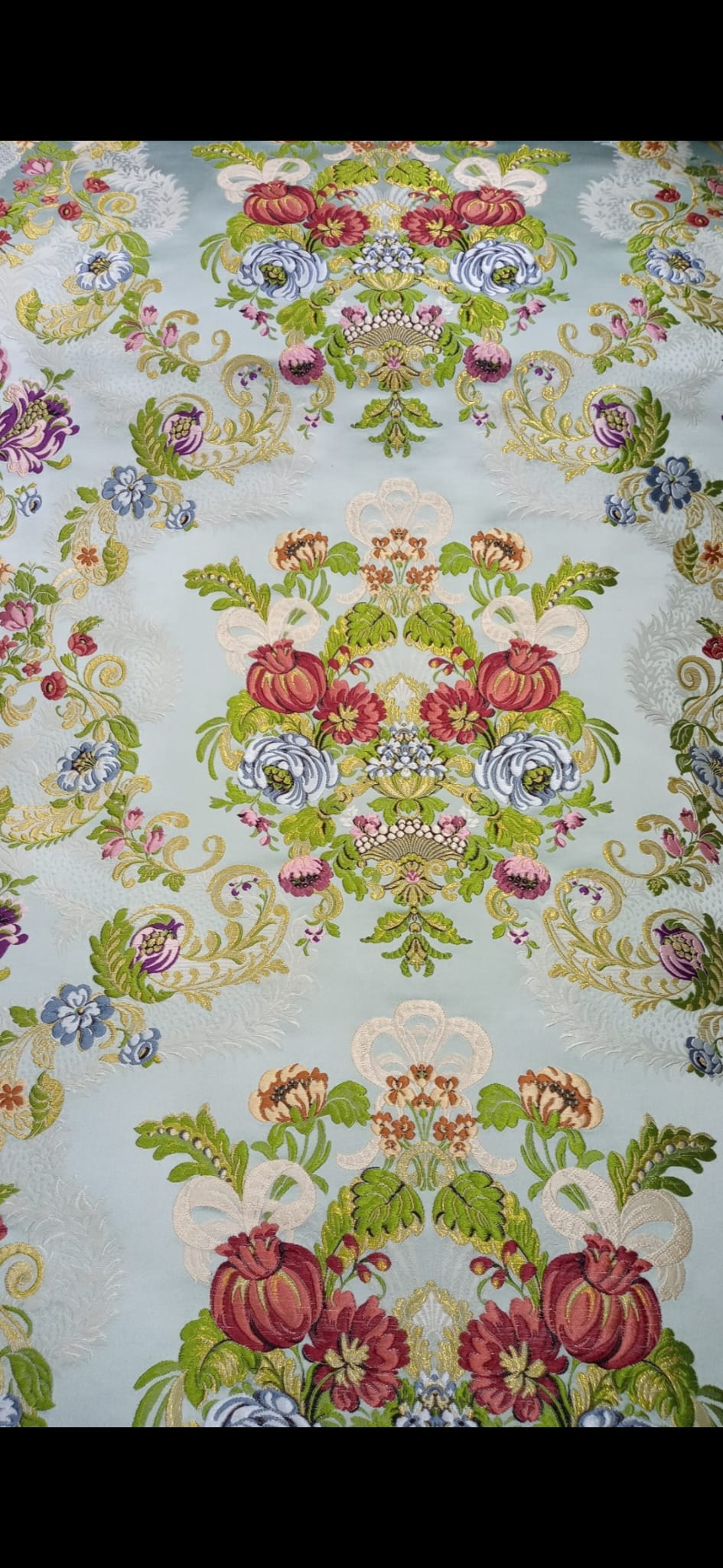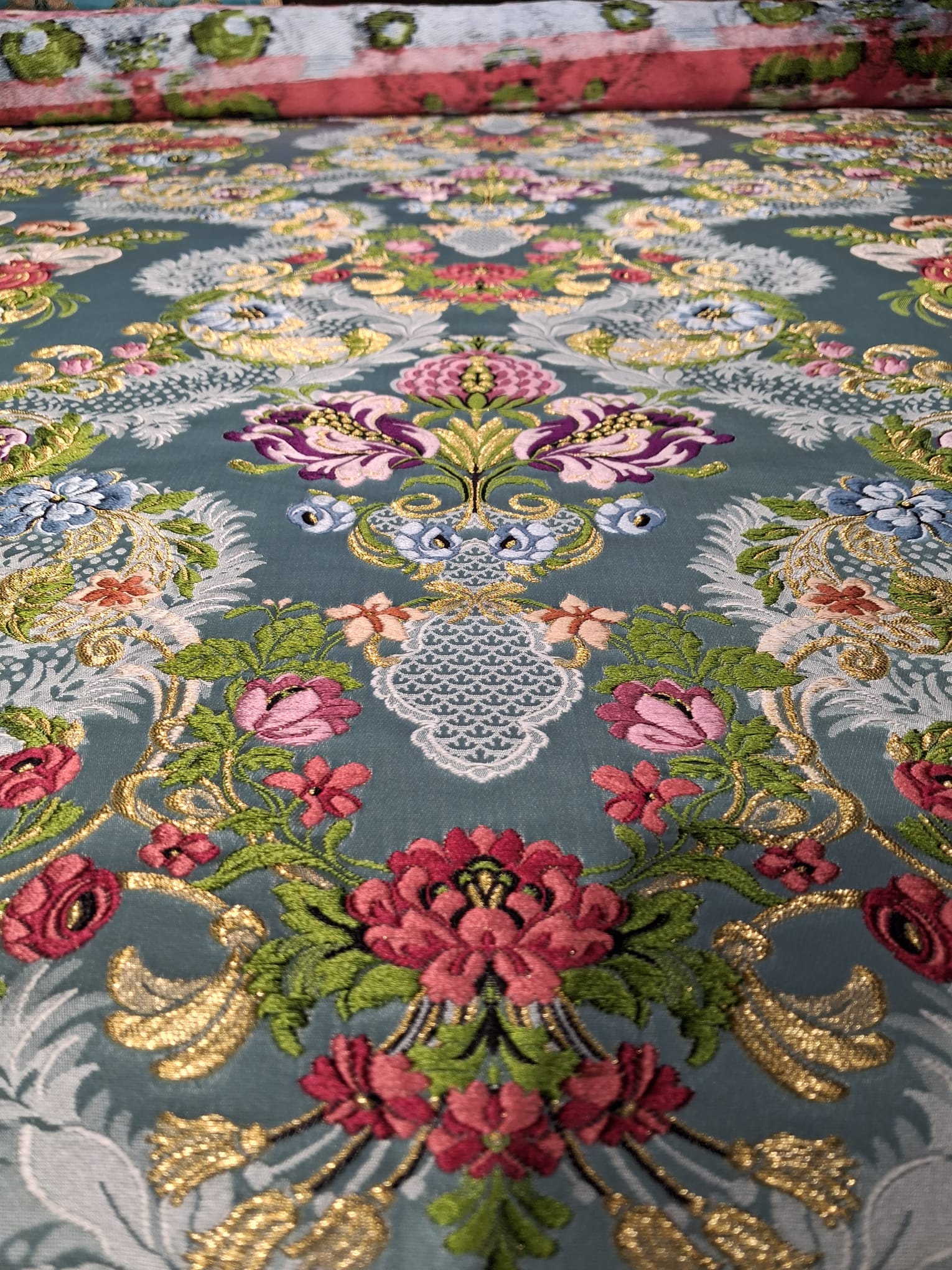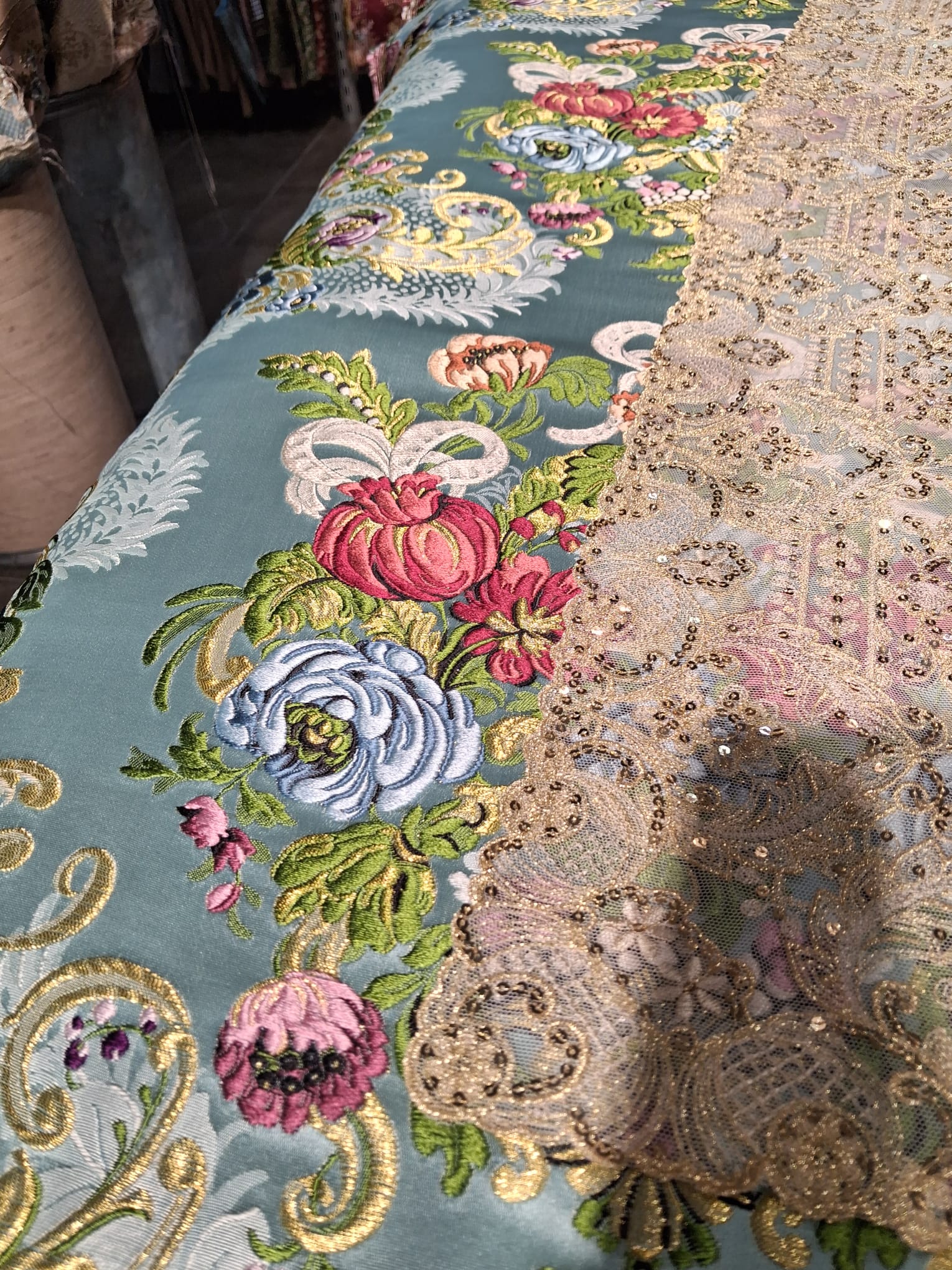 Para esta ocasión se ha seleccionado la seda Quaresma en un tono verde surf, un tejido de Vives y Marí que destaca por la riqueza de su dibujo. El diseño incluye granadas, lazos y palmas, elementos que aportan nobleza, armonía y una belleza muy característica a esta pieza textil. El resultado es un traje equilibrado, luminoso y perfecto para una Fallera Mayor Infantil en un acto de alto protocolo.