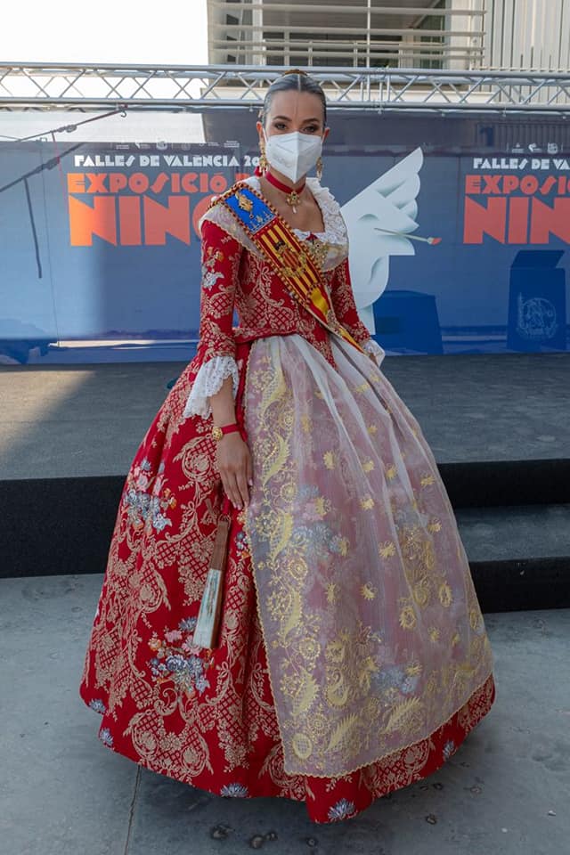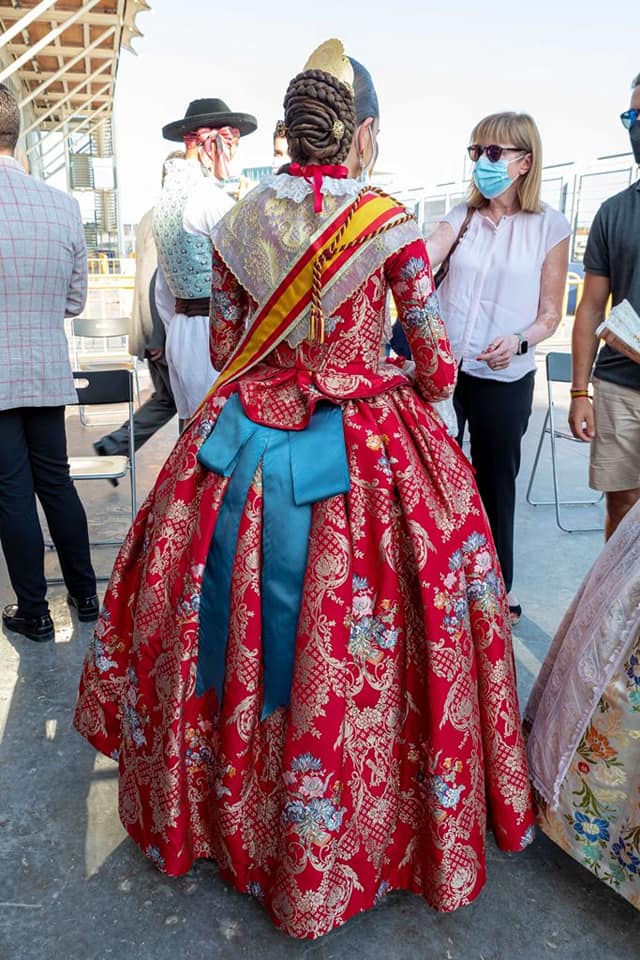 Consuelo Llobell ha estrenado un traje que no ha dejado indiferente a nadie, se trata de una seda en fondo rojo Valentino, con el nombre Imperial del telar Compañía Valenciana de la Seda, acompañado por las manteletas bordadas a mano de la firma Teresa Albuixech. Los zapatos de Solepiel valencia, y puntillas antiguas de la colección privada de Ernesto.