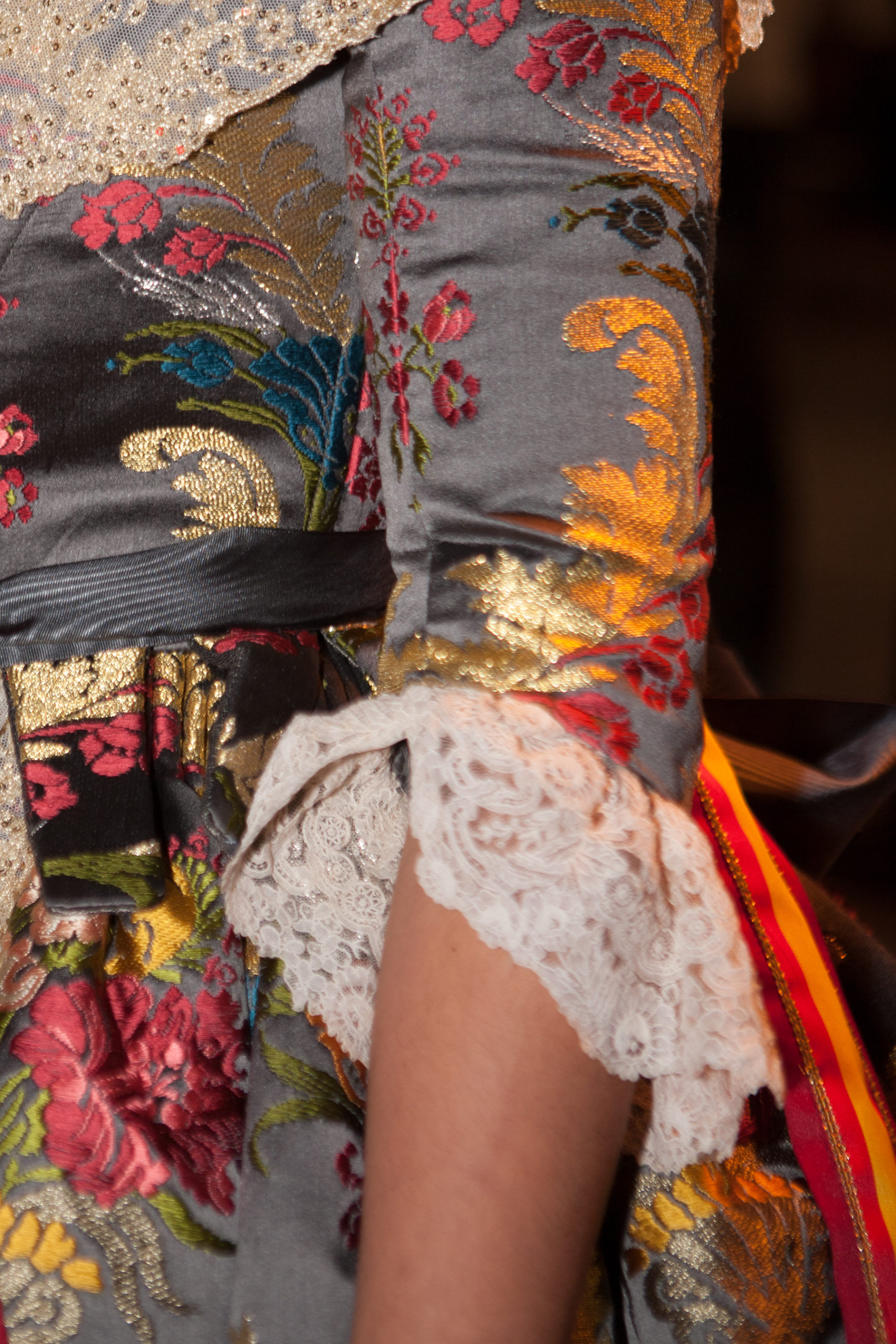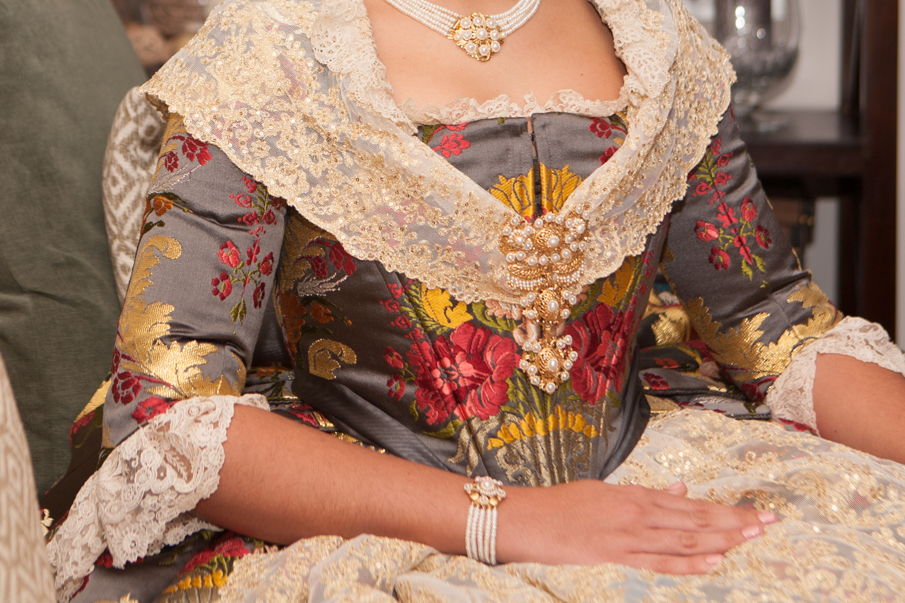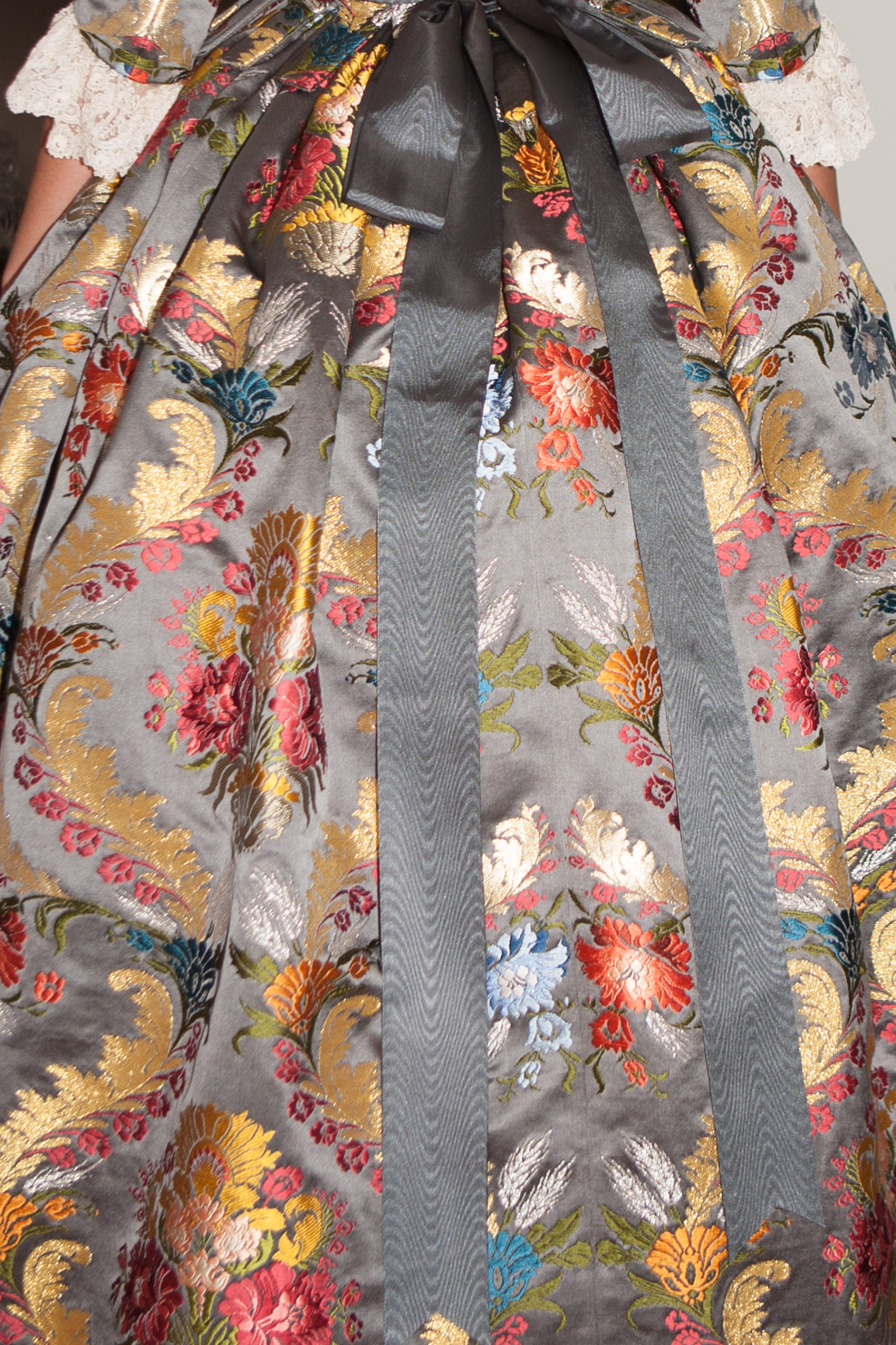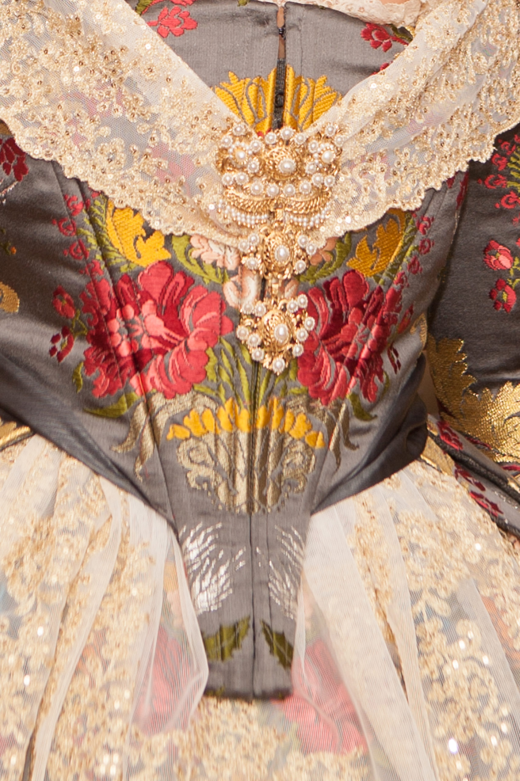 Tejido por Compañía Valenciana de la seda, y con los sonsejos de Maria Luisa Llorens, gran amiga de la familia, la confección a cargo de ‘En hilos de seda’ de José Polit.El elegantísimo traje de Marta con un fondo gris antracita y para contrastar con el oscuro del fondo, se coloreó para el centro con amarillo antiguo, tonos granates combinados con rosas nude y beiges y para las ramas en verde musgo.