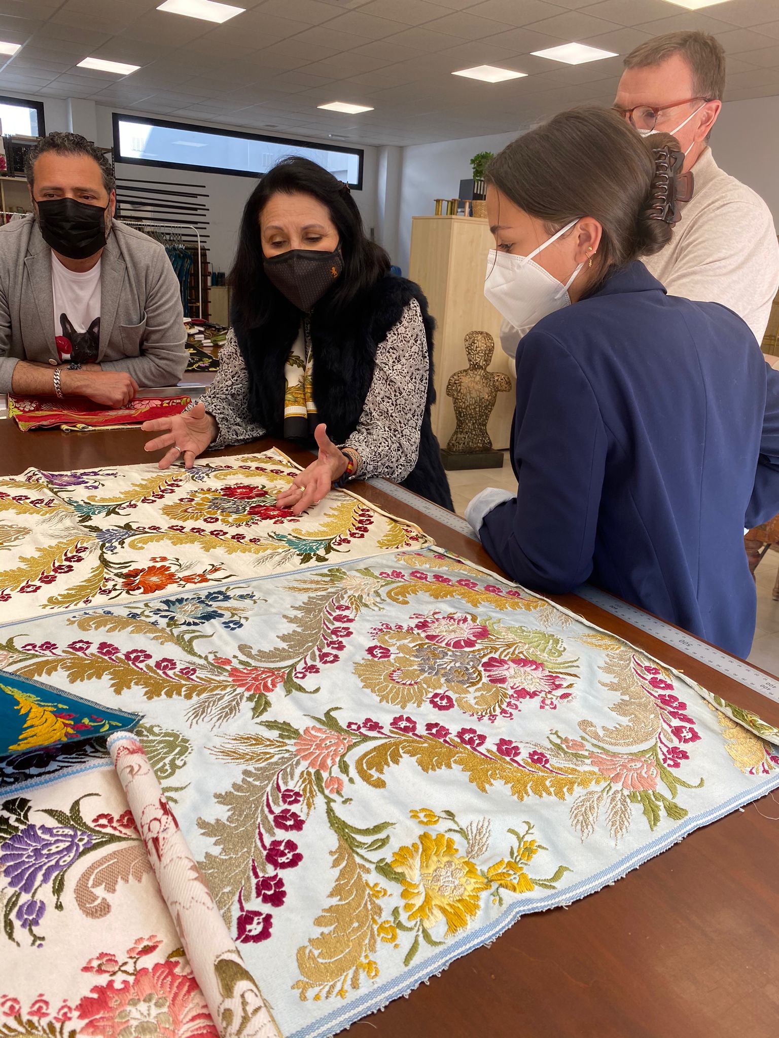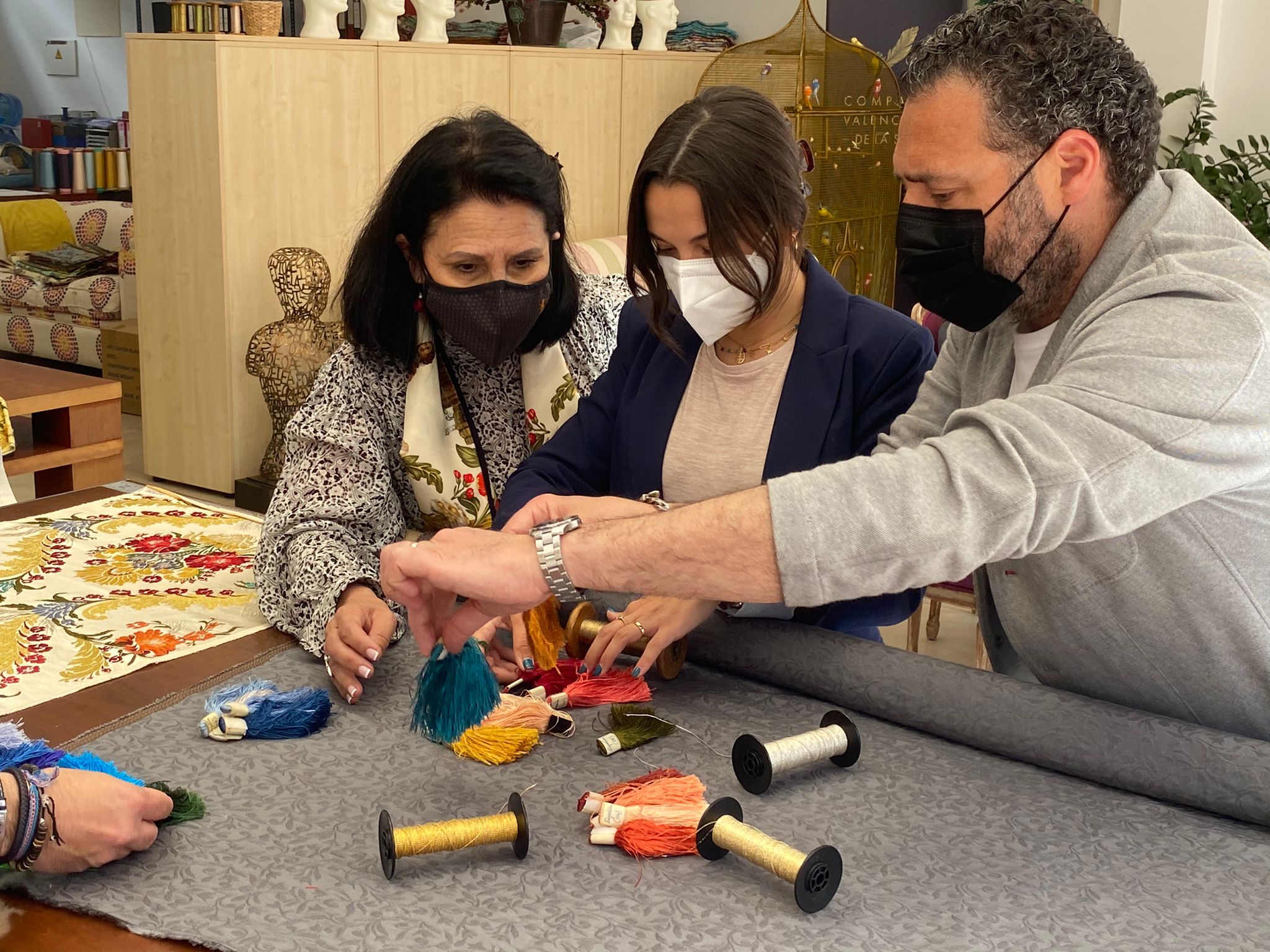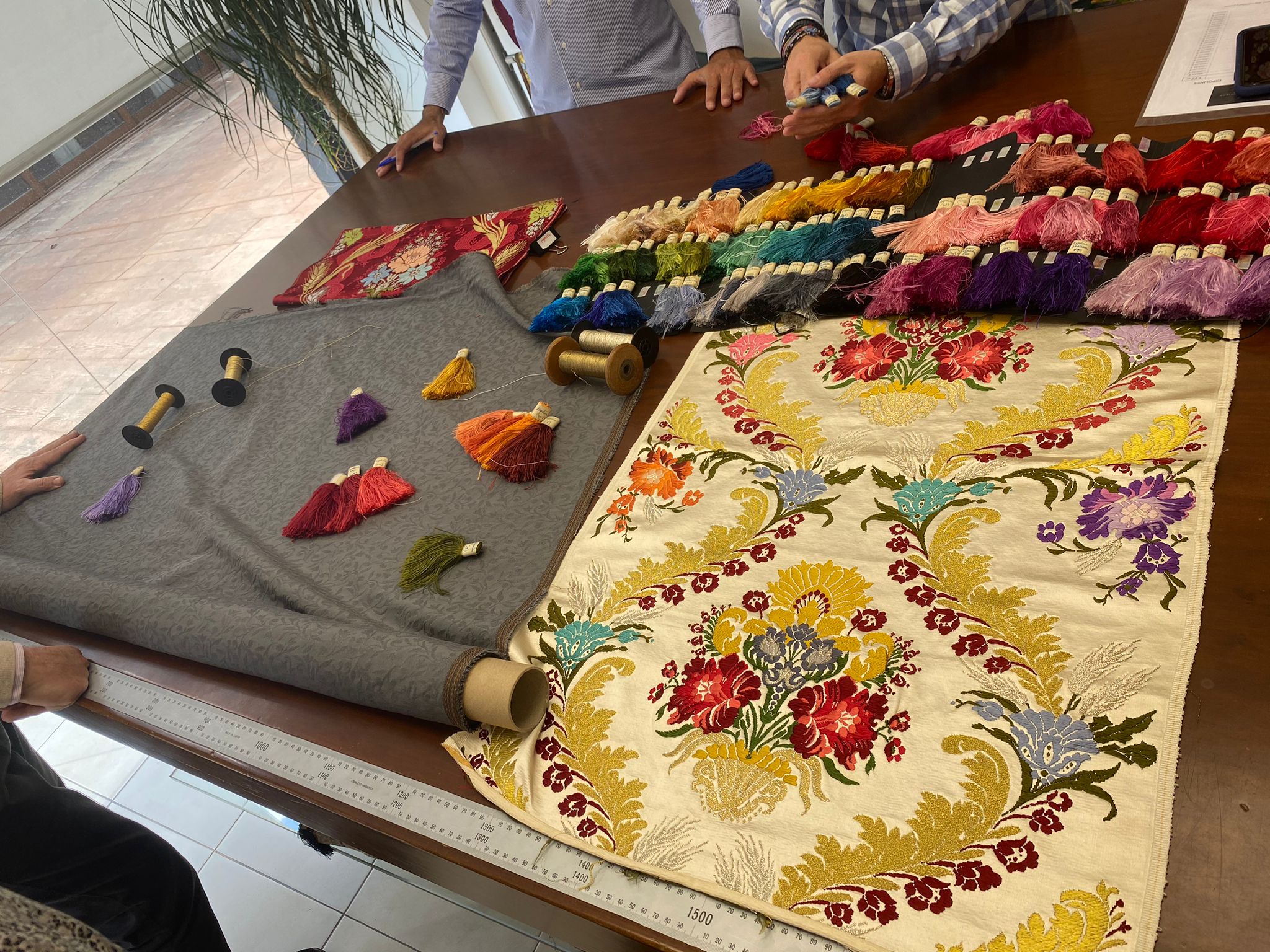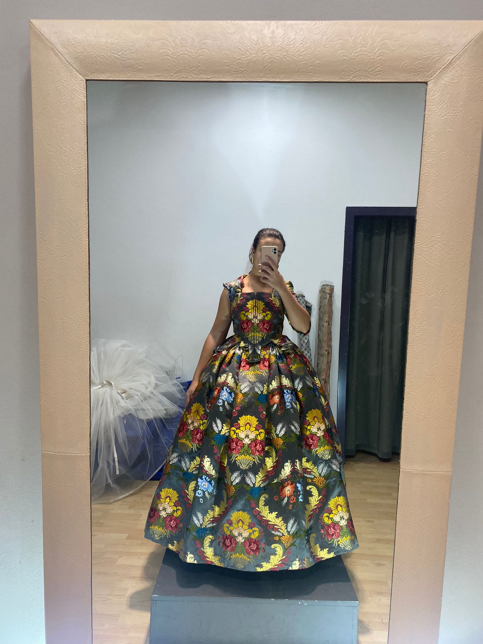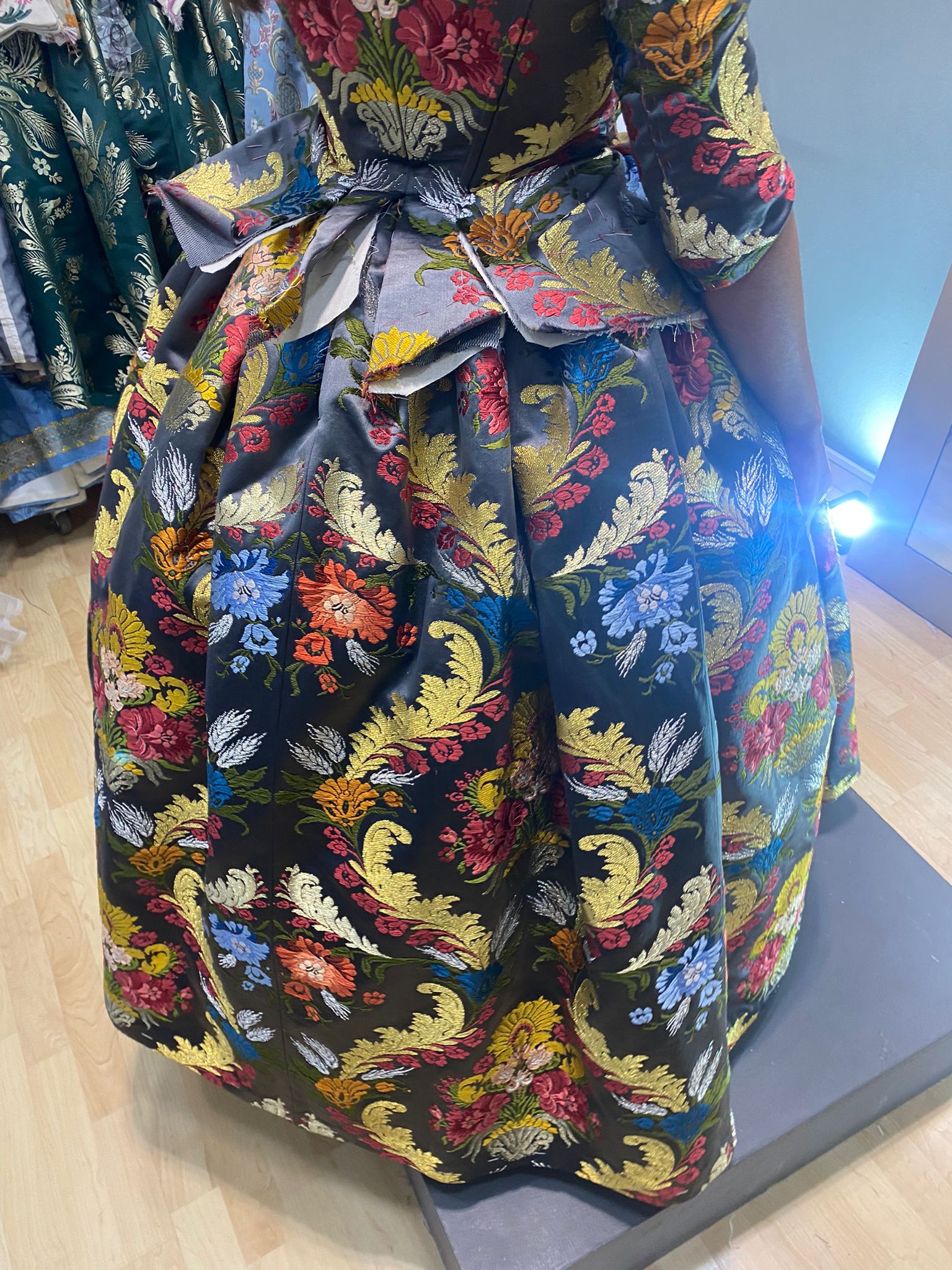 Tejido por Compañía Valenciana de la seda, y con los sonsejos de Maria Luisa Llorens, gran amiga de la familia, la confección a cargo de ‘En hilos de seda’ de José Polit.El elegantísimo traje de Marta con un fondo gris antracita y para contrastar con el oscuro del fondo, se coloreó para el centro con amarillo antiguo, tonos granates combinados con rosas nude y beiges y para las ramas en verde musgo.