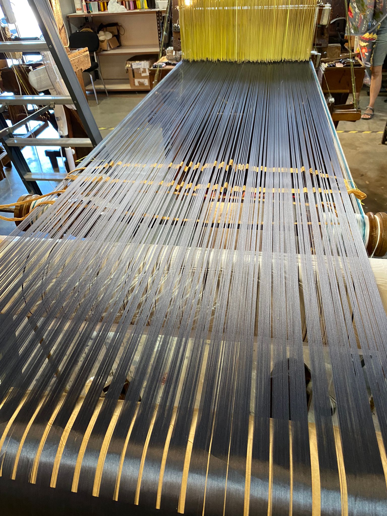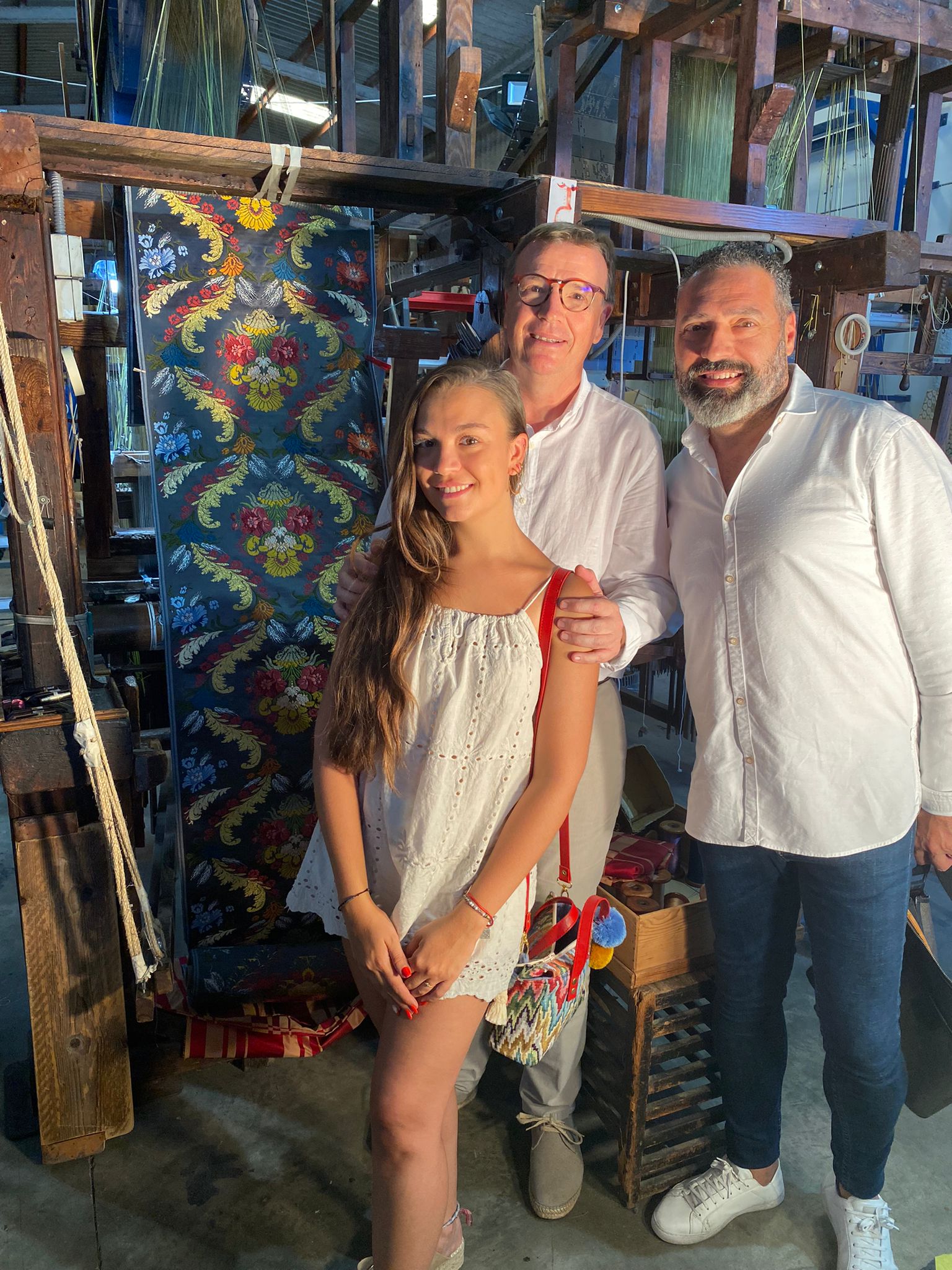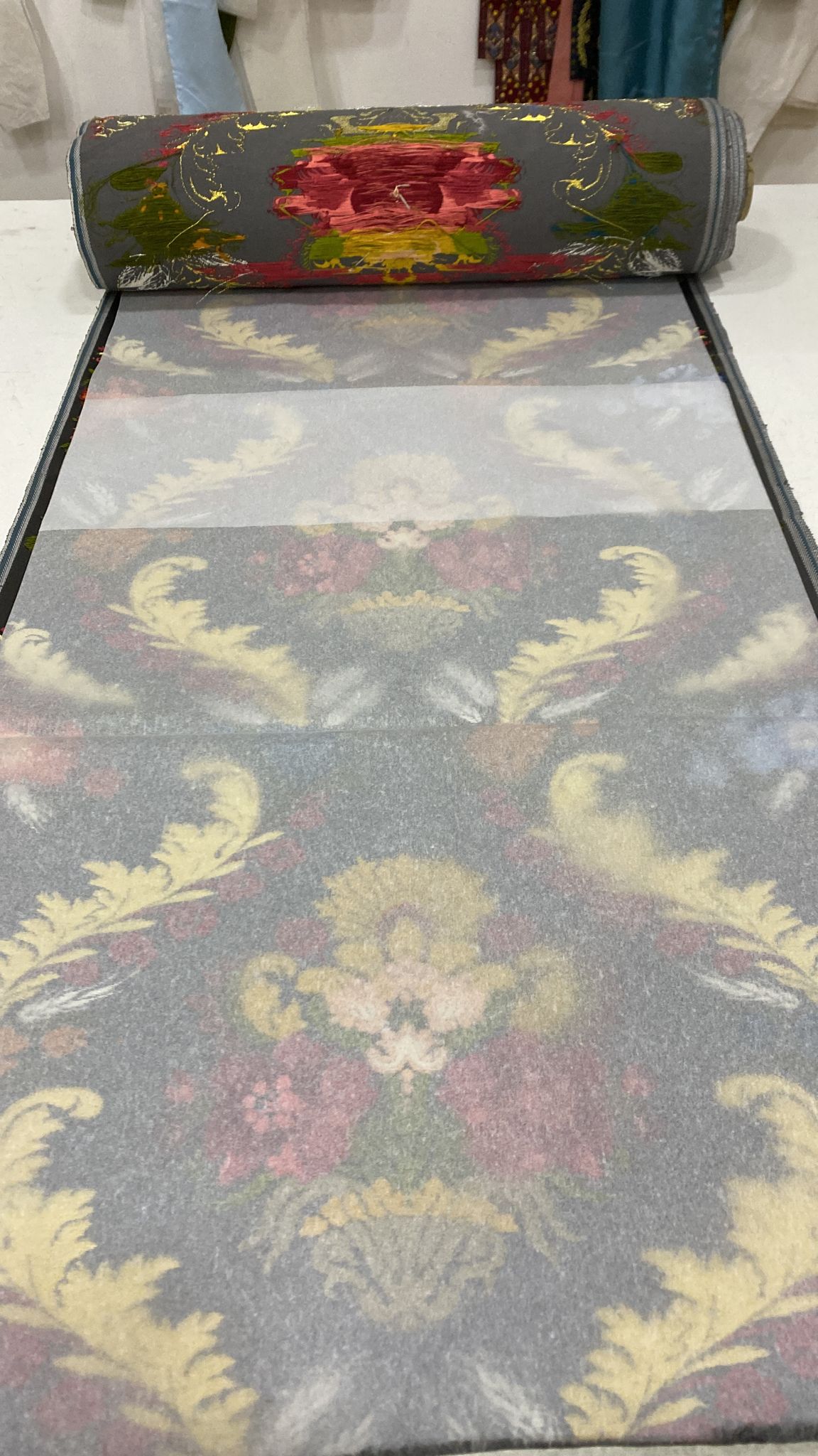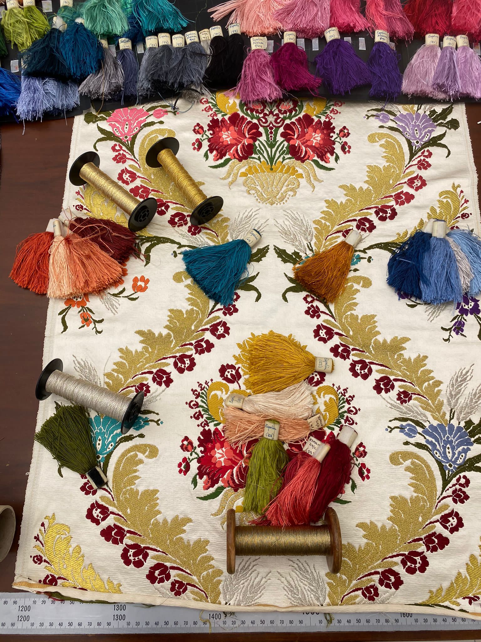 Tejido por Compañía Valenciana de la seda, y con los sonsejos de Maria Luisa Llorens, gran amiga de la familia, la confección a cargo de ‘En hilos de seda’ de José Polit.El elegantísimo traje de Marta con un fondo gris antracita y para contrastar con el oscuro del fondo, se coloreó para el centro con amarillo antiguo, tonos granates combinados con rosas nude y beiges y para las ramas en verde musgo.