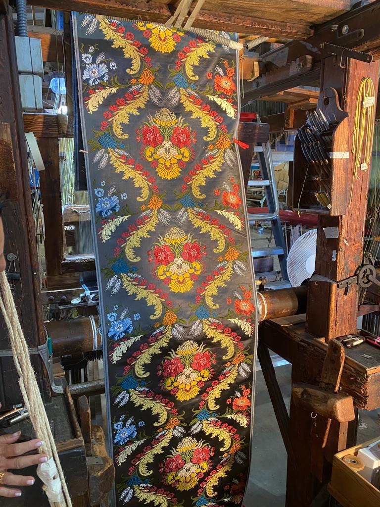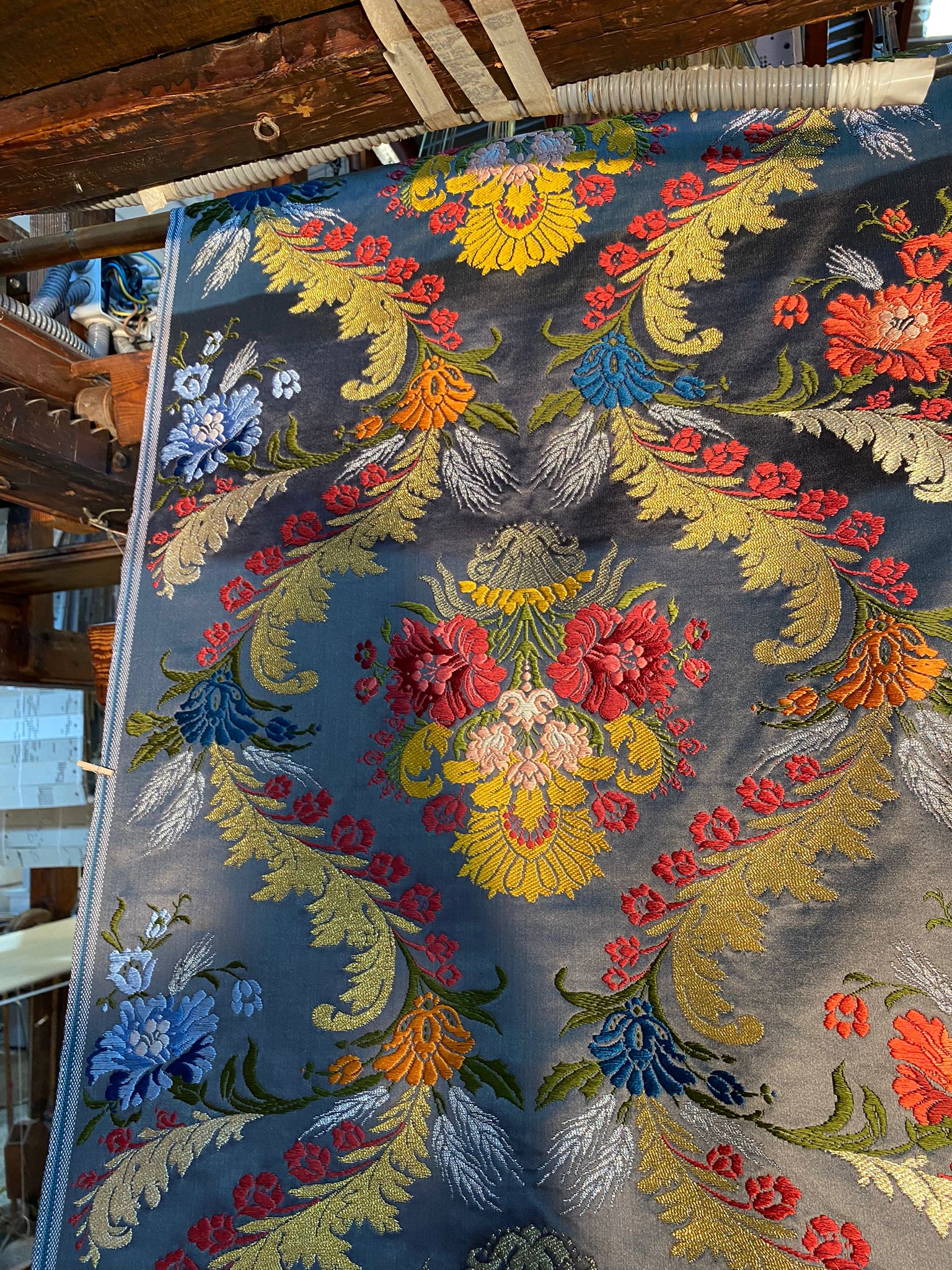 Para las flores de la guirnalda los caldera y azul petróleo. Cuatro metales completan este espolín que lo hacen tan espectacular: plata, oro, oro brescado y oro rosa.