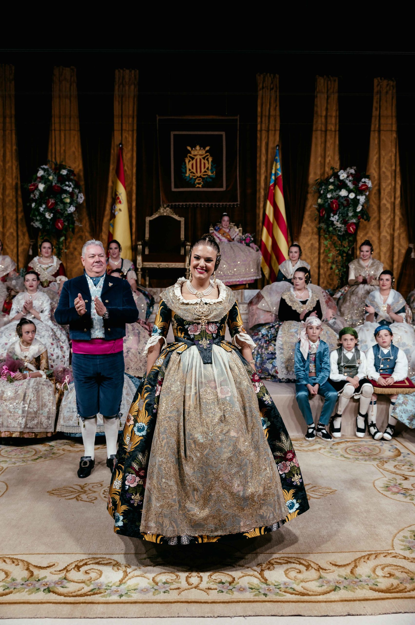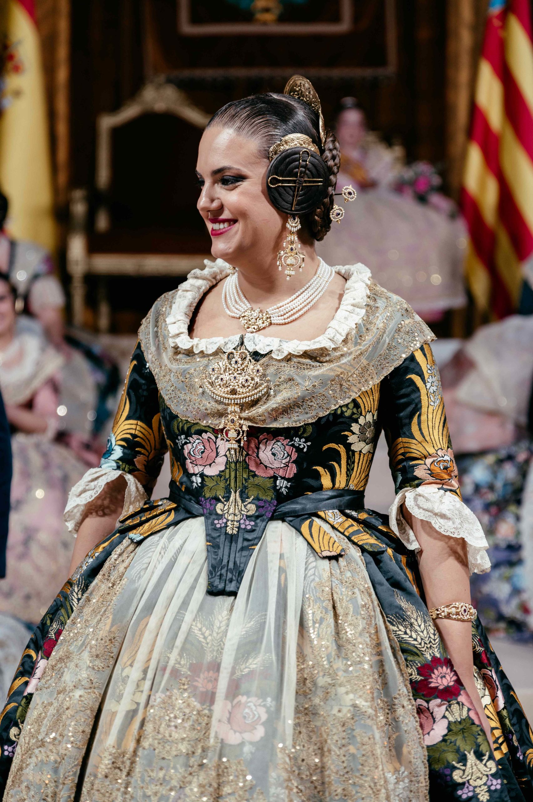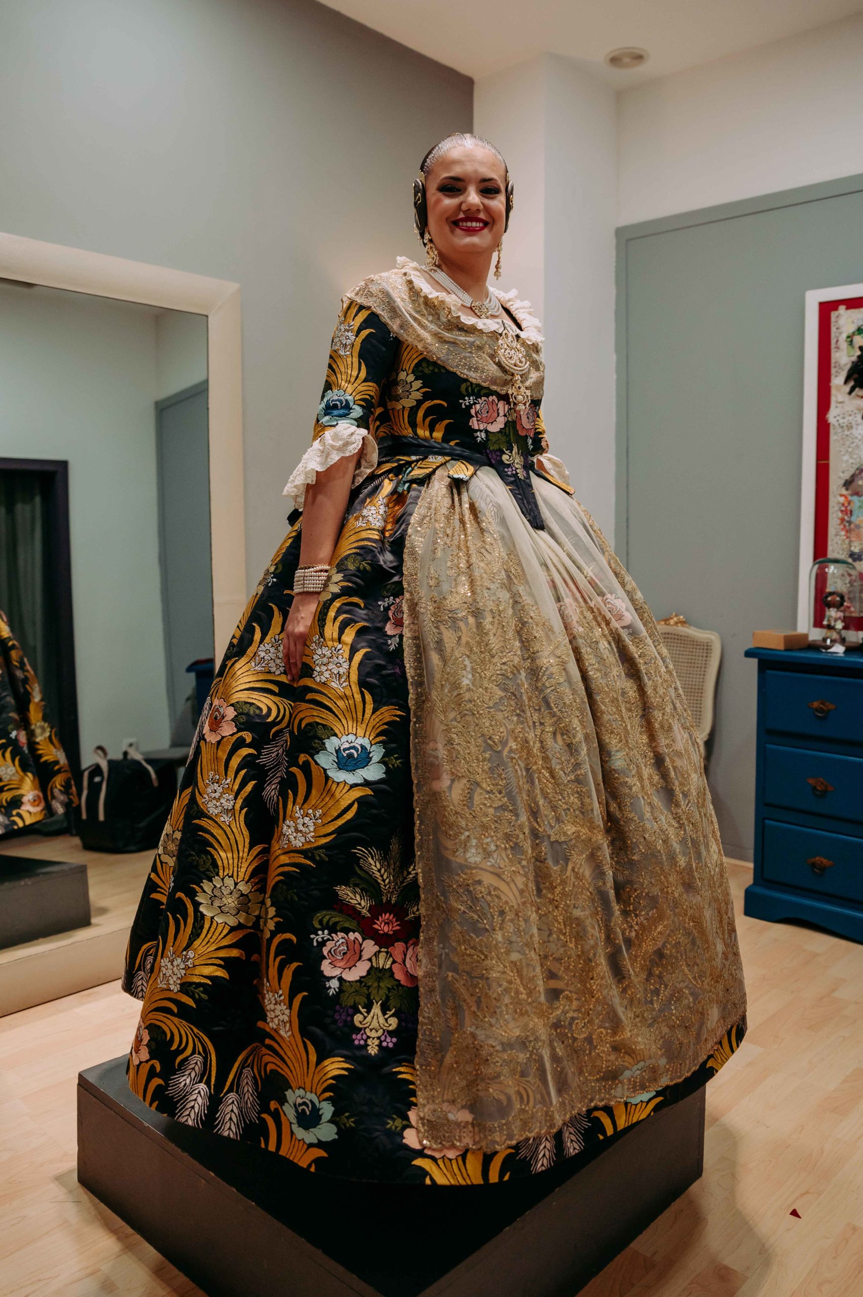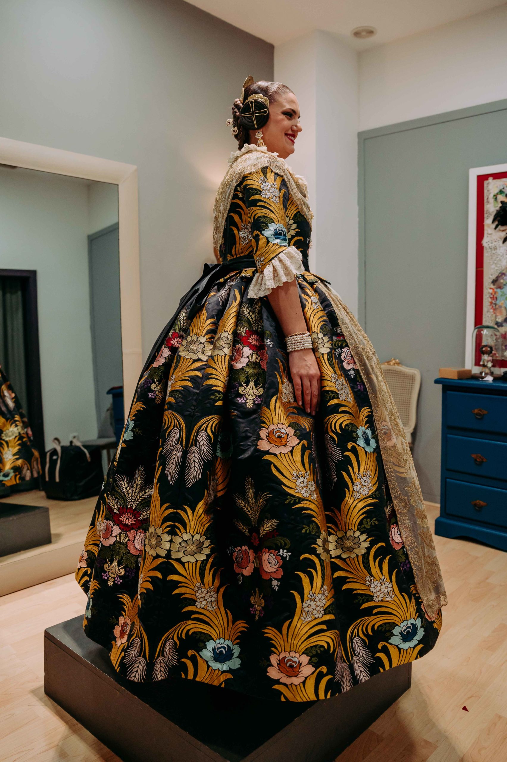 No era la primera vez que Dolo impactaba con su indumentaria, el pasado sábado 11 de noviembre en el casal de su comisión Espartero Ramón y Cajal “El Nostre”, fue proclamada como Fallera Mayor 2024, y para este acto lució otro espectacular espolín, un Valencia familiar.