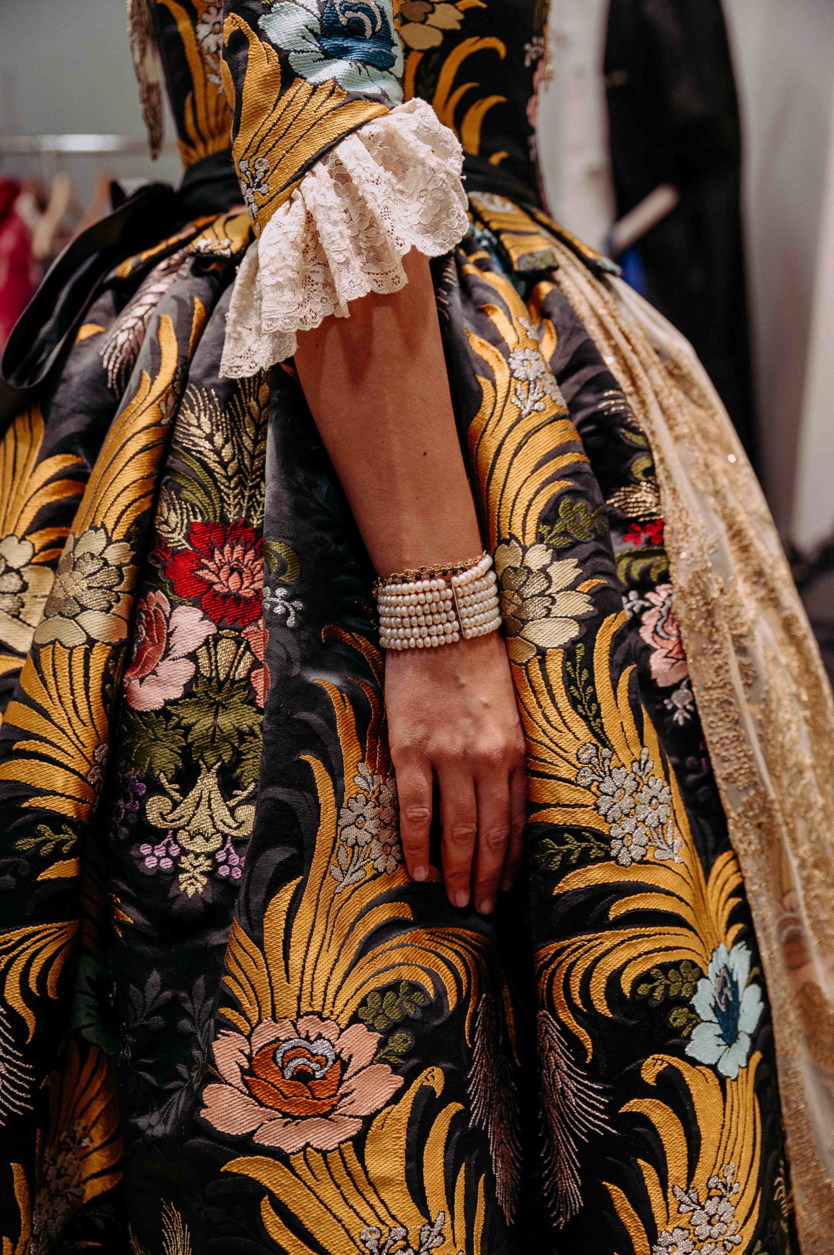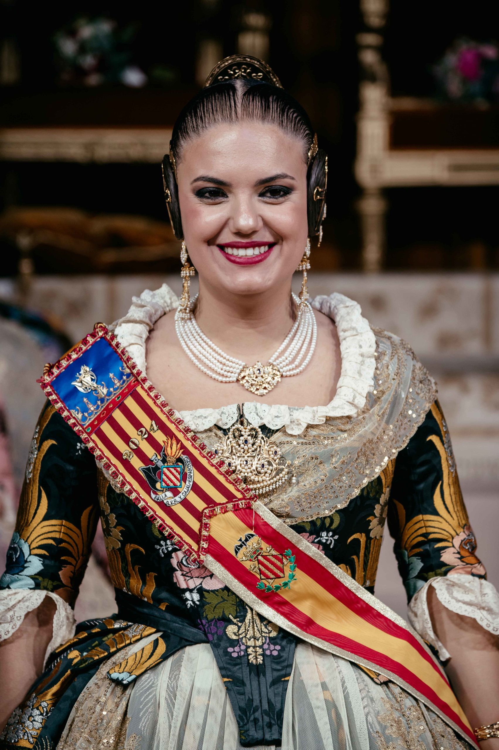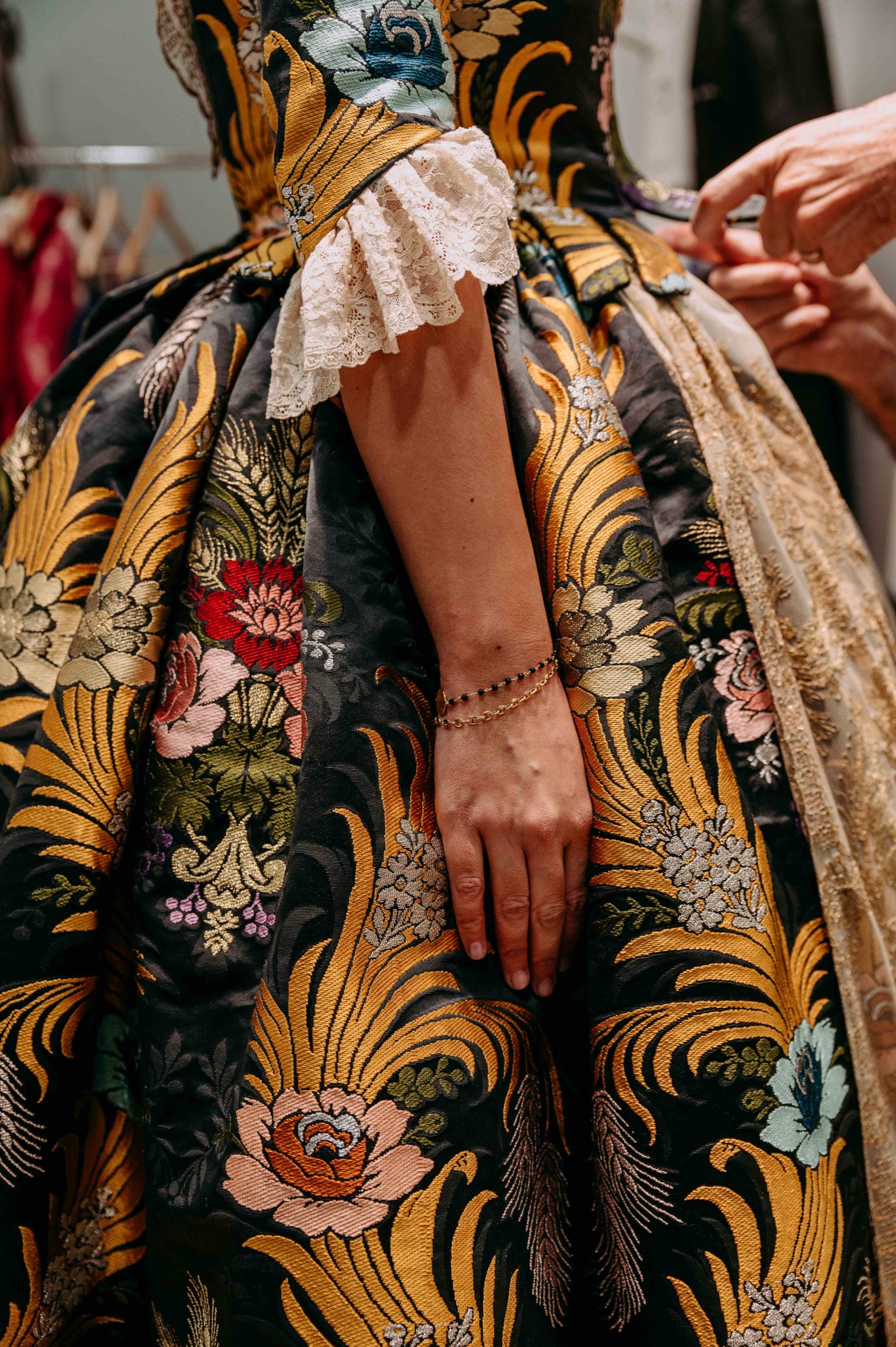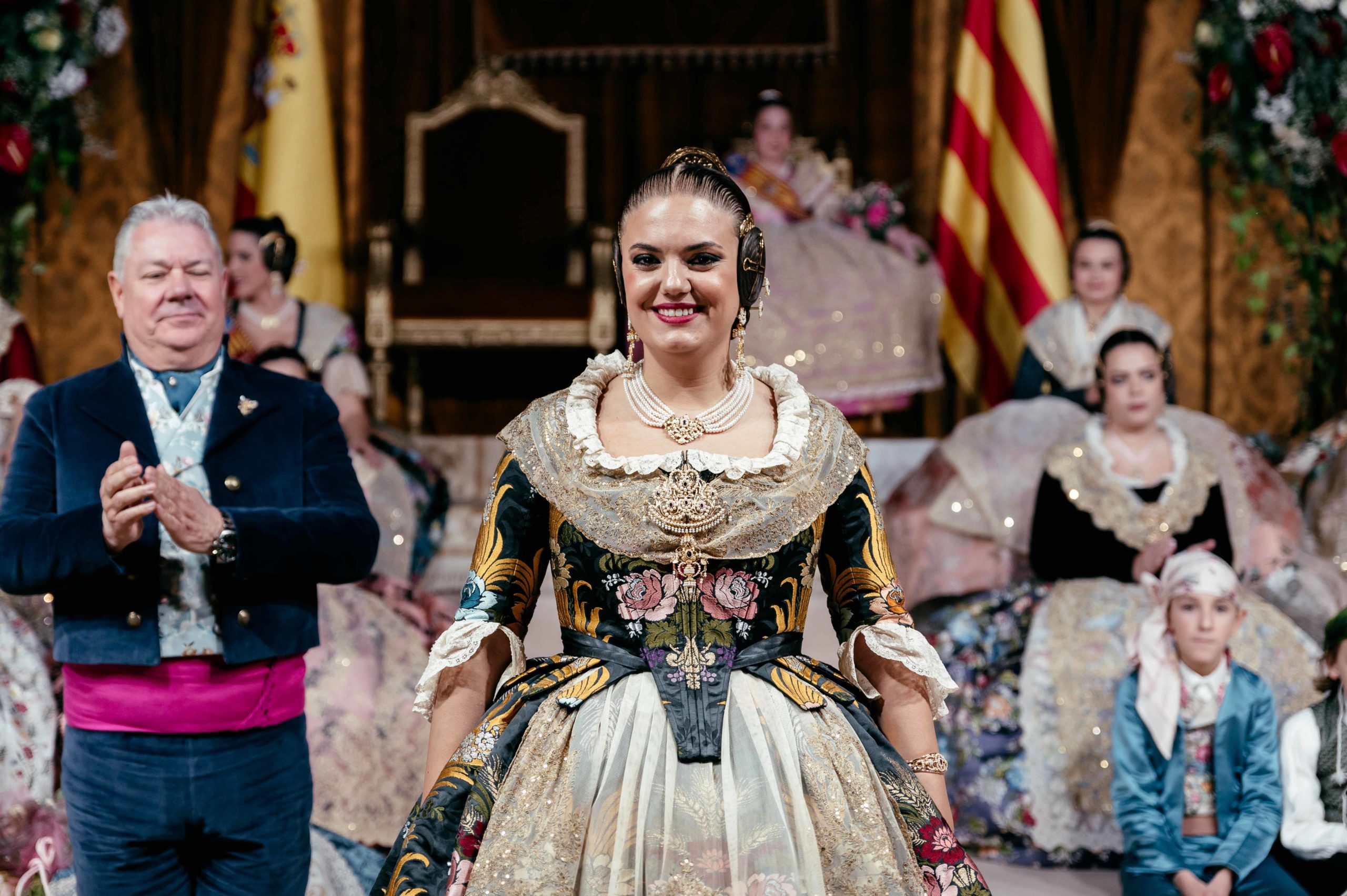 No era la primera vez que Dolo impactaba con su indumentaria, el pasado sábado 11 de noviembre en el casal de su comisión Espartero Ramón y Cajal “El Nostre”, fue proclamada como Fallera Mayor 2024, y para este acto lució otro espectacular espolín, un Valencia familiar.