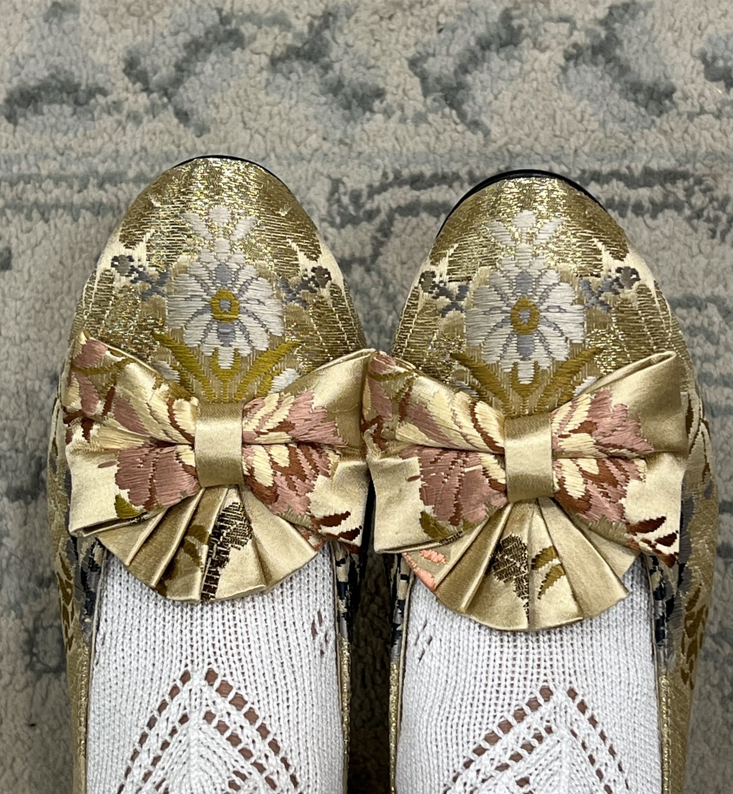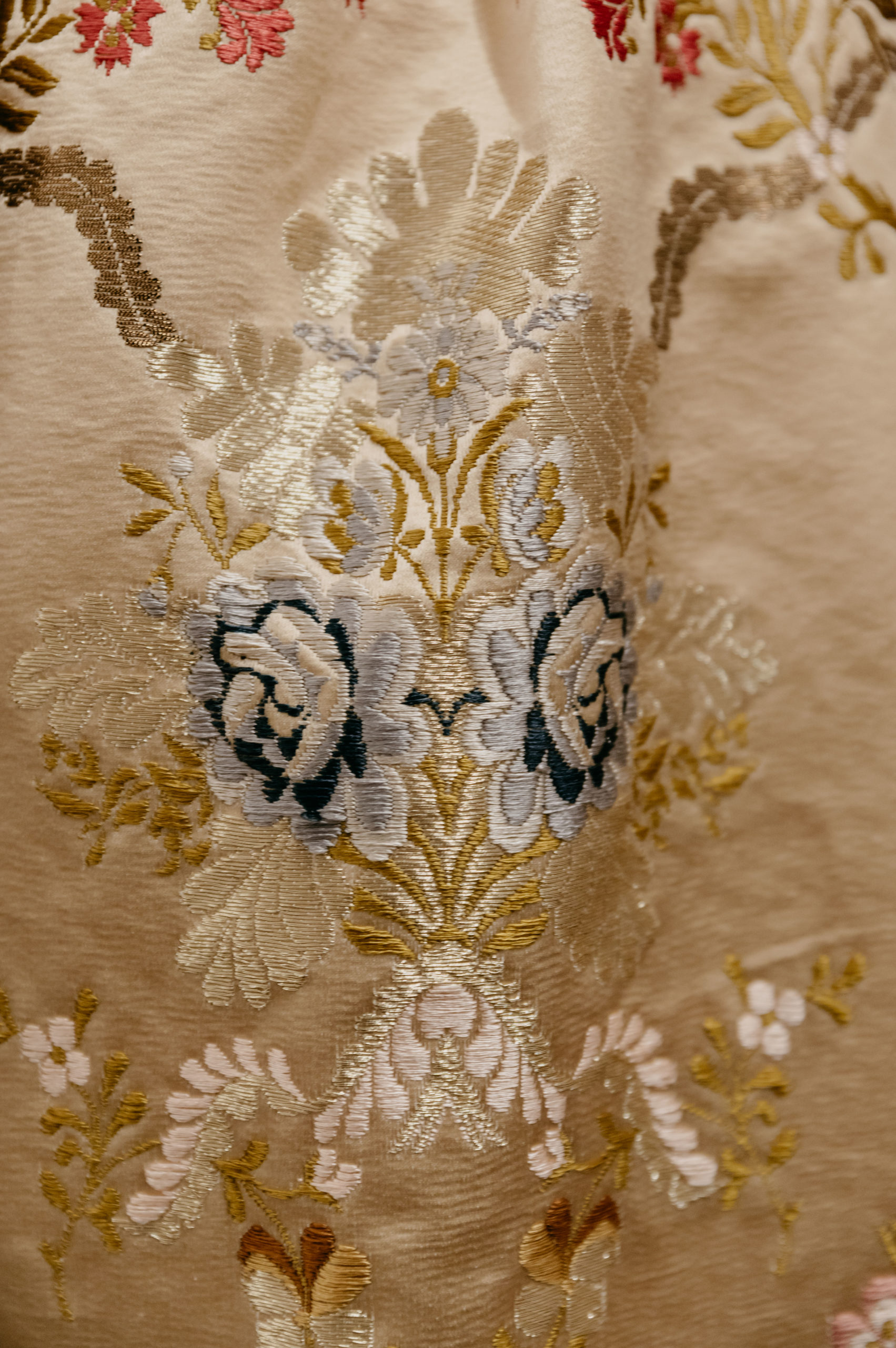 El color del  fondo en champagne y combinado con colores empolvados muy suaves le da esa antigüedad que el dibujo requiere, sin olvidarnos de su riqueza. Sonia lo ha completado con  metales oro y oro viejo que hacen de este traje una joya para toda la vida.
