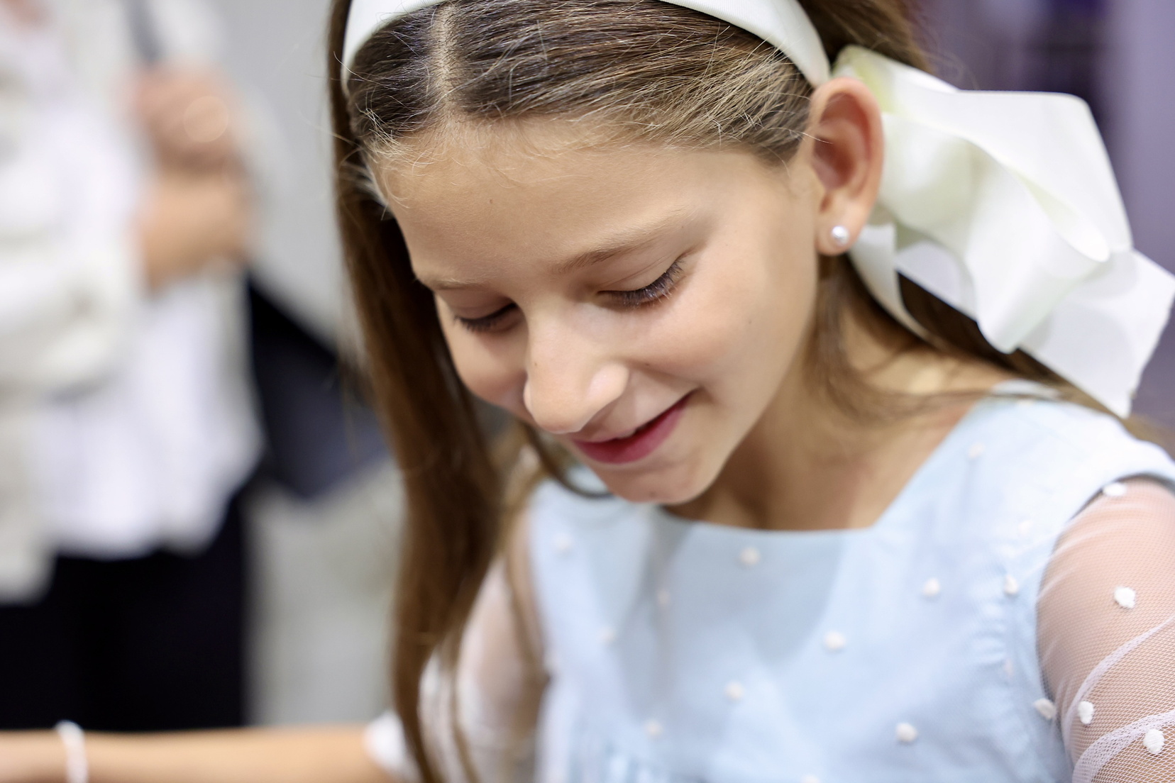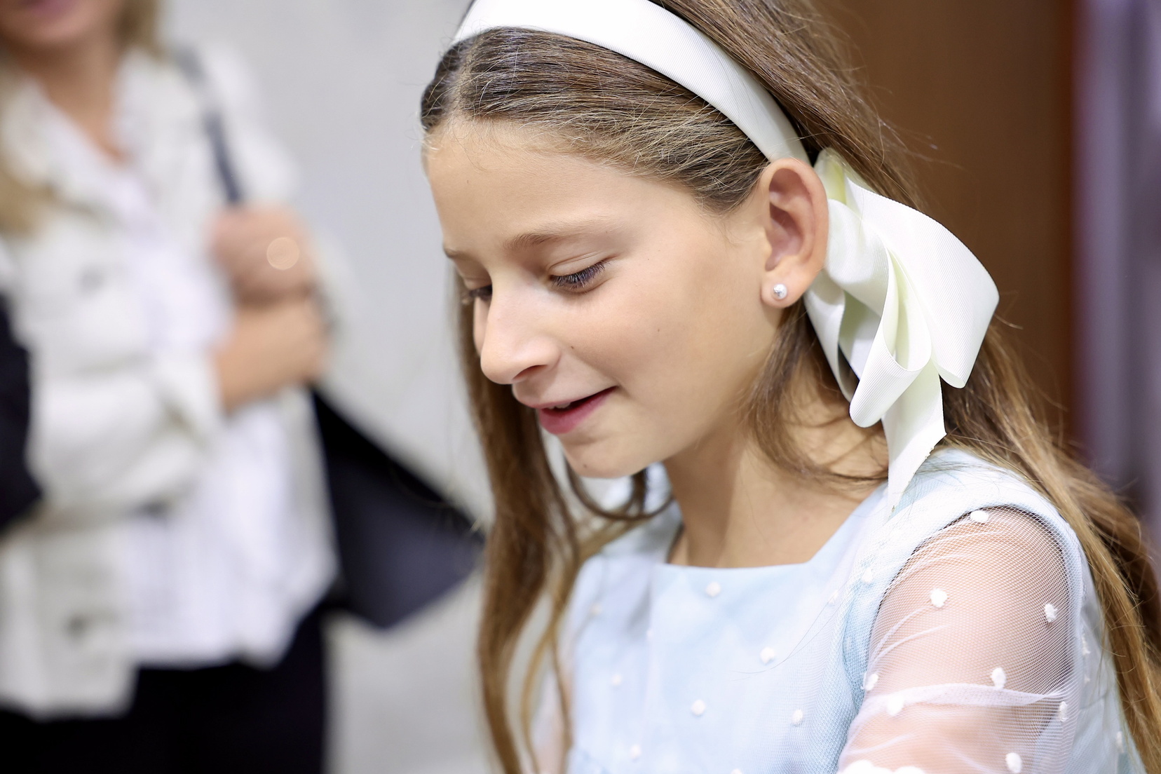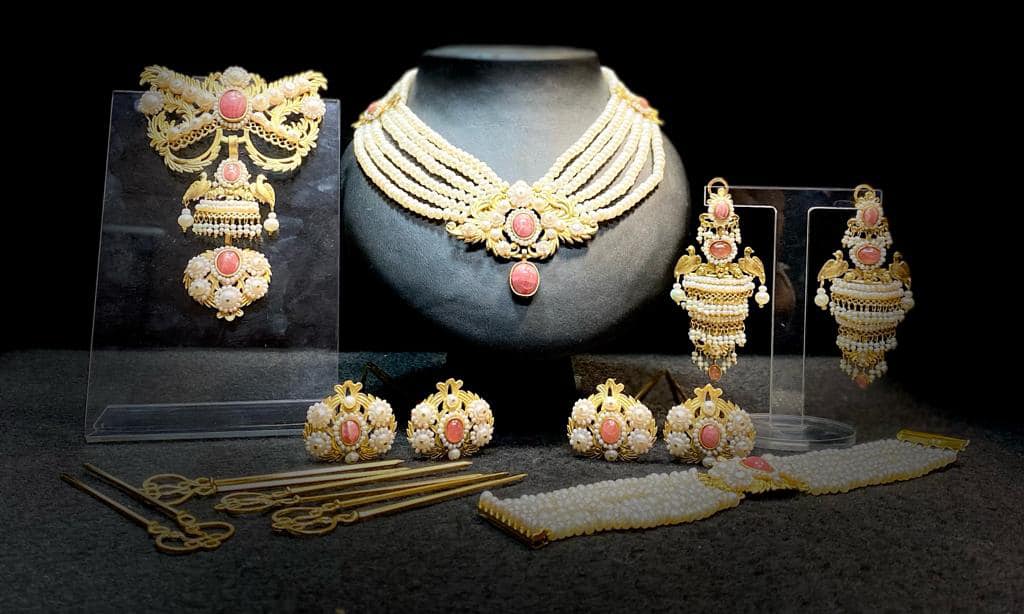 Las manteletas son de Hijas de Carmen Esteve y el aderezo de Roda, se trata del modelo pajaritos de tres puentes y está chapado en oro satinado, vestido en perla cultivada y con los centros de rodocrositas.