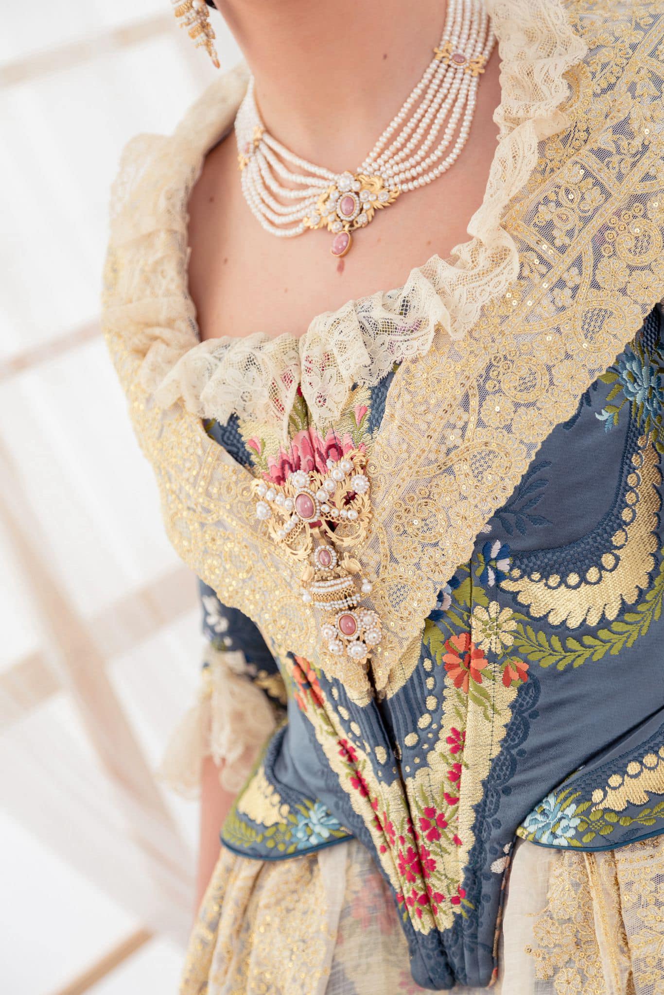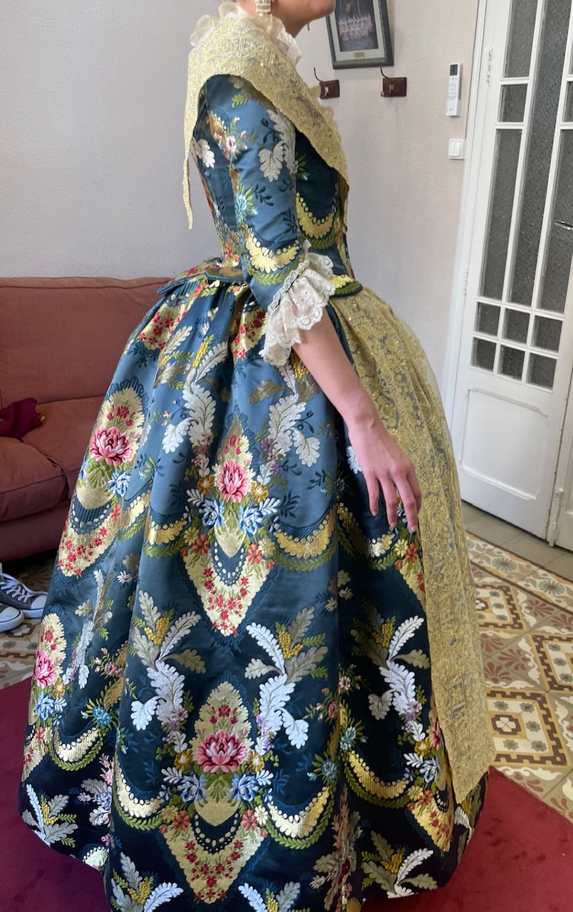 Las puntillas, tanto de las mangas como del escote, son antiguas, un detalle que eleva aún más el valor patrimonial del traje y refuerza su conexión con la tradición y la historia de la indumentaria valenciana.