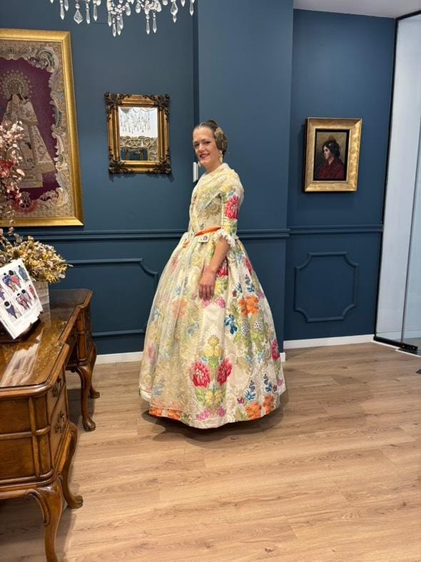 El Espolín Valencia en fondo blanco perla, propiedad de Alicia Robles, es mucho más que una pieza de indumentaria: es una historia cargada de sentimiento, tradición y sueños que finalmente se han hecho realidad gracias al indumentarista Montaña García Caballero.