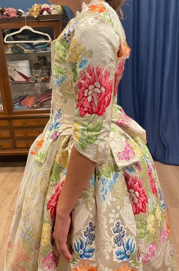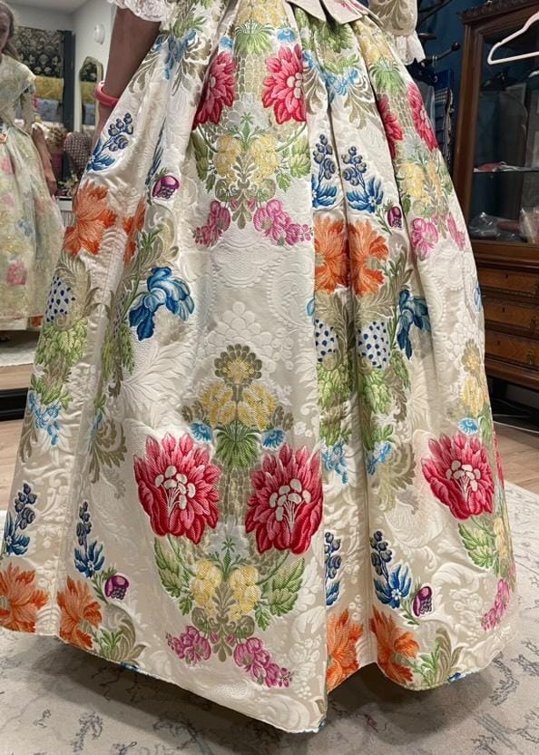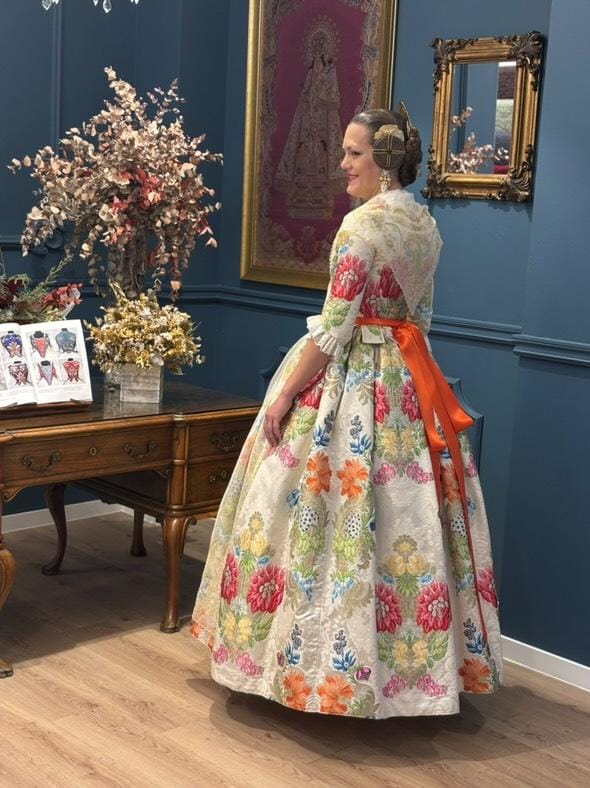 Al combinarlo con las exquisitas manteletas de Hijas de Carmen Esteve, el resultado es un conjunto impecable y atemporal. La delicadeza del fondo blanco perla del espolín se armoniza perfectamente con los bordados de las manteletas, creando una obra única que rinde homenaje a la elegancia y tradición valenciana.
