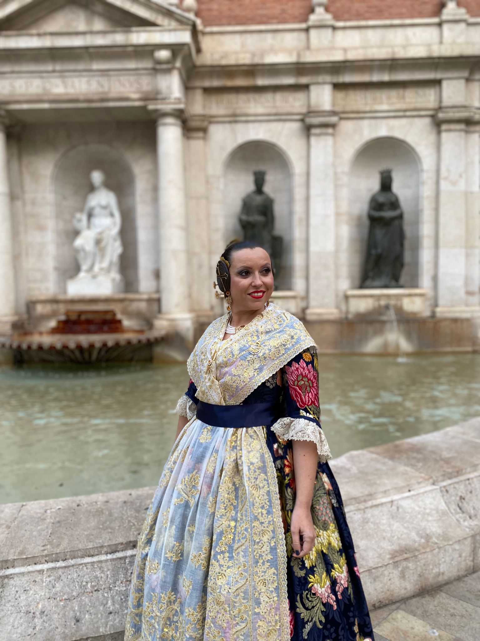 Arantxa Marqués con su espolín Valencia en fondo azul.  Confección de La Calandria ROBA Tradicional