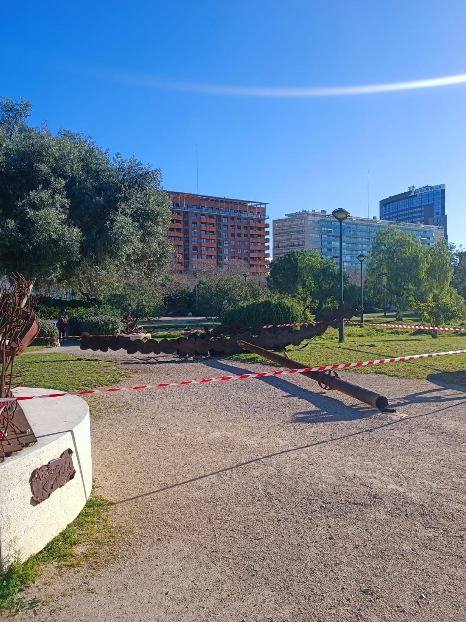 La obra no cuenta con una peana tradicional, aunque sí dispone de una cartela circular que rodea el mástil principal, según han detallado las mismas fuentes. Por el momento, no se han registrado daños personales, y el área ha sido acordonada por seguridad mientras se evalúan los daños y se estudia la retirada de la estructura caída.