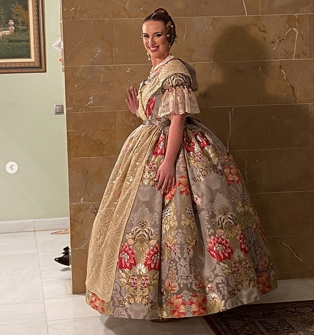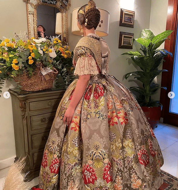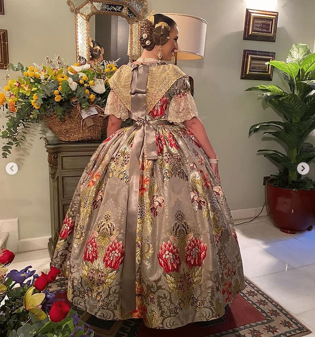 La indumentarista Amparo Fabra fue la encargada de confeccionar el espolín de Garín ‘Valencia’ sobre el color  “gris cuarzo”, con mezcla de varios tintes, manteletas en cadeneta de oro sobre tul y encajes antiguos de Punto de Inglaterra con rosas en relieve aproximadamente del año 1870-1880, de Antiguedades Me Encanta.