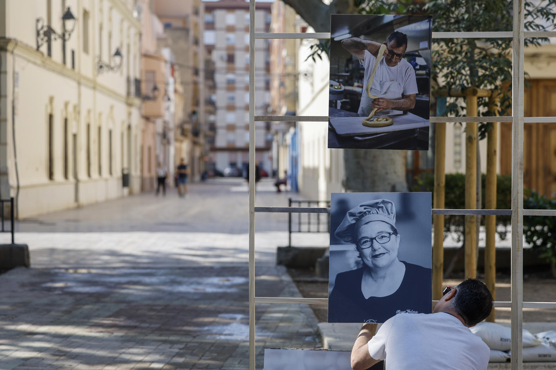 Una persona ultima el montaje de la exposición "Un barrio modelo" a beneficio de la Asociación de Residentes Damnificados por el incendio del barrio de Campanar de València. EFE/Kai Försterling