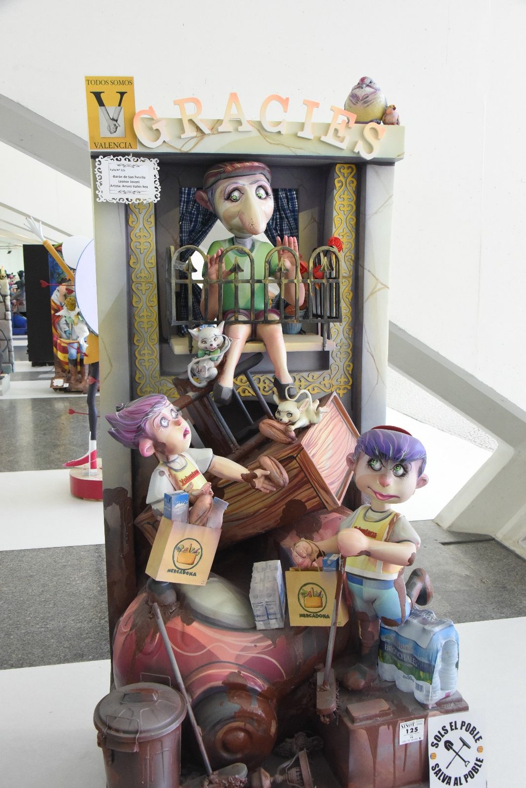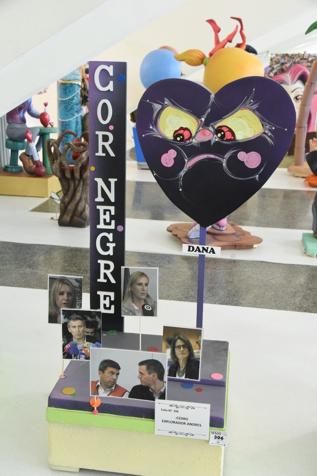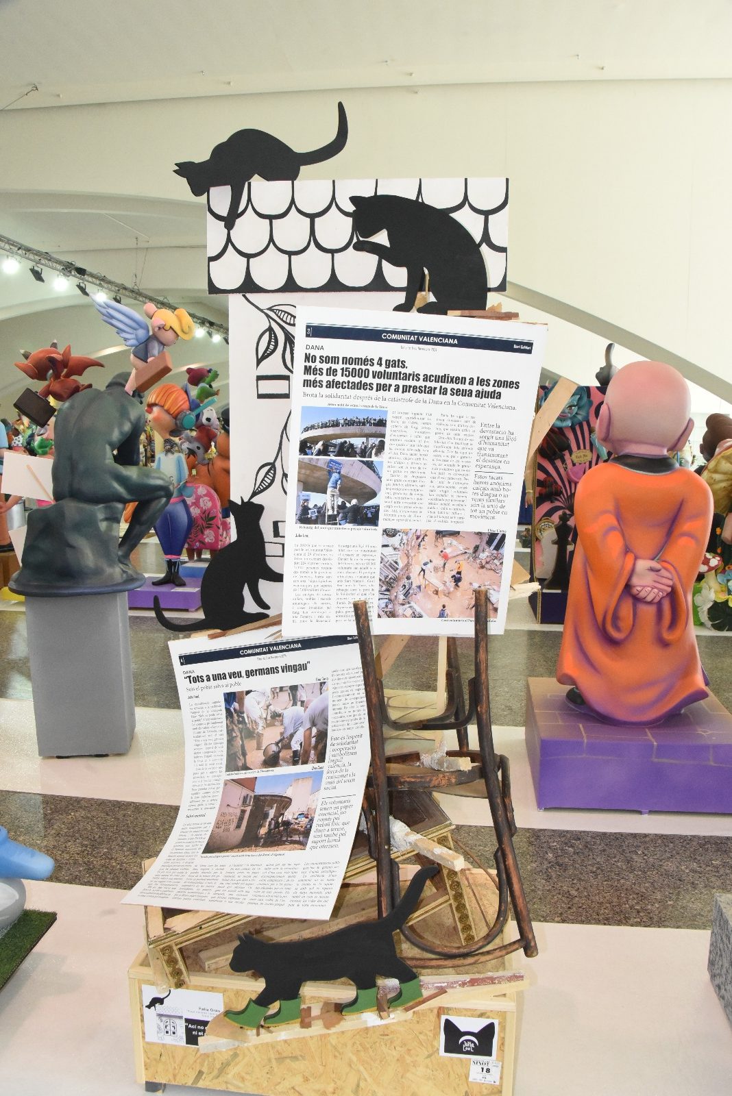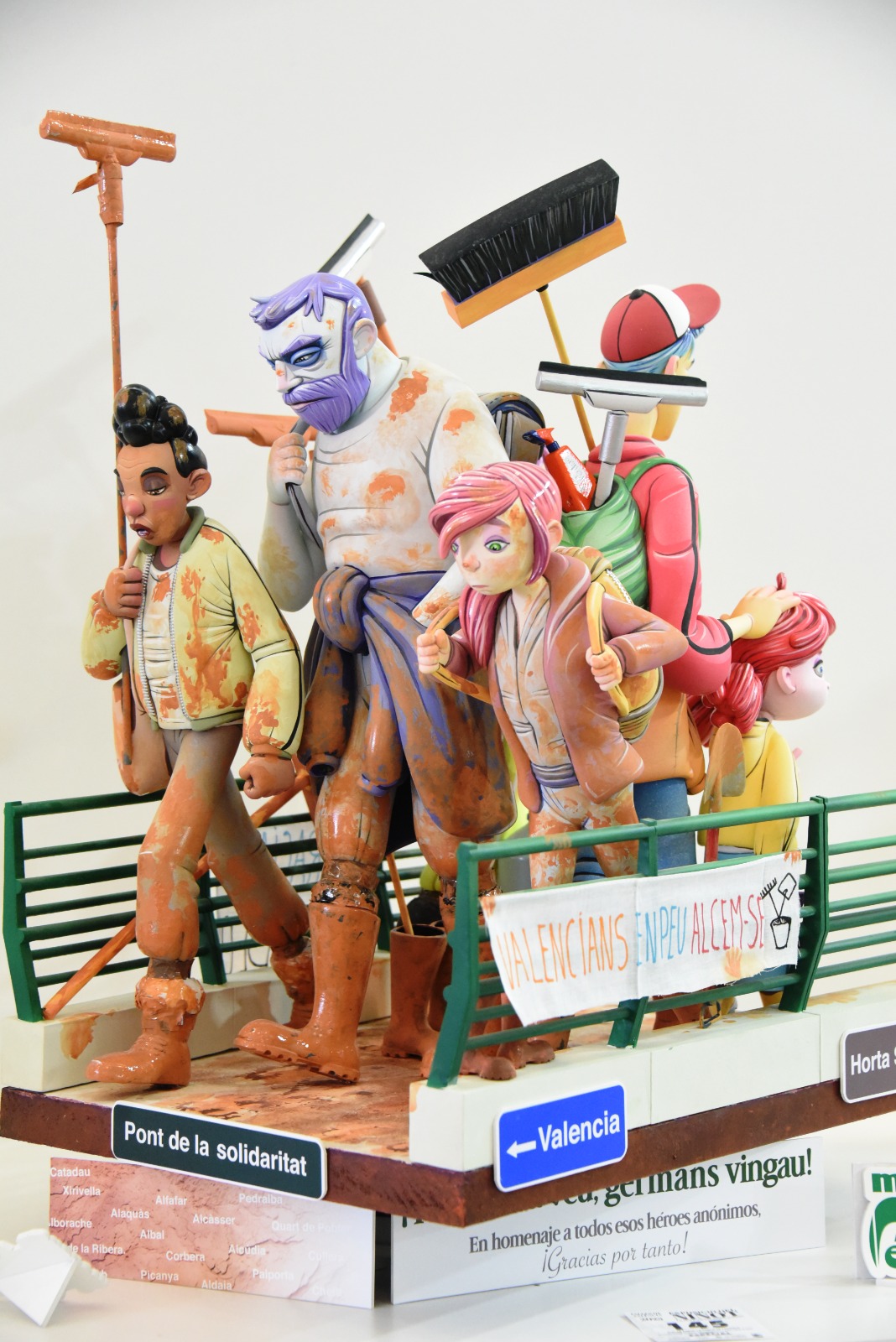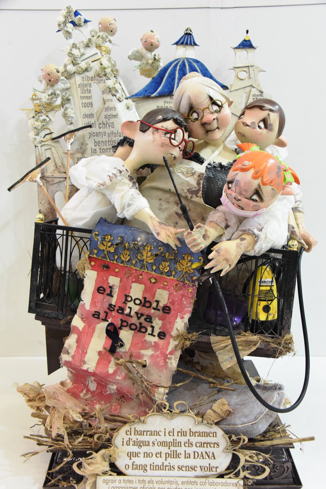 La tragedia de la dana se refleja en escenas donde se homenajea el lema «el pueblo salva al pueblo», con voluntarios ayudando a limpiar las calles cubiertas de lodo y utensilios como escobas, cubos y cepillos. Los ninots representan personajes agradeciendo desde balcones la colaboración de bomberos y vecinos, mientras que otros critican el retraso de las ayudas, mostrando a políticos convertidos en «Pinochos».