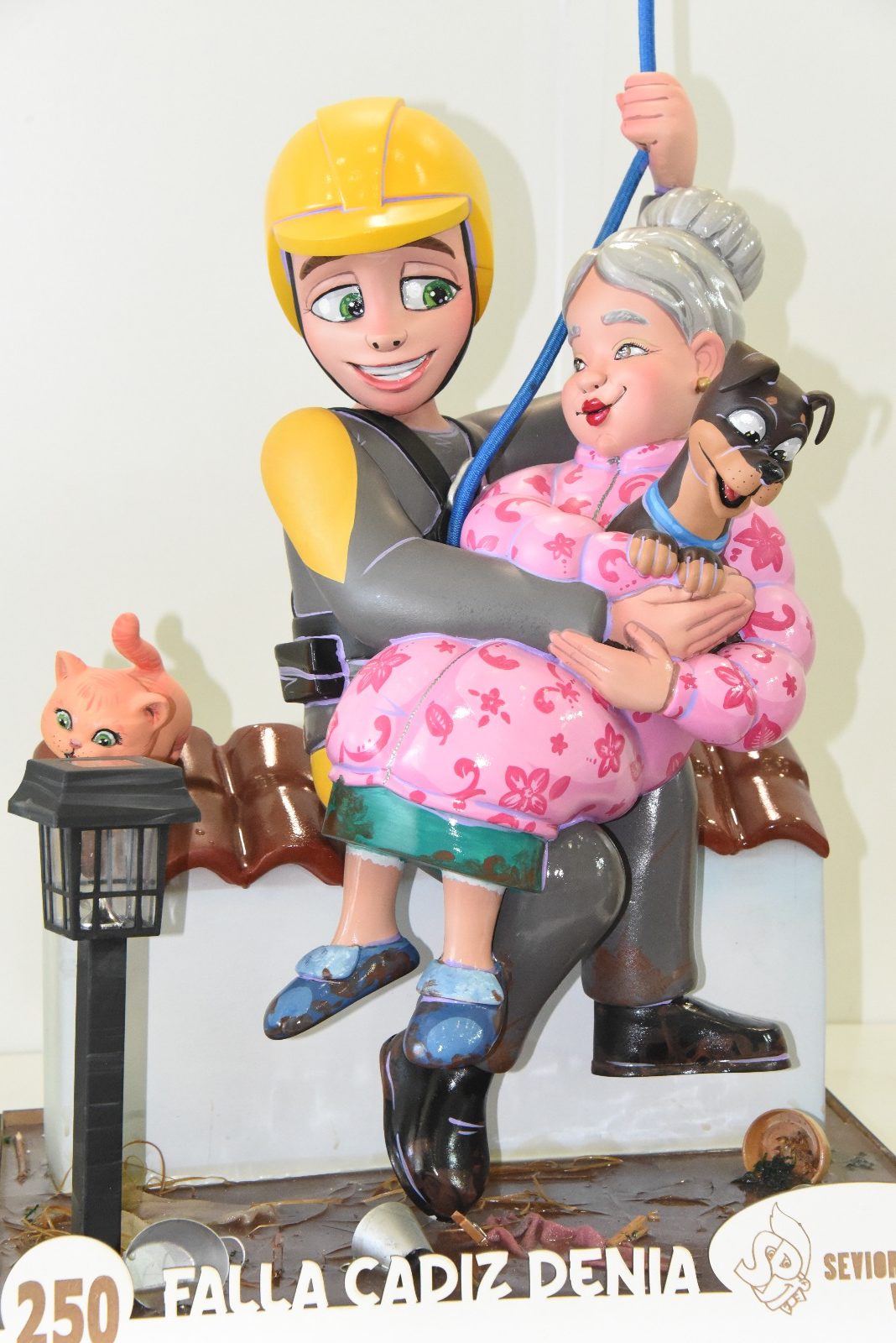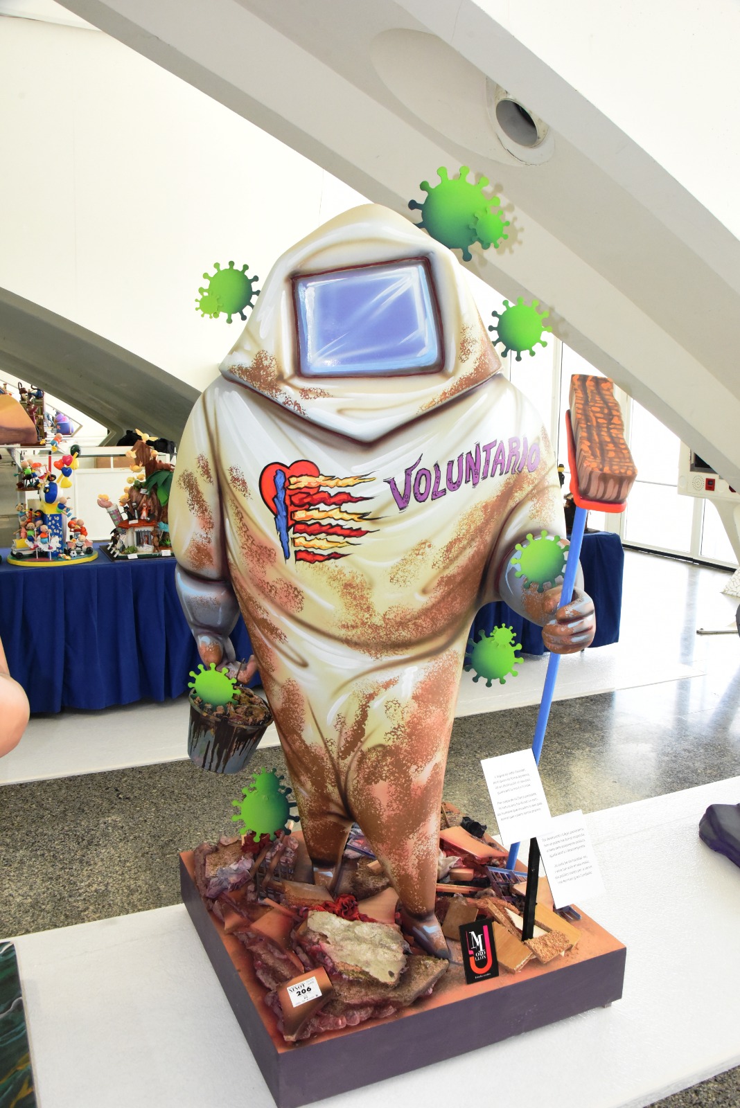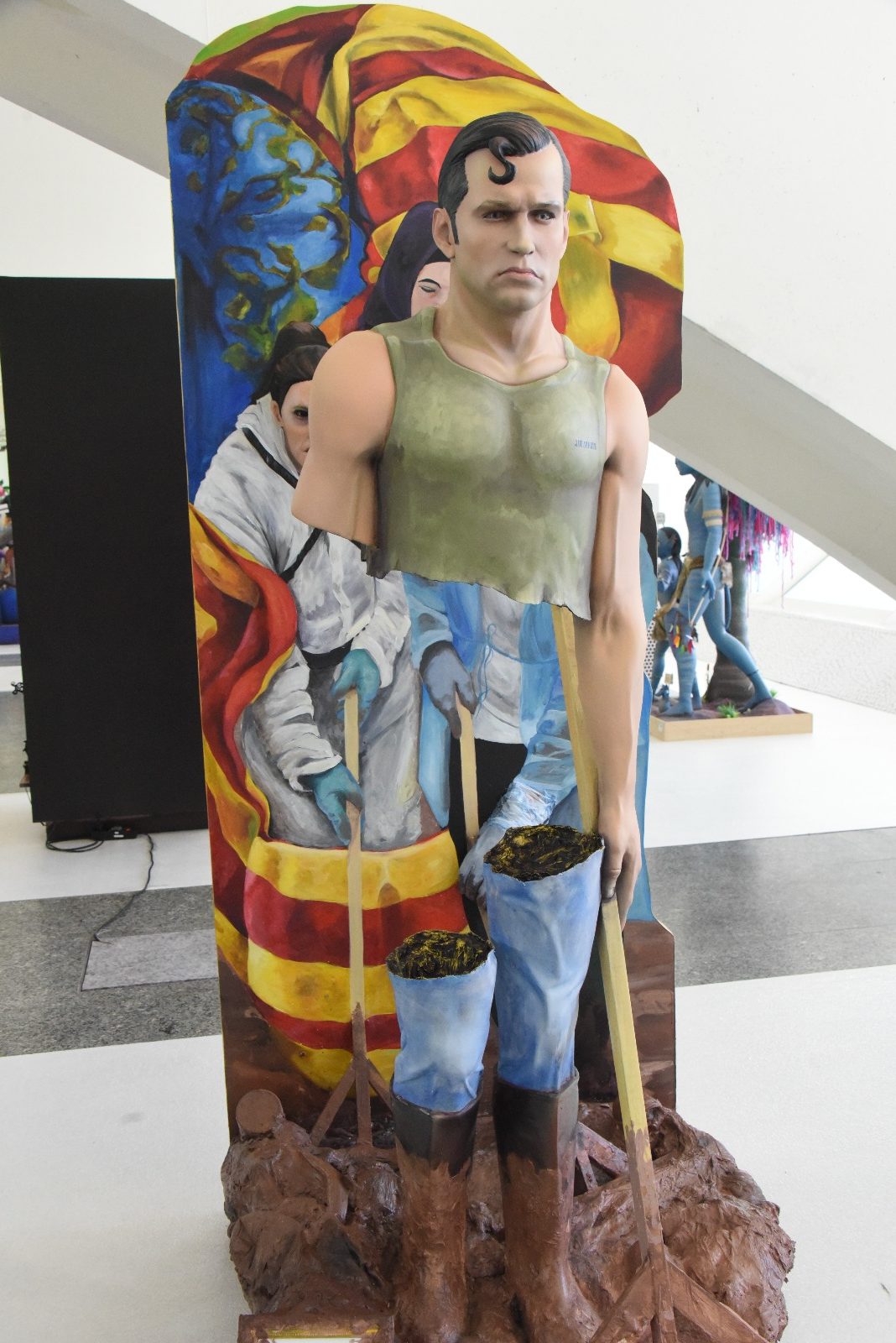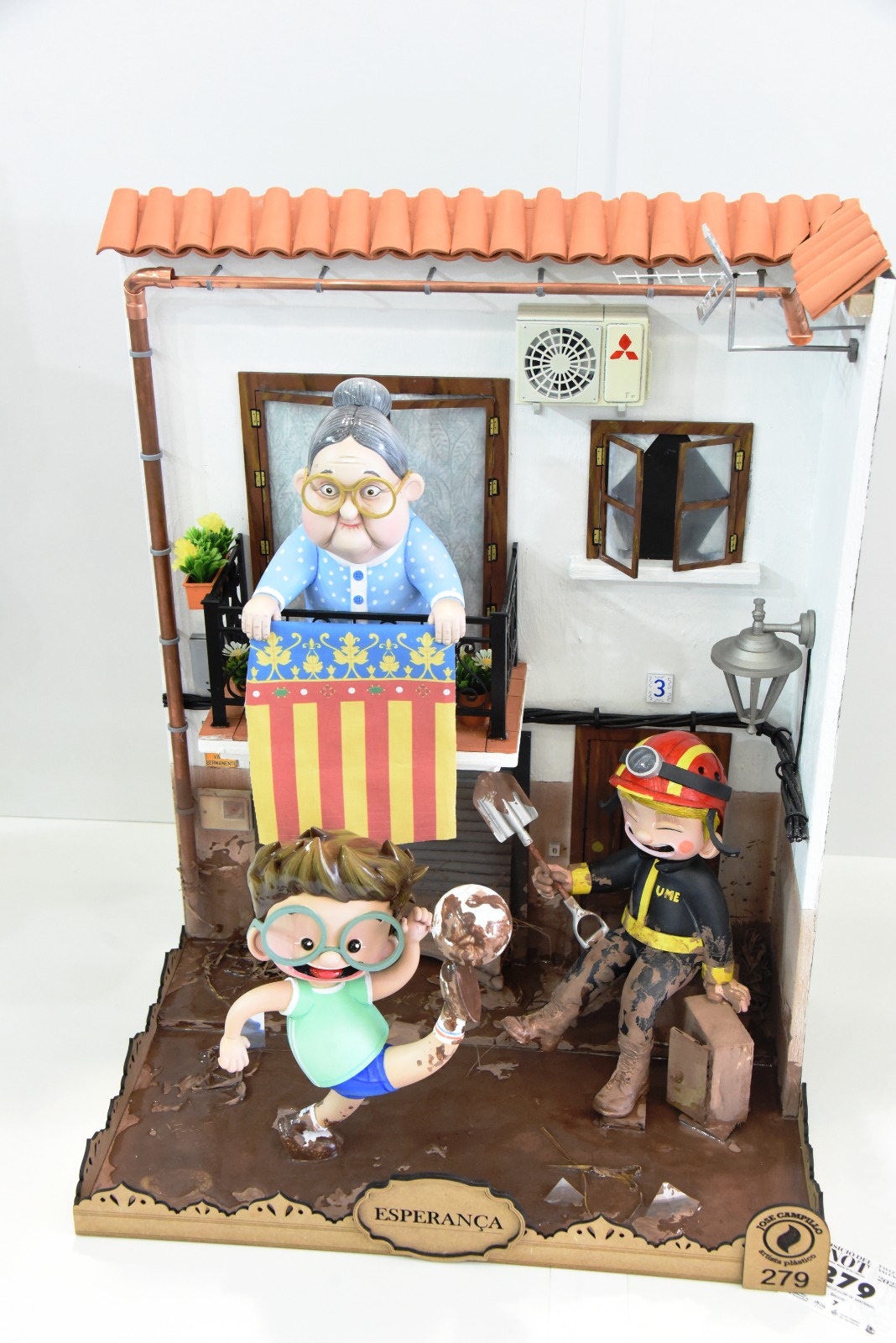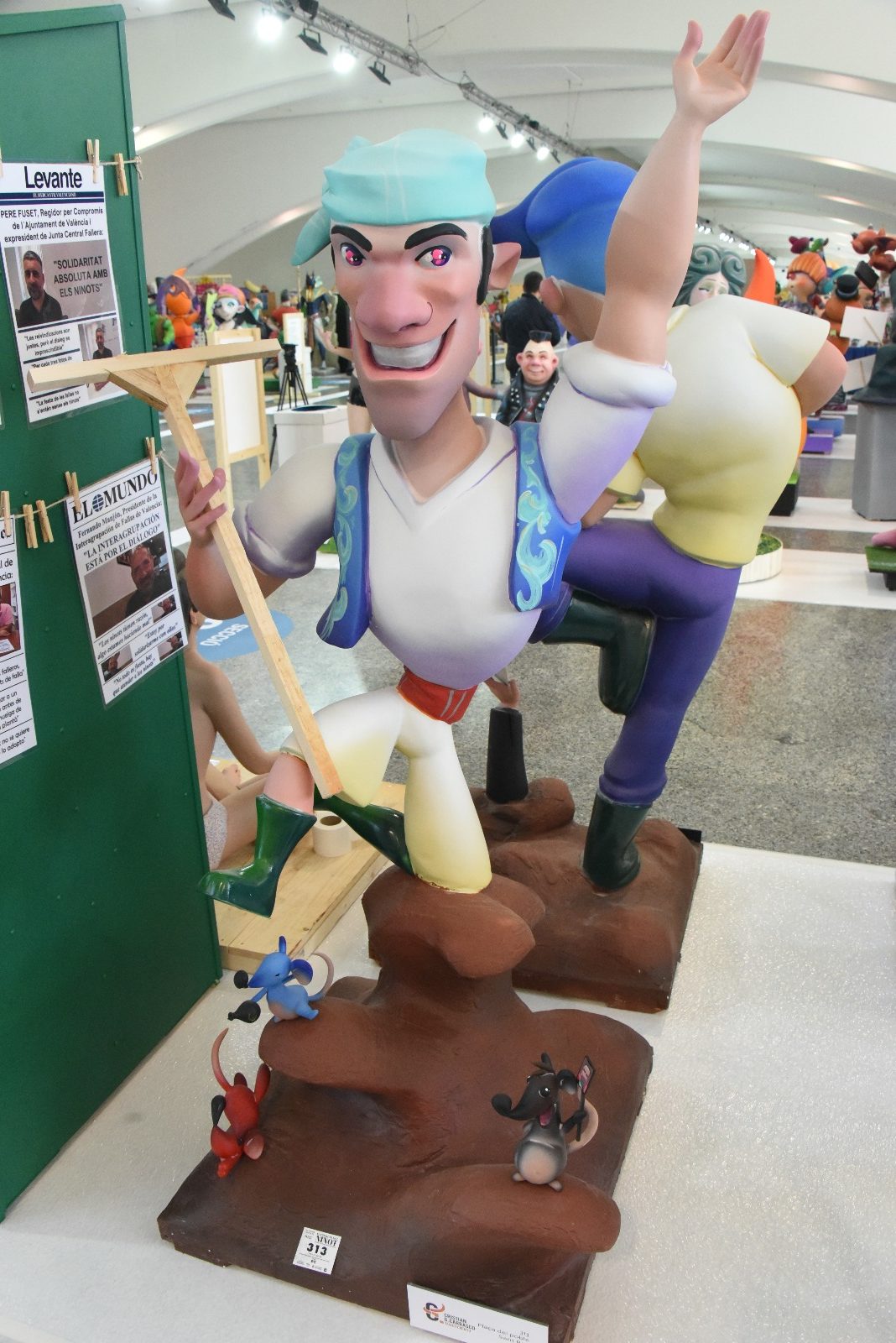 La tragedia de la dana se refleja en escenas donde se homenajea el lema «el pueblo salva al pueblo», con voluntarios ayudando a limpiar las calles cubiertas de lodo y utensilios como escobas, cubos y cepillos. Los ninots representan personajes agradeciendo desde balcones la colaboración de bomberos y vecinos, mientras que otros critican el retraso de las ayudas, mostrando a políticos convertidos en «Pinochos».