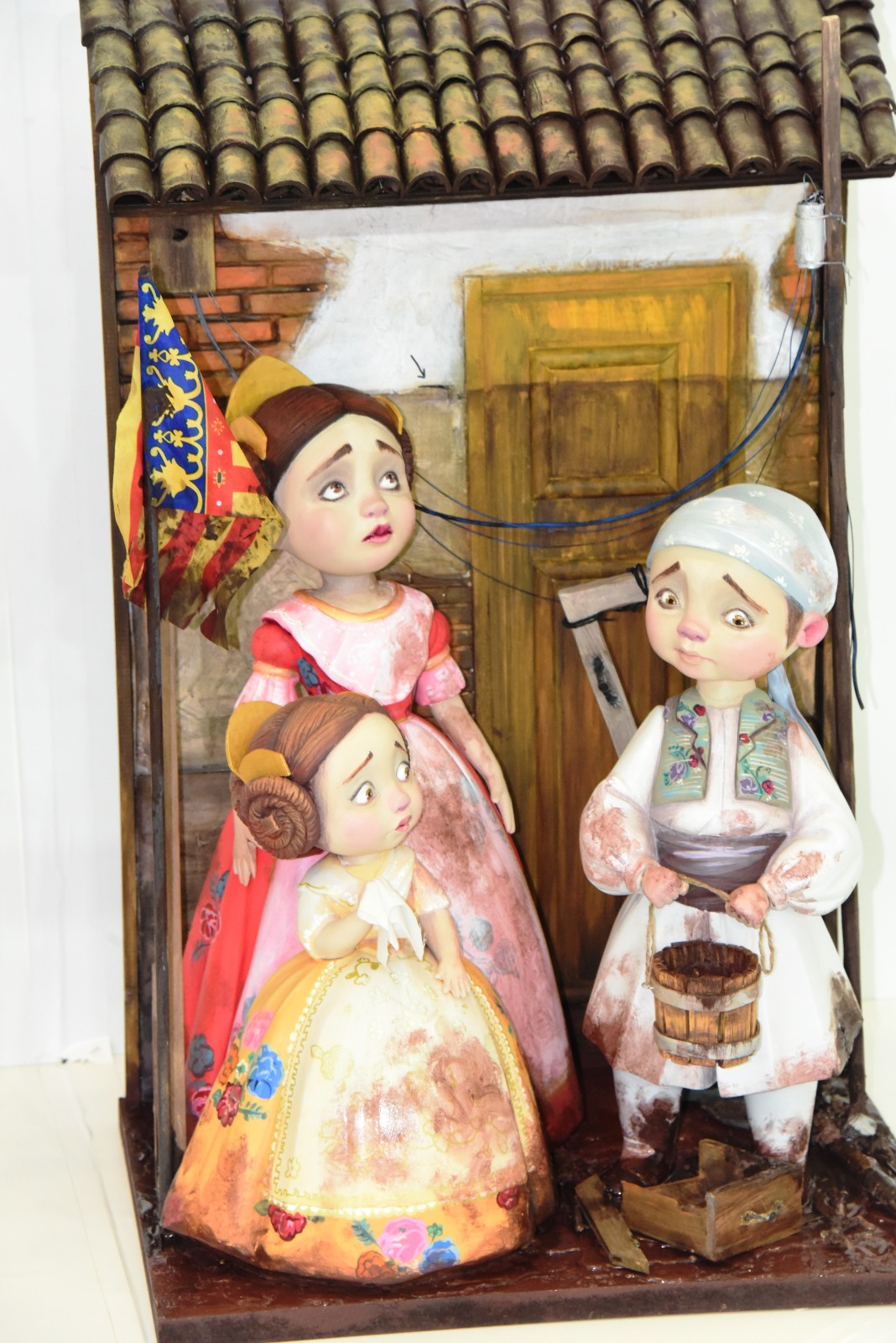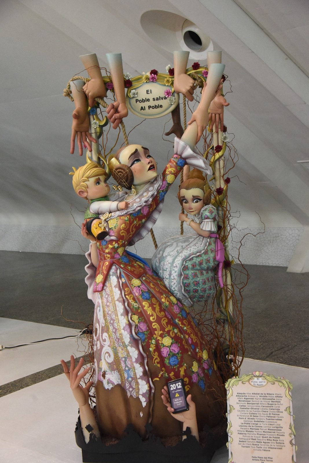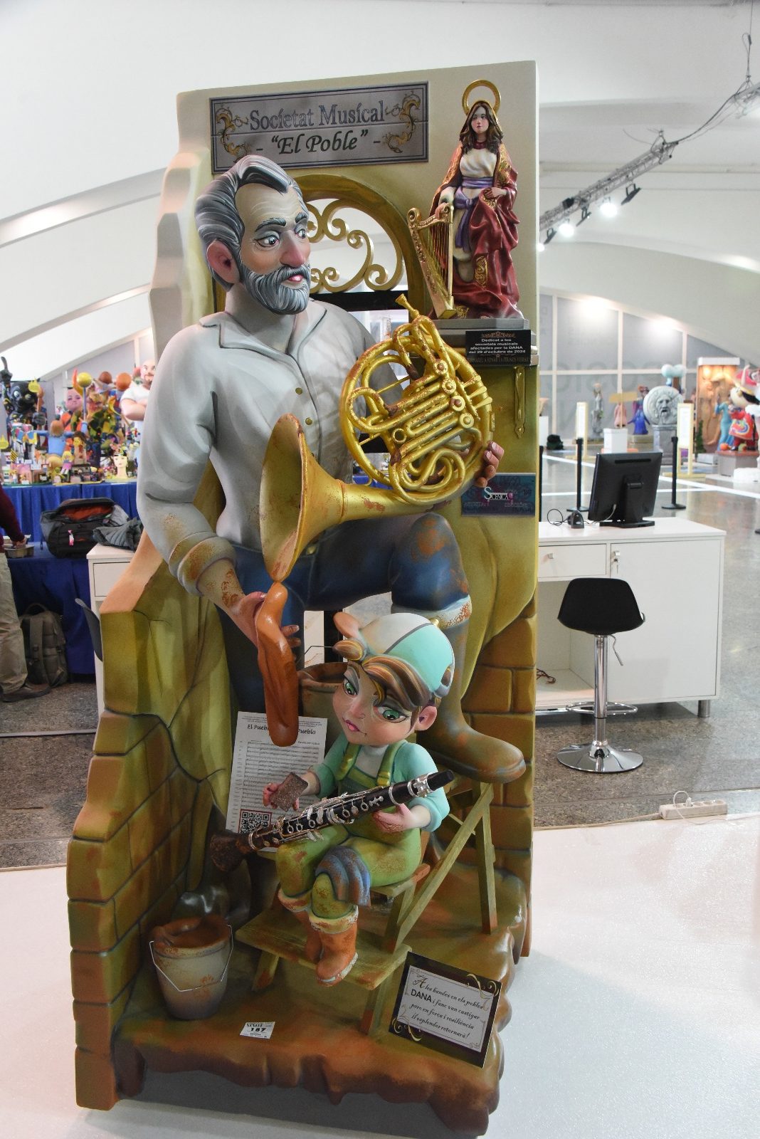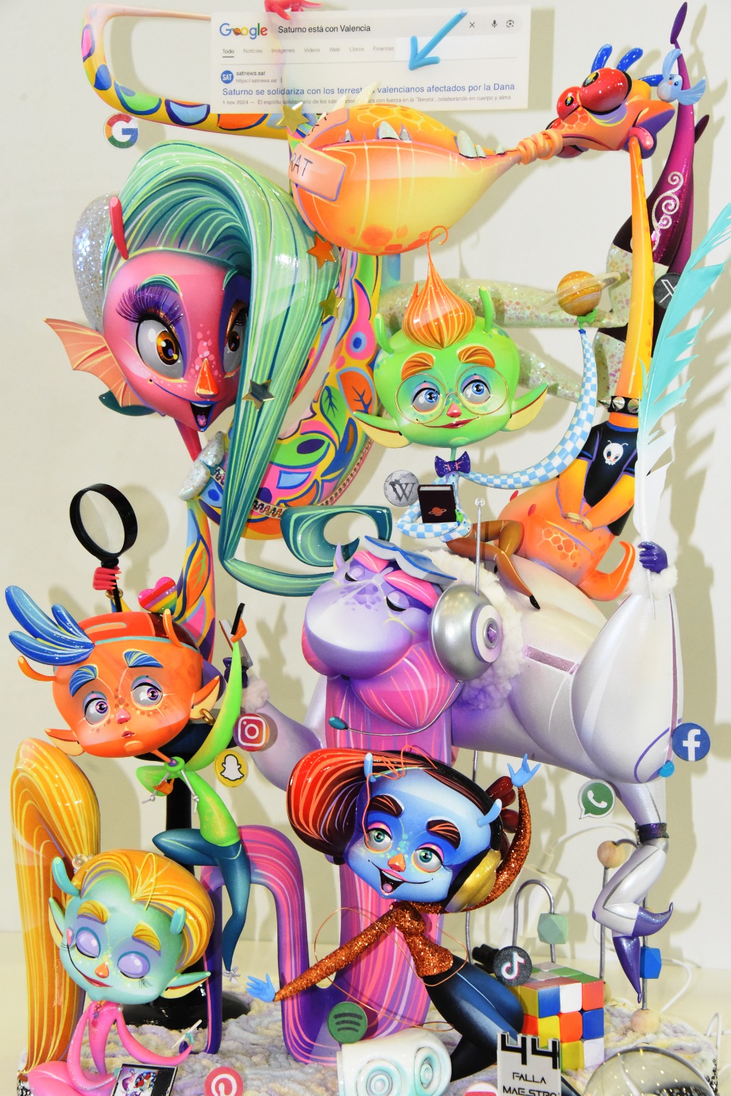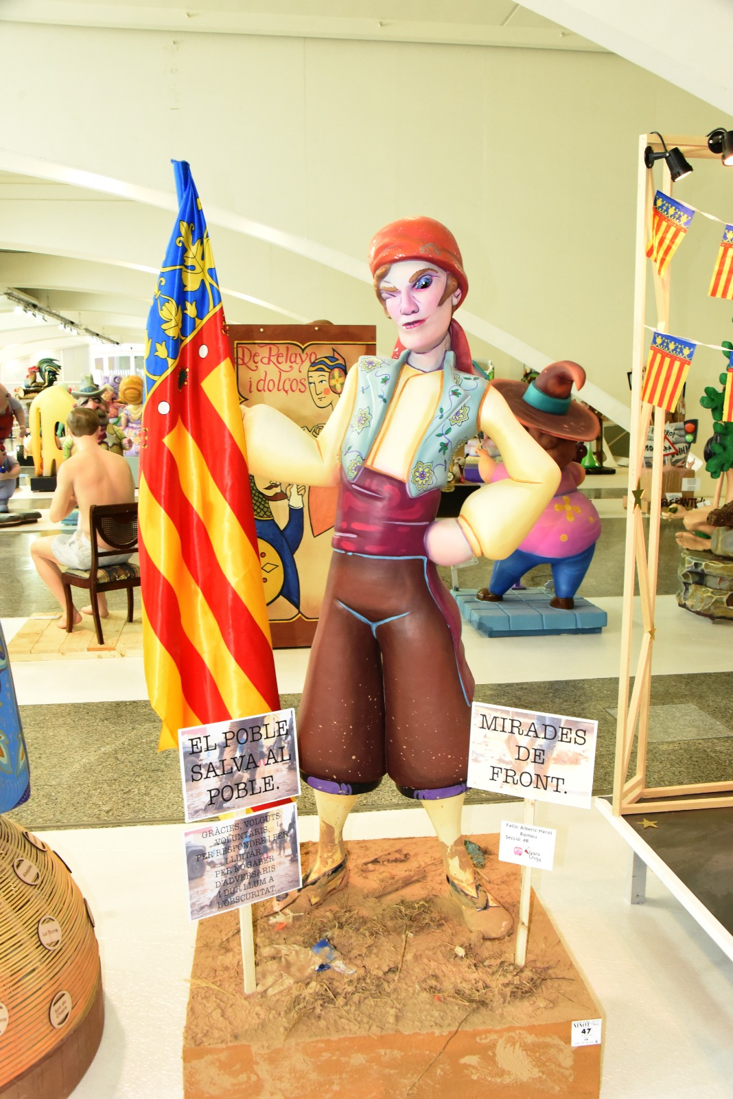 La tragedia de la dana se refleja en escenas donde se homenajea el lema «el pueblo salva al pueblo», con voluntarios ayudando a limpiar las calles cubiertas de lodo y utensilios como escobas, cubos y cepillos. Los ninots representan personajes agradeciendo desde balcones la colaboración de bomberos y vecinos, mientras que otros critican el retraso de las ayudas, mostrando a políticos convertidos en «Pinochos».