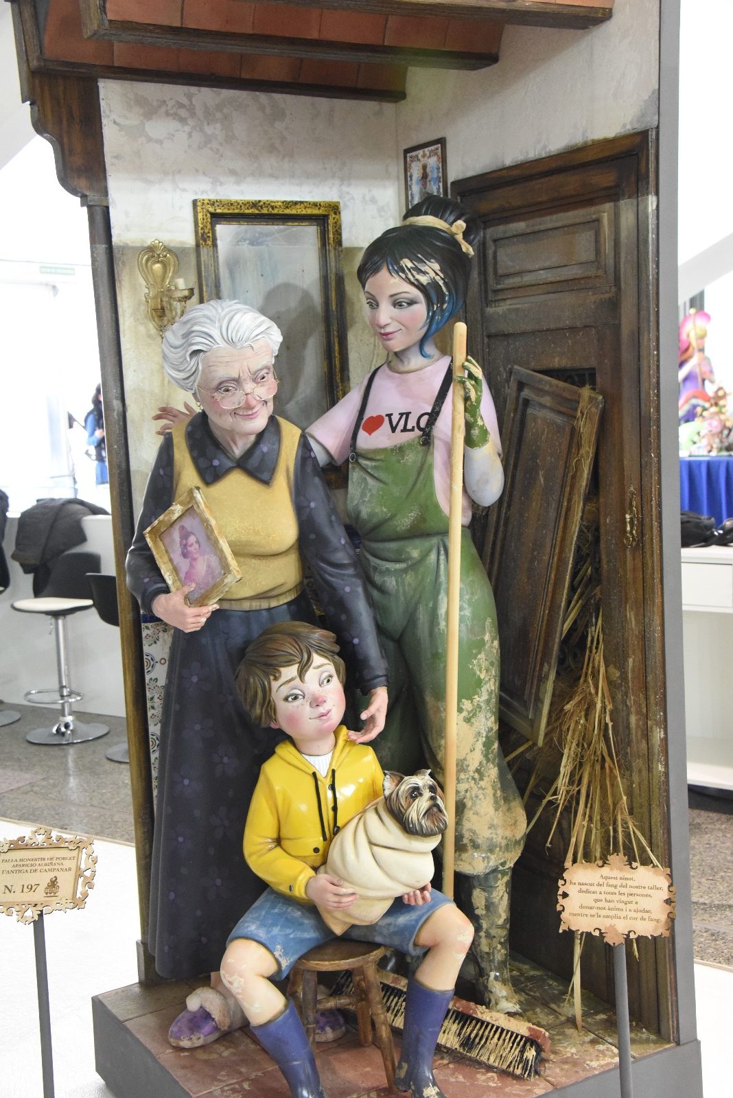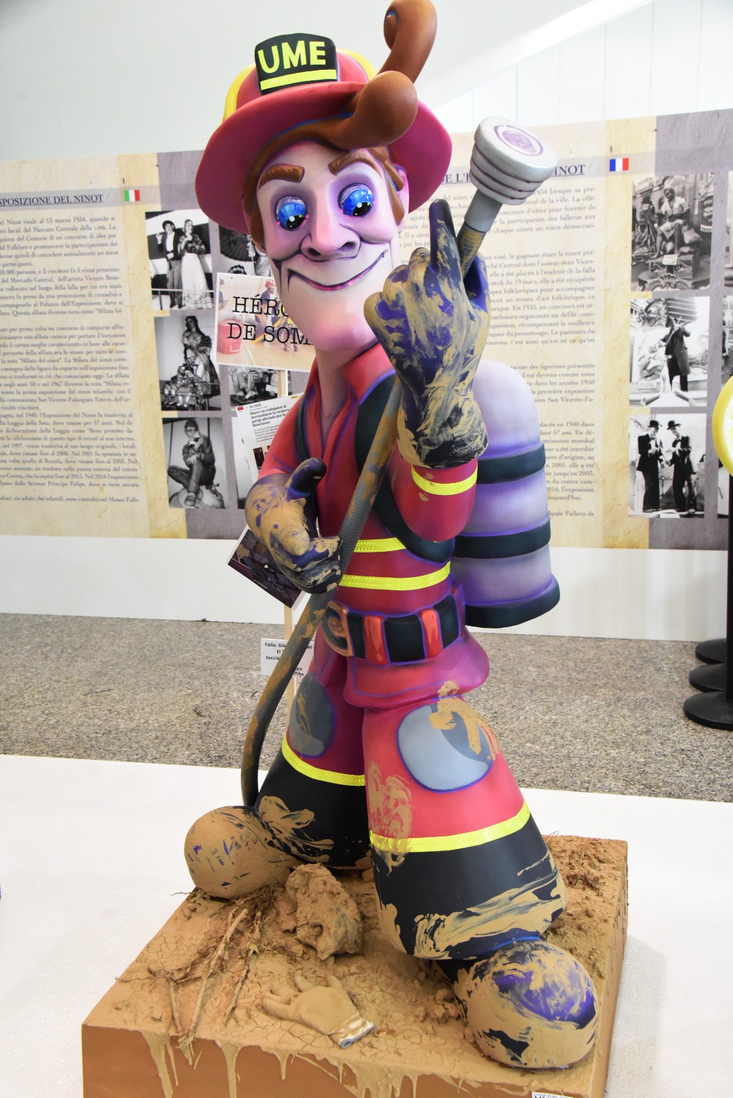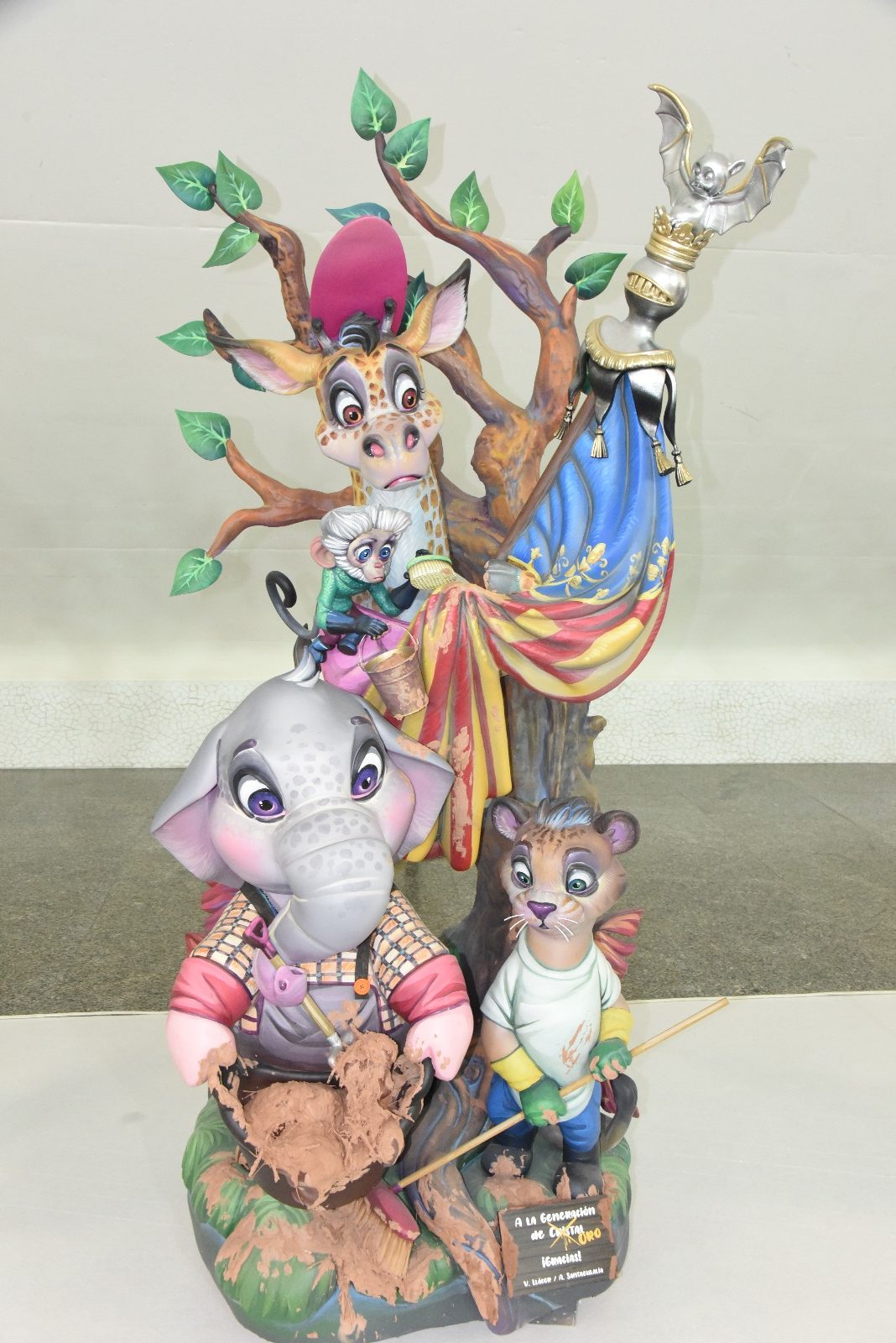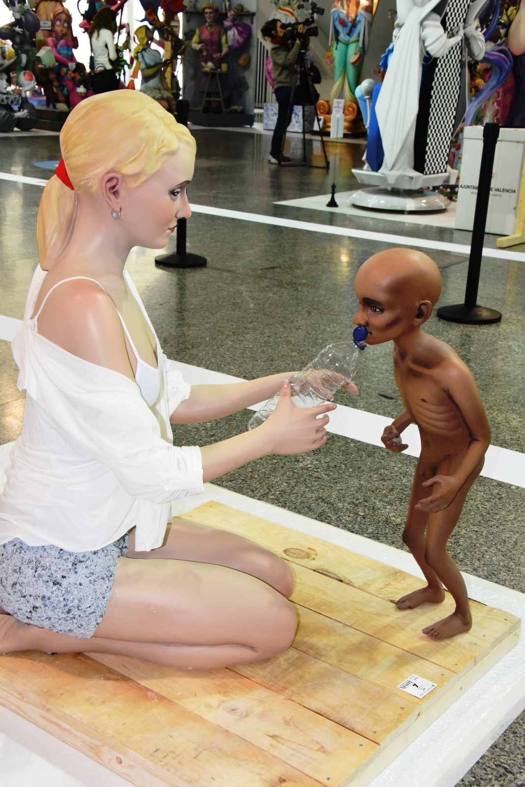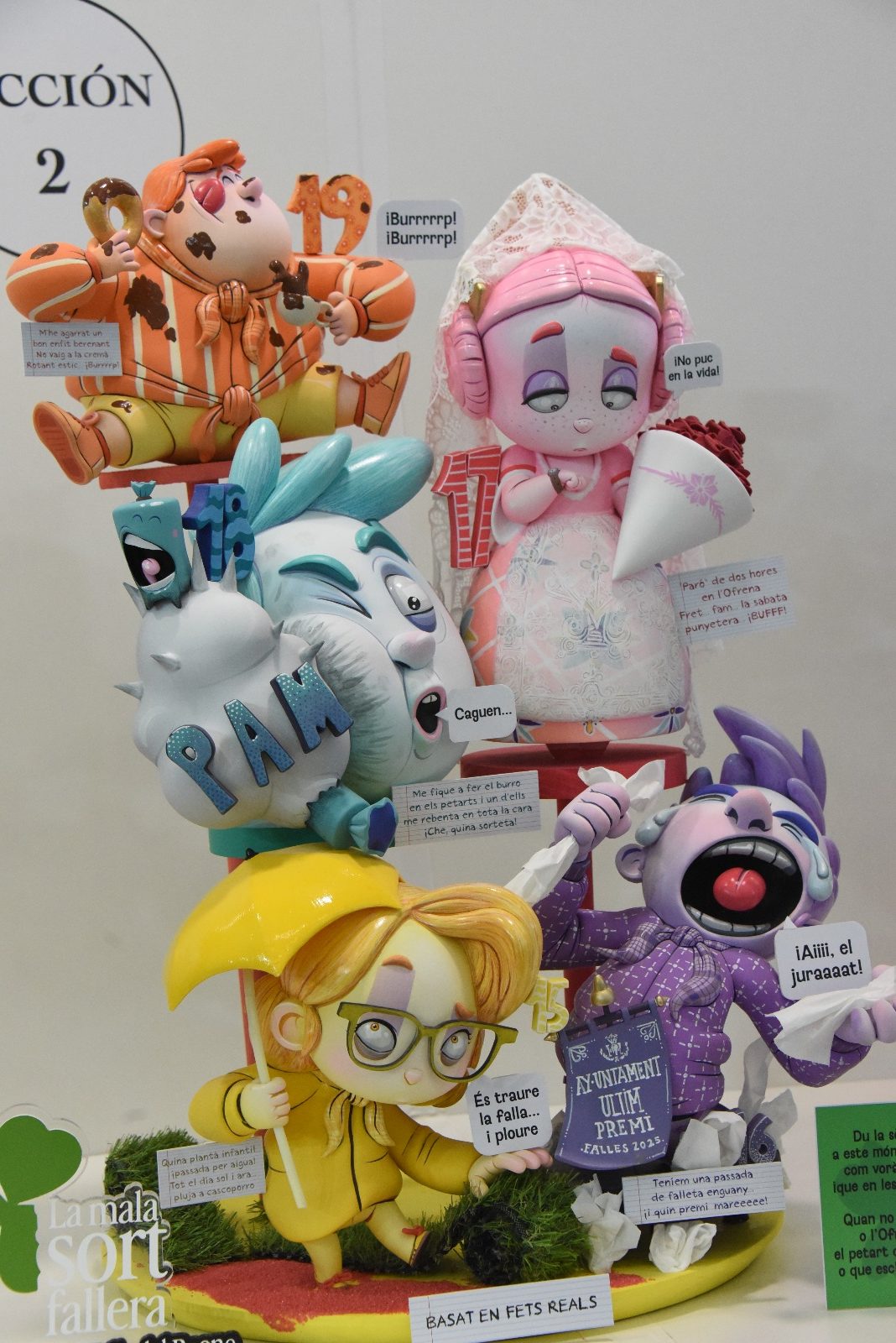La tragedia de la dana se refleja en escenas donde se homenajea el lema «el pueblo salva al pueblo», con voluntarios ayudando a limpiar las calles cubiertas de lodo y utensilios como escobas, cubos y cepillos. Los ninots representan personajes agradeciendo desde balcones la colaboración de bomberos y vecinos, mientras que otros critican el retraso de las ayudas, mostrando a políticos convertidos en «Pinochos».
