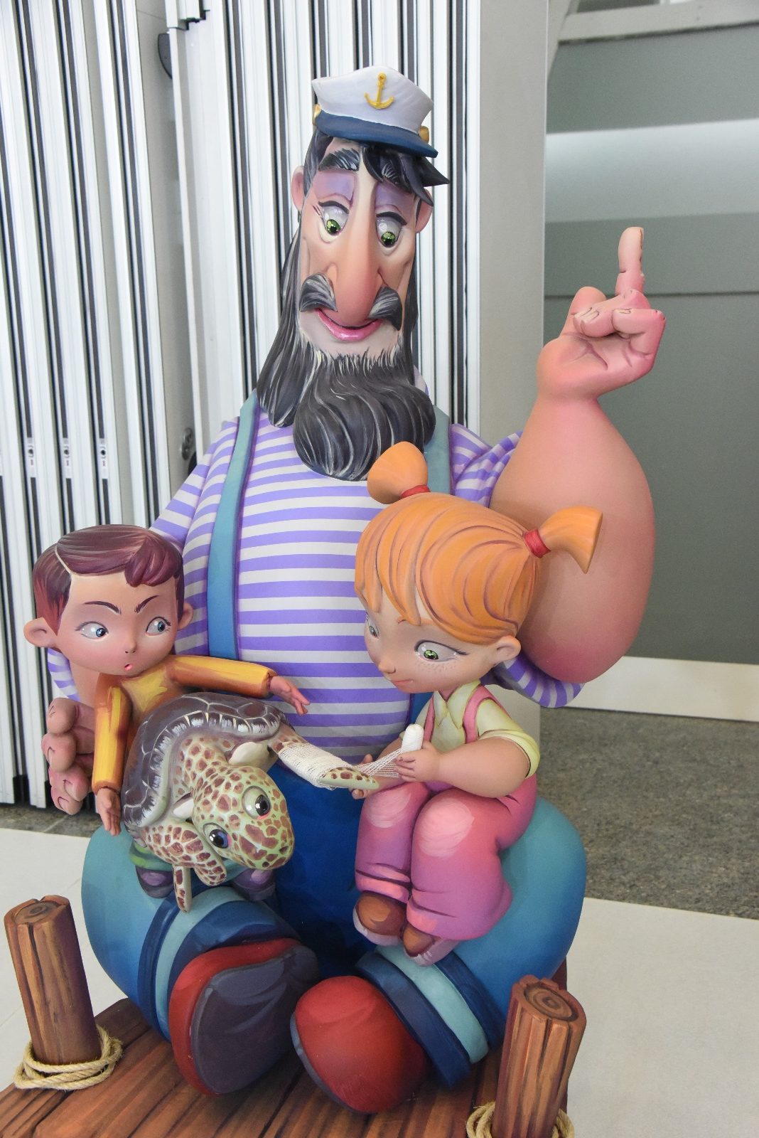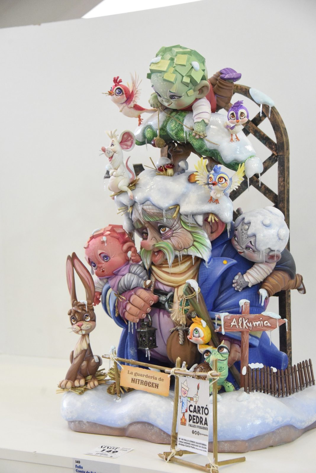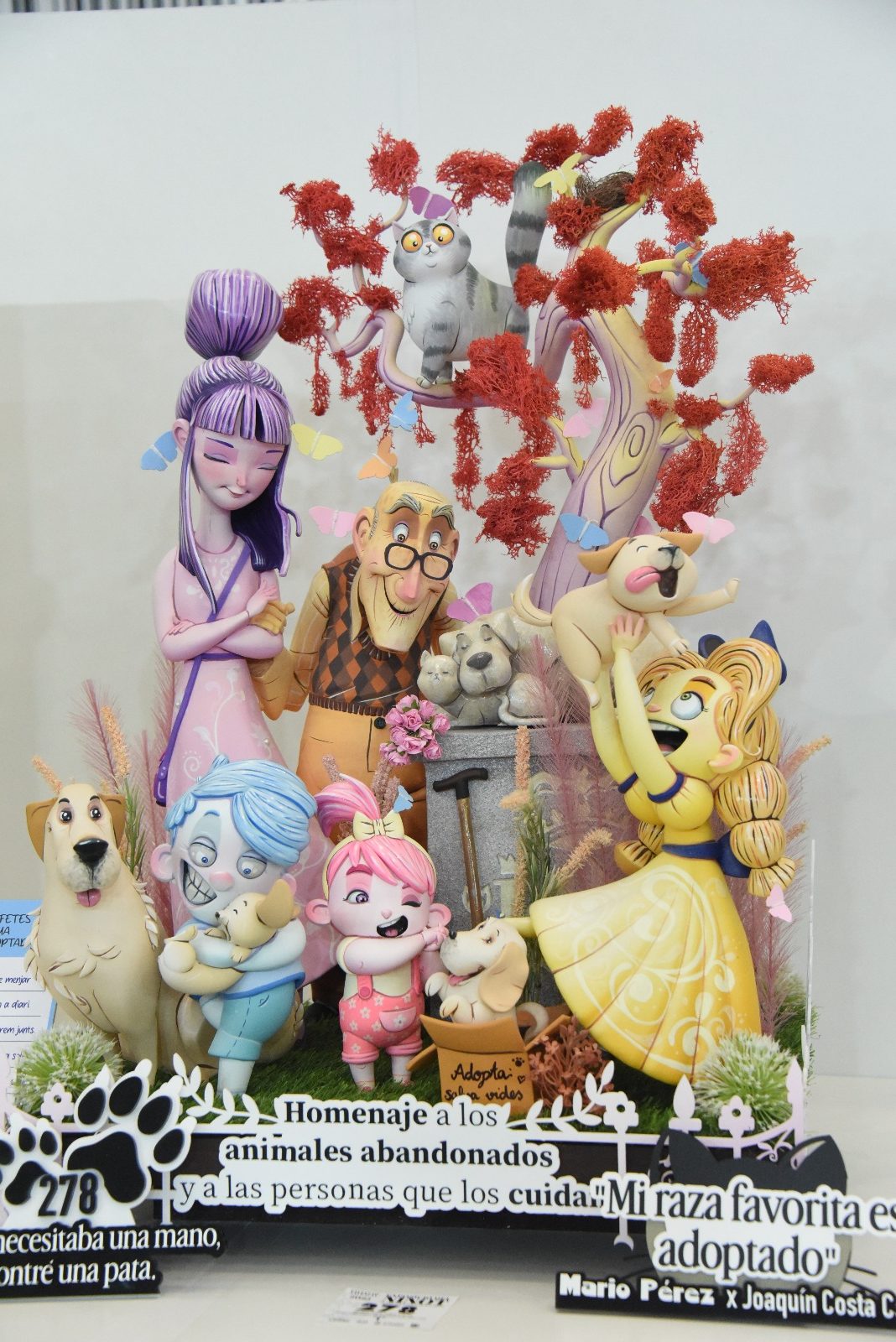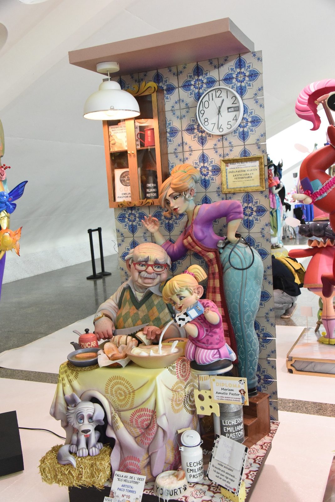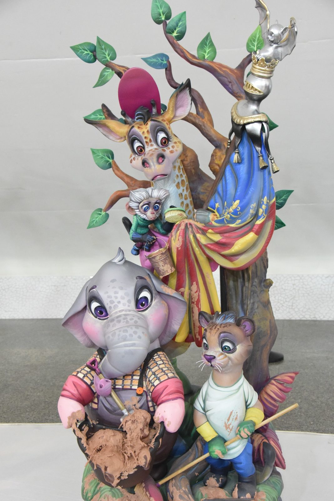 La tragedia de la dana se refleja en escenas donde se homenajea el lema «el pueblo salva al pueblo», con voluntarios ayudando a limpiar las calles cubiertas de lodo y utensilios como escobas, cubos y cepillos. Los ninots representan personajes agradeciendo desde balcones la colaboración de bomberos y vecinos, mientras que otros critican el retraso de las ayudas, mostrando a políticos convertidos en «Pinochos».