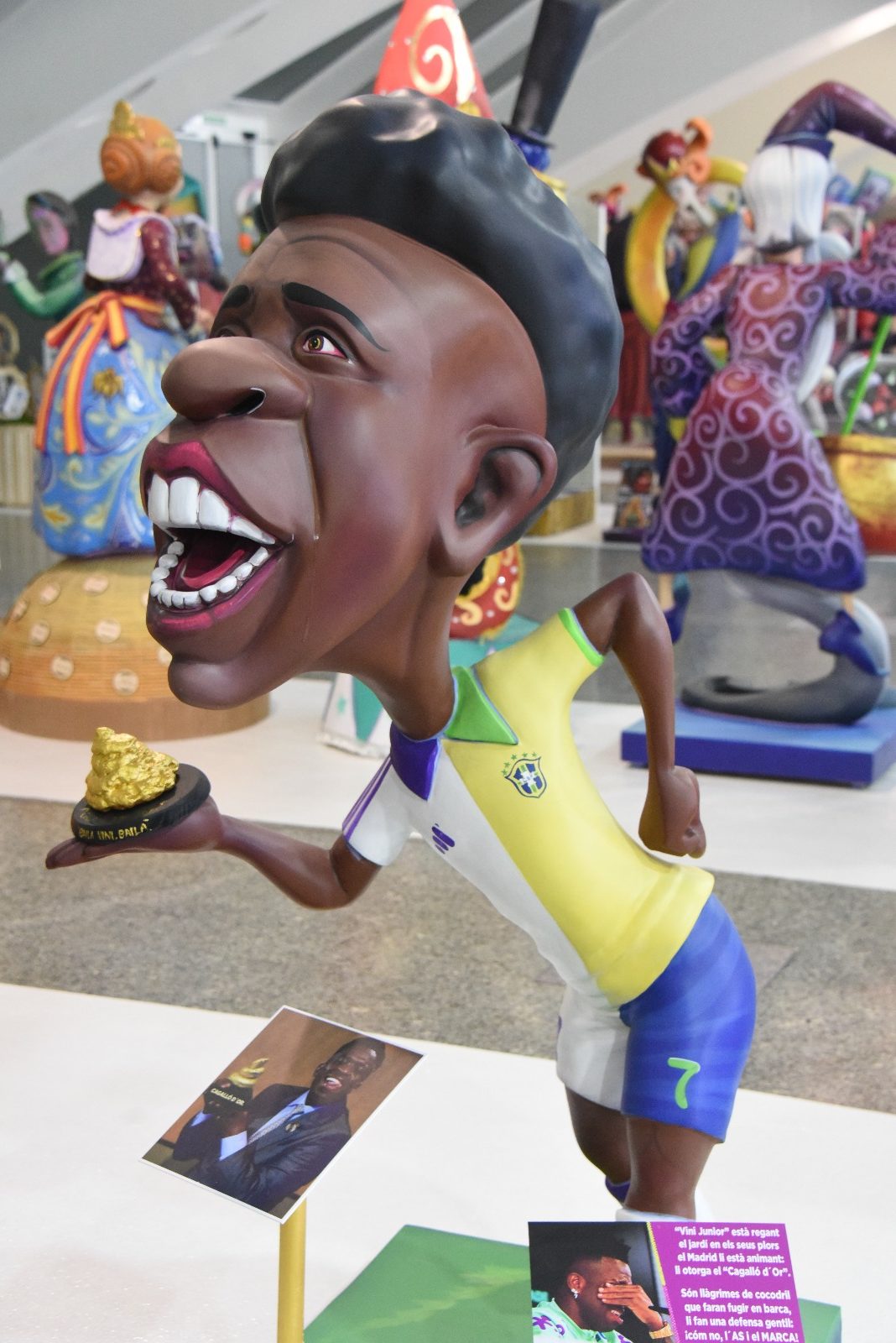 En el ámbito deportivo, destaca un ninot del jugador del Real Madrid Vinicius, portando el «cagalló d’or» (cagallón de oro) en referencia al Balón de Oro que no ganó, lo que ha generado polémica. El propietario del Valencia CF, Peter Lim, aparece caracterizado como un demonio sobre el escudo del club, mientras otro ninot muestra a un murciélago con la camiseta del Valencia junto a dos ranas, en alusión al Levante UD.