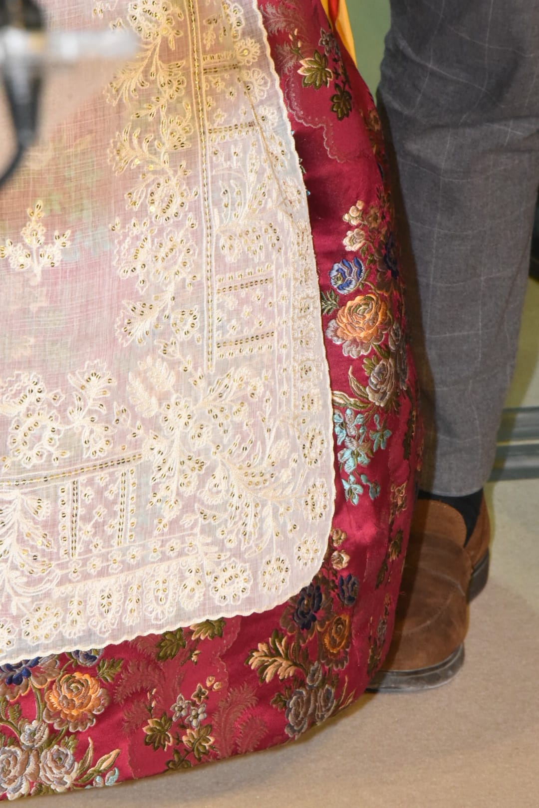 Se trata de un tejido de seda natural, dibujo exclusivo “Sergio Esteve” de Vives y Marí, con fondo Borgoña tramado en colores azul cielo, musgo, aguamarina, oro antiguo, marino, gris imperial y la nobleza en color topo. Confeccionado del siglo XVIII con unas manteletas en muselina fina, bordada a cadeneta en crema y lentejuela metálica en oro de Santos Textil. Y con los siguientes complementos: