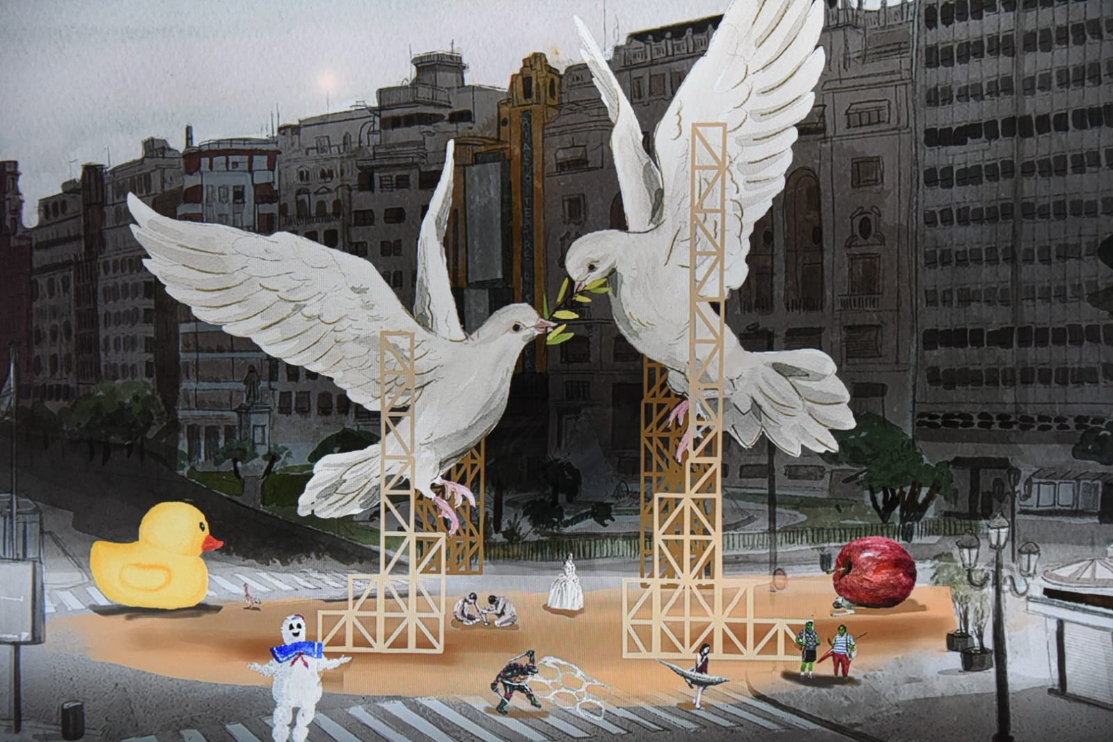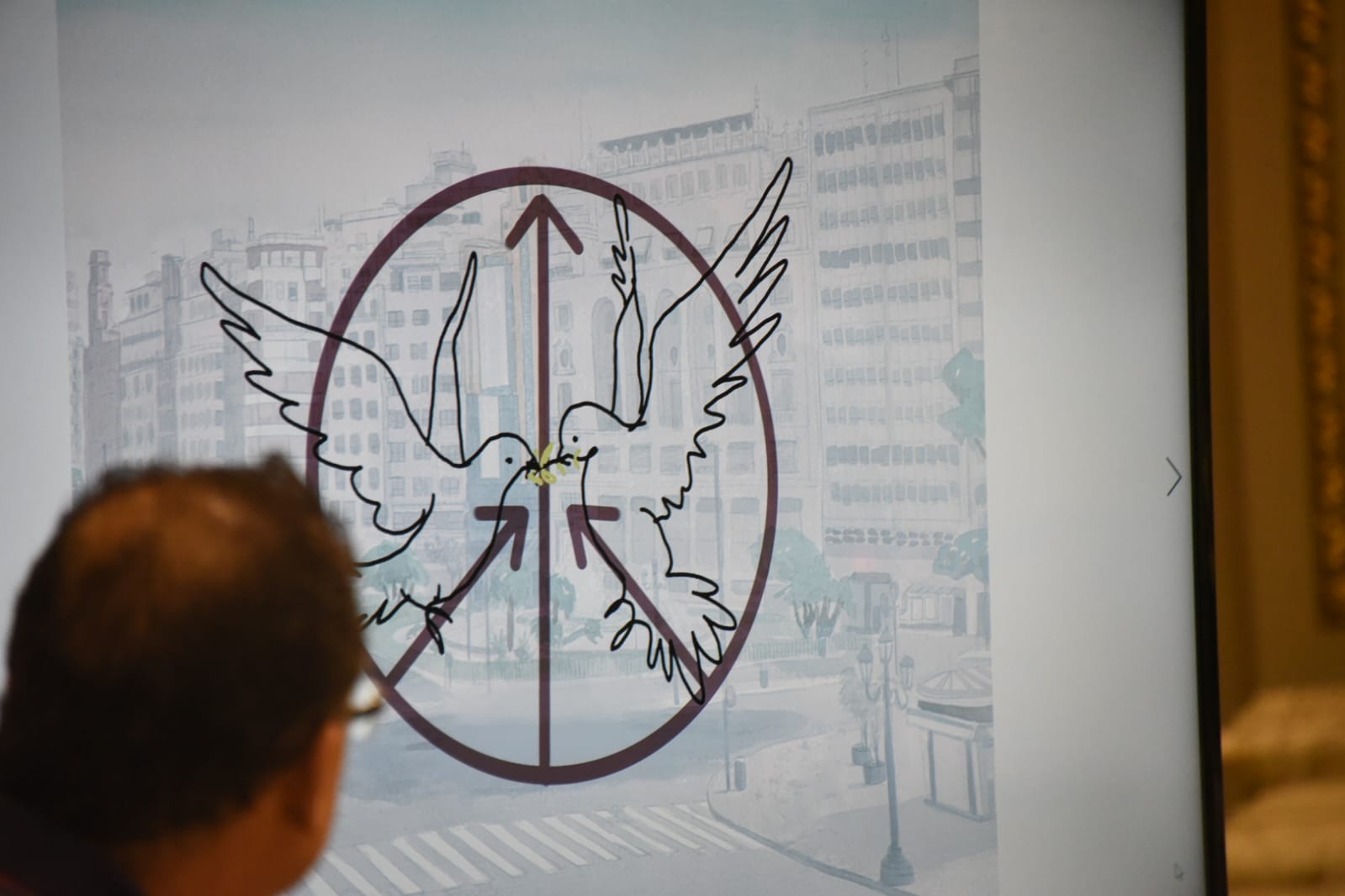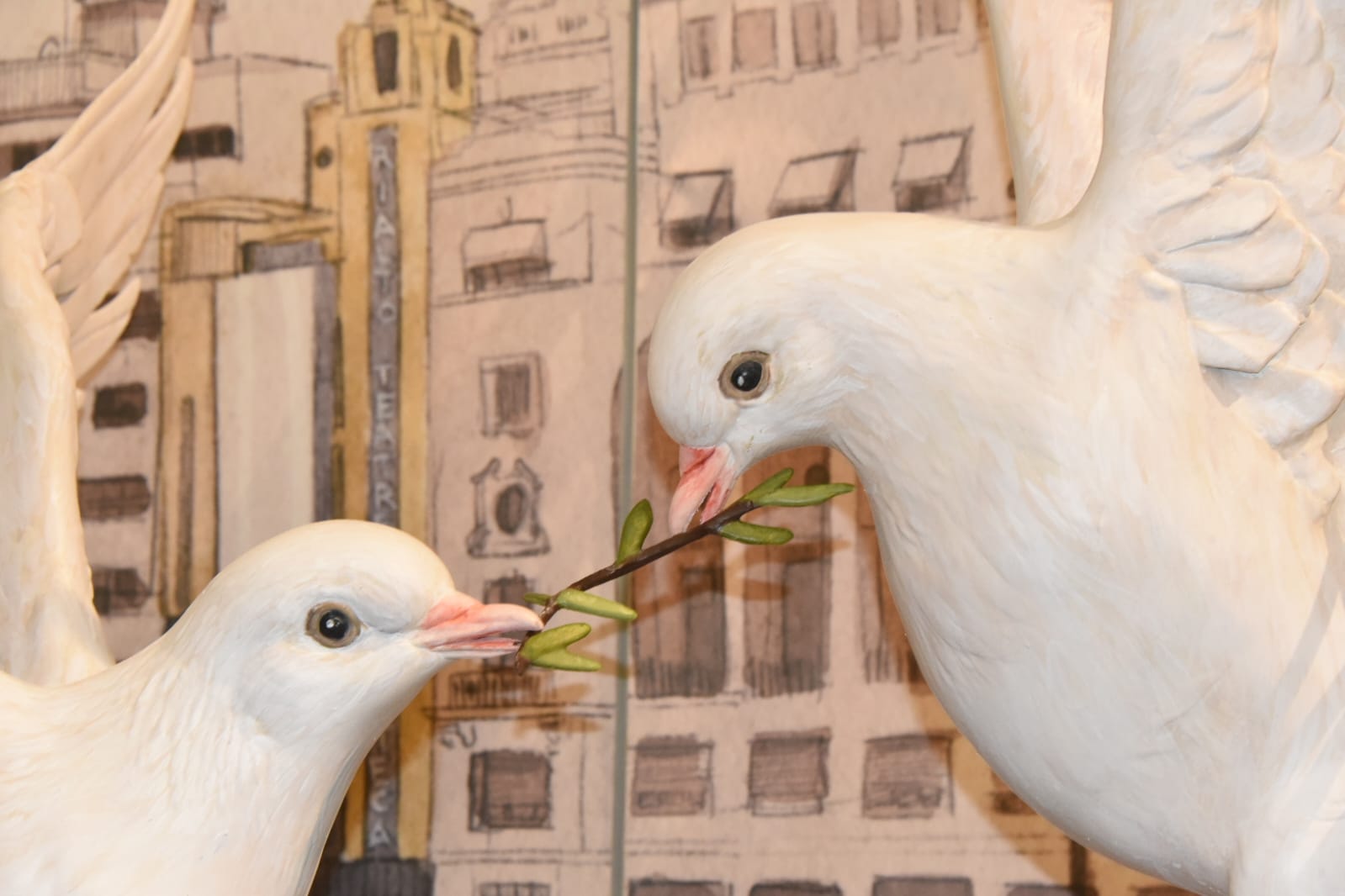 Dos palomas blancas, símbolo de la paz; Enfrentadas, símbolo de la guerra; Por una rama de olivo, símbolo de la paz. Apropiarse de la paz para justificar la guerra. La guerra se alimenta de la dualidad. La paz se alimenta de la unidad.