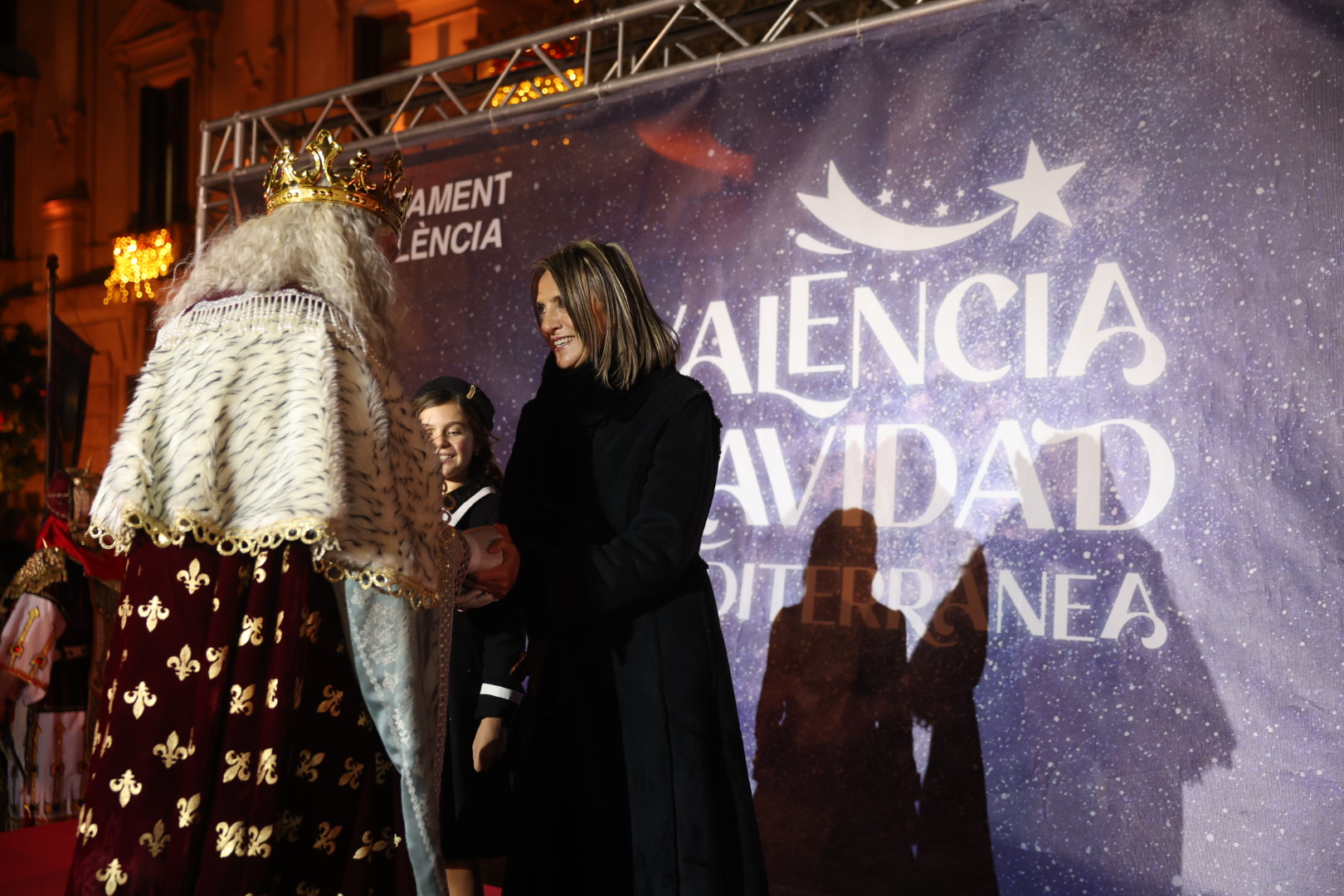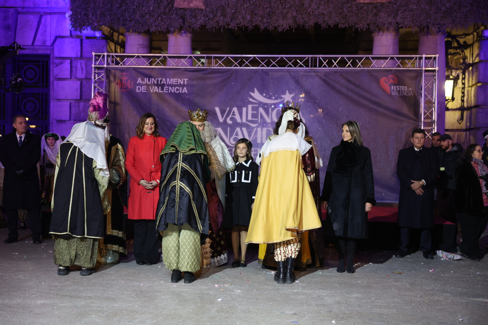Desde allí se han dirigido al Palacio de la Exposición, el punto de inicio de la cabalgata que tras recorrer el centro de la ciudad ha terminado en la Plaza del Ayuntamiento, donde han sido recibidos por la alcaldesa de Valencia, María José Catalá, las Falleras Mayores de Valencia 2024 María Estela Arlandis y Marina García junto a sus Cortes de Honor.
