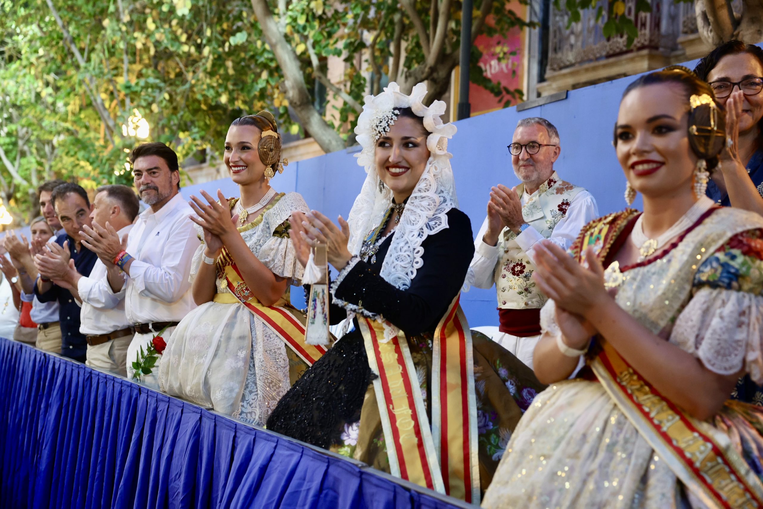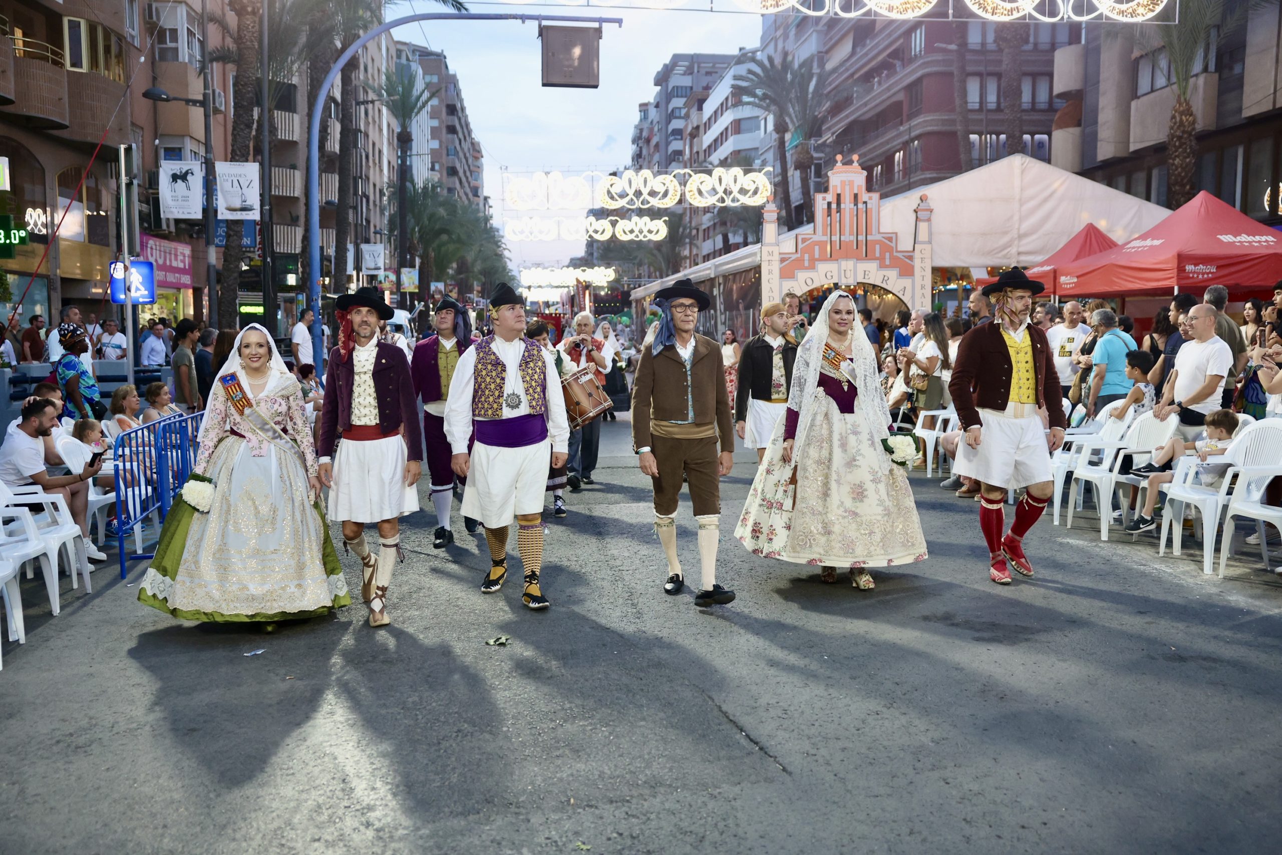 Durante su visita oficial a las Fiestas de Hogueras 2025, las máximas representantes de las Fallas acudieron con orgullo y elegancia ataviadas con sus trajes oficiales, siendo recibidas con entusiasmo por las comisiones alicantinas.