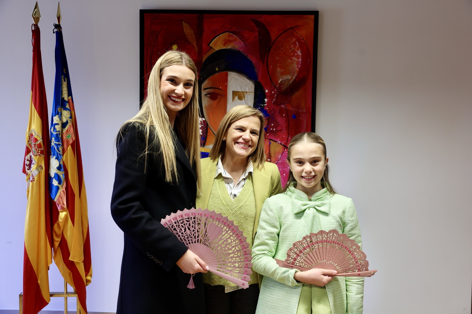 Como parte del acto protocolario, Vicent Mompó entregó a las Falleras Mayores de València unos abanicos personalizados, elaborados artesanalmente por la firma valenciana Di Abani. Por su parte, Berta Peiró y Lucía García obsequiaron al presidente con una pieza de edición limitada creada por el artista Sergio Amar, en agradecimiento por la recepción.