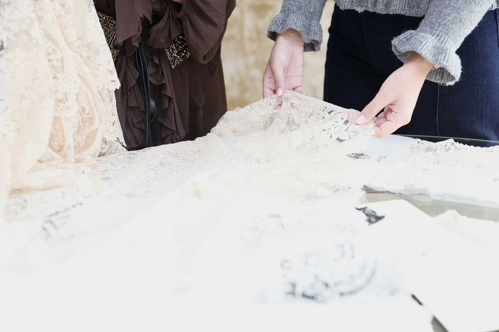 Durante la visita, las representantes falleras eligieron las manteletas para sus segundos trajes, unas piezas confeccionadas con encaje artesanal de alta calidad, símbolo de elegancia y tradición.
