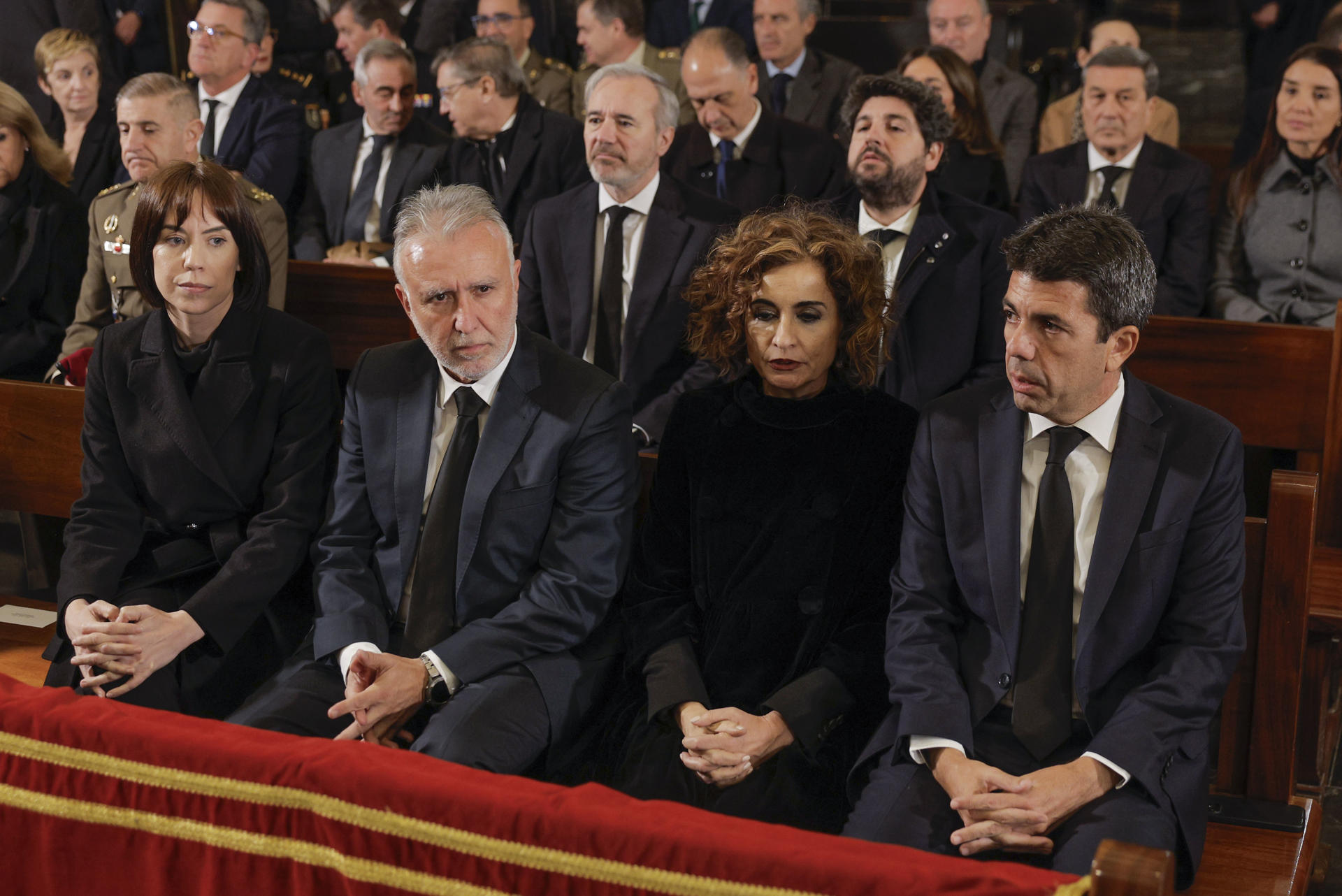 (dcha a izda) El presidente de la Generalitat Valenciana, Carlos Mazón la vicepresidenta primera del Gobierno, María Jesús Montero, el ministro de Política Territorial, Ángel Víctor Torres y la ministra de Ciencia, Diana Morant, durante el funeral por las víctimas de la DANA celebrado este lunes en la catedral de Valencia. EFE/Kai Försterling