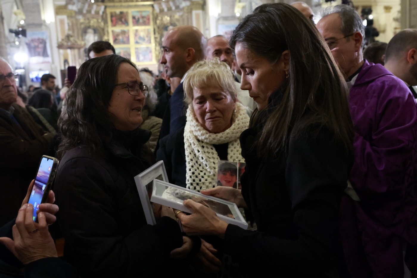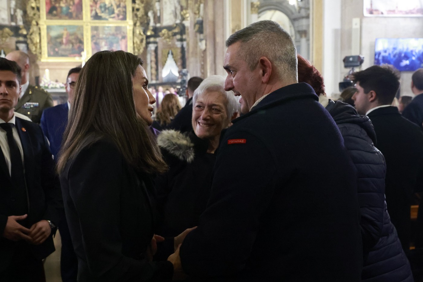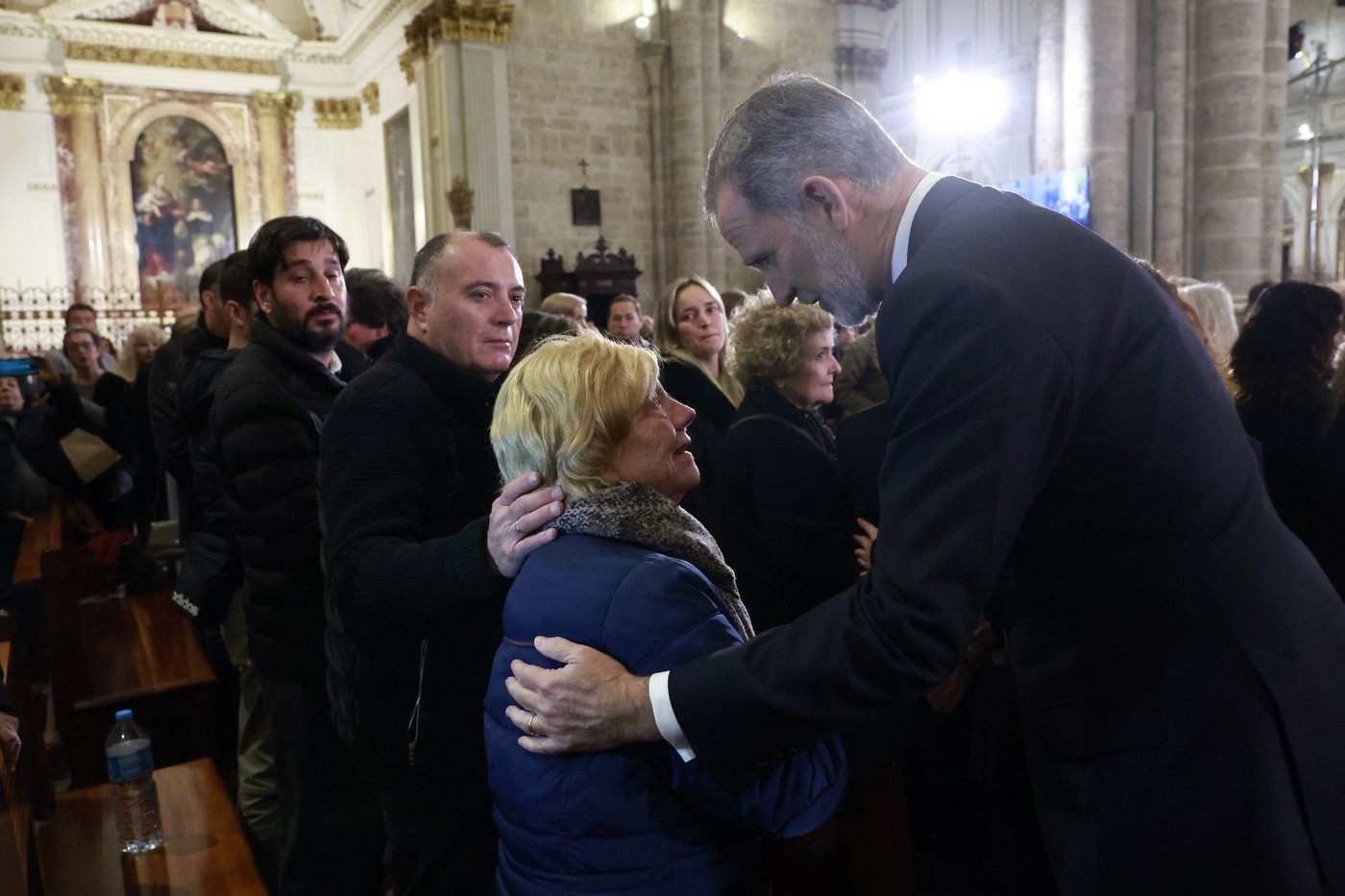Felipe y Letizia se han dirigido a los bancos que ocupaban las familias, abrazando y dando la mano a muchos de ellos mientras les escuchaban y consolaban. Separados entre sí a varios metros, los reyes han recibido aplausos en diversos momentos. La reina Letizia ha reconfortado a familiares que portaban fotos de sus seres queridos, mientras que Felipe VI, al que incluso le han gritado «¡Viva el rey!», ha recibido escritos de algunos presentes.