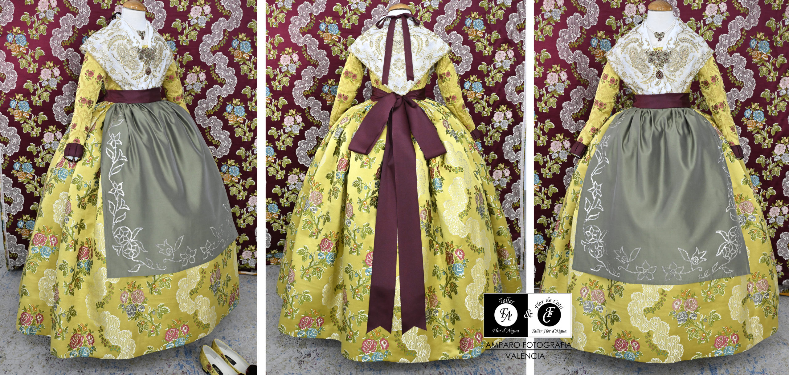 El vestido, confeccionado por Indumentaria Valenciana Amparo Y Paz consta de un cuerpo del siglo XVIII de media manga, adornado con cordones y alamares en cierre y terminación manga. Faldón de una pieza con plisado trasero.