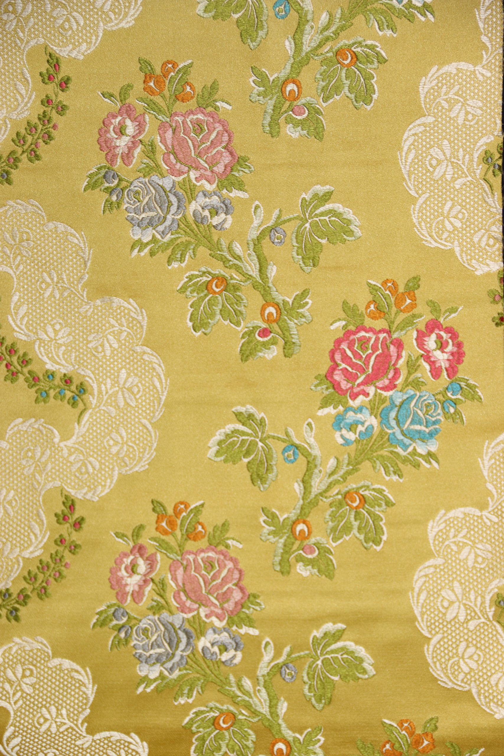 Clara Mª ha lucido una seda de Entretelares con el color de fondo ‘Ruidera’ y 13 tramas de colores para sus flores, hojas y ornamento. Su diseño está basado en un dibujo del siglo XVIII dándole el nombre de ‘Calisto’.