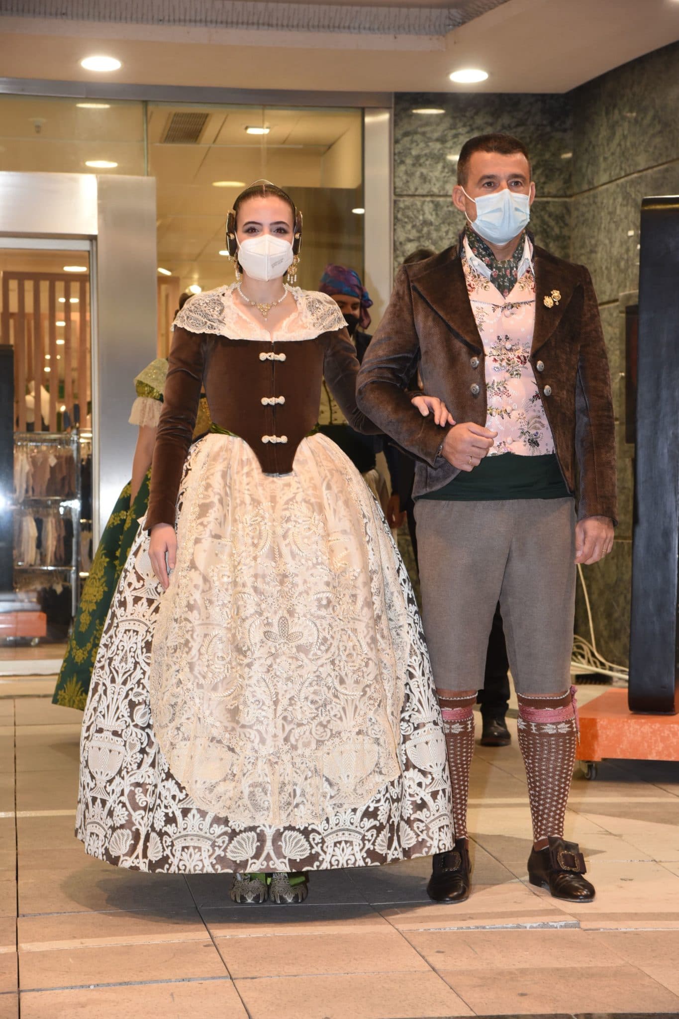 Uno de los momentos más esperados de la noche fue el descubrimiento del traje, que concentró todas las miradas del auditorio. Juana Paula Centeno Roig apareció con un espolín Soto de color azul, una elección cargada de simbolismo en la tradición valenciana, y es que este tono se asocia a la nobleza, la serenidad y la elegancia clásica de la indumentaria histórica. El tejido, confeccionado por Amparo Fabra, destaca por la riqueza del dibujo y la profundidad del color, que aporta sobriedad y presencia escénica.