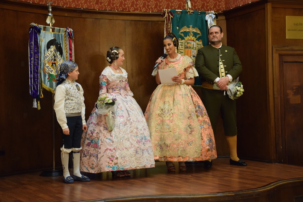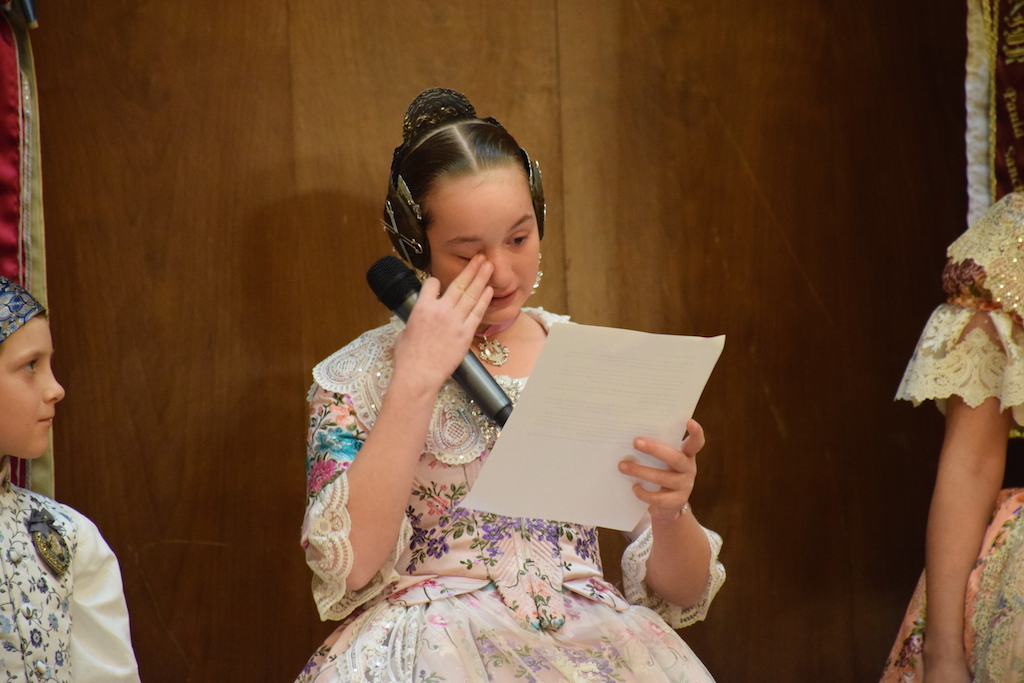 Tras la presentación y la lectura del acta, ambas Mireia y Brgoña, acompañadas en todo momento por sus presidentes Diego Navarro, infantil y Chimo Diaz , grande tuvieron la oportunidad de dedicar unas emotivas palabras a los presentes, donde agradecieron el apoyo y la confianza de familiares y amigos, a la vez que ensalzaron el valor que tenía el cargo para el cual habían sido elegidas y lo que ello representaba, para lo que será seguro «el mejor año» según sus propias palabras. Felicitaron, además a Rocio Gil por su nombramiento como Fallera Mayor de Valencia