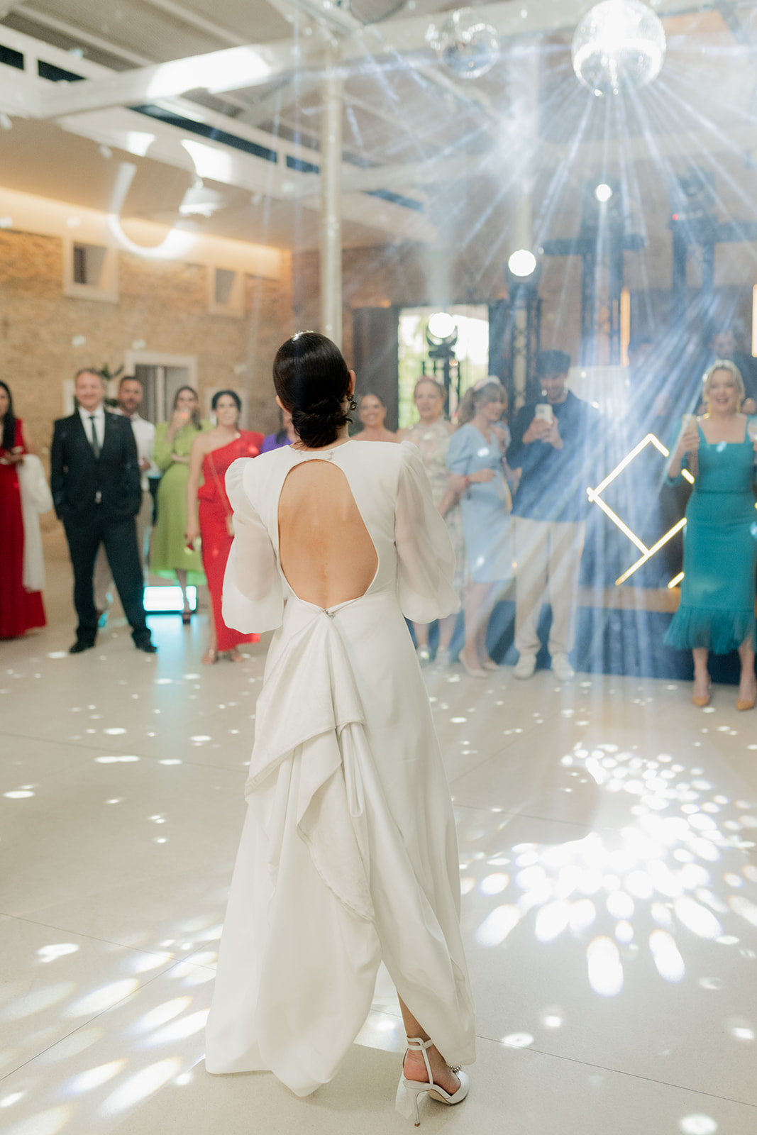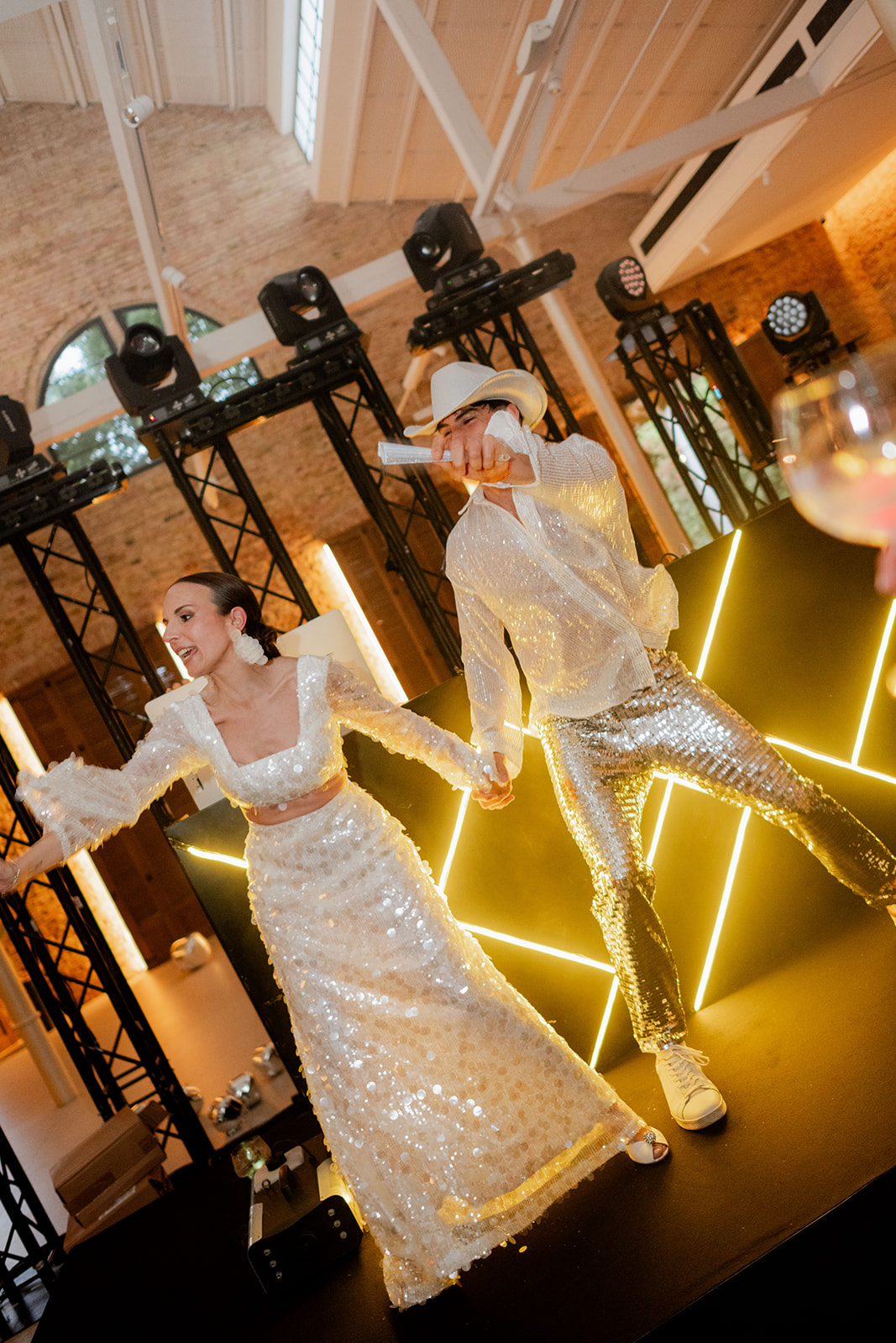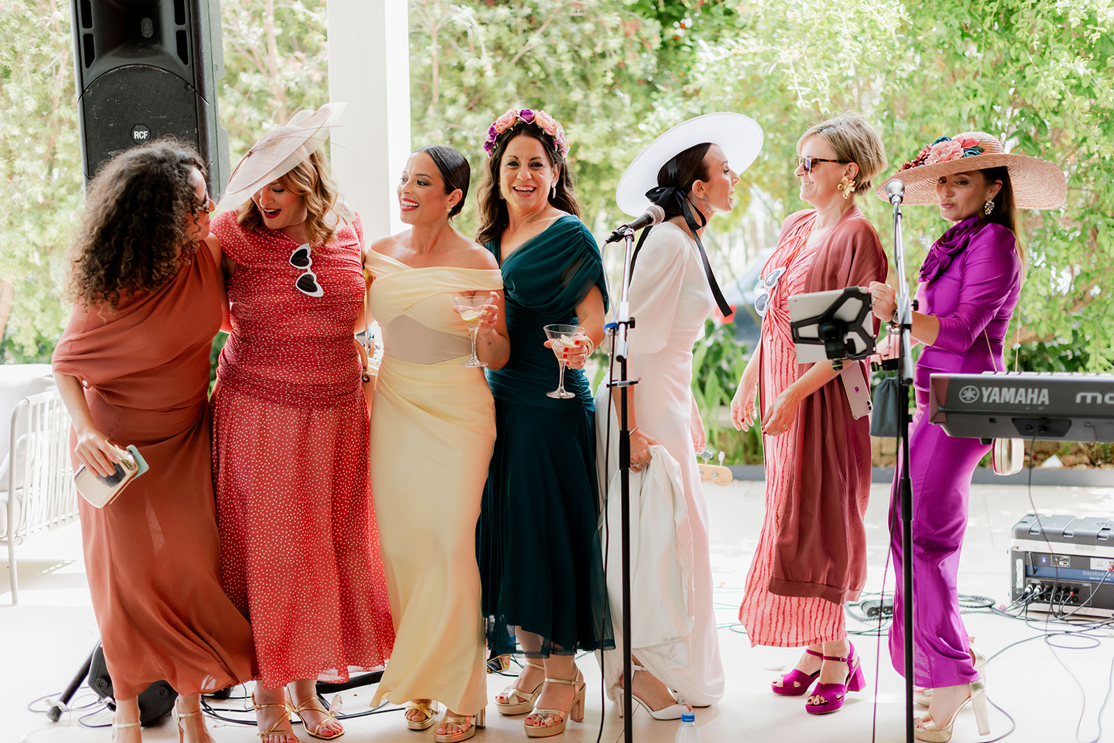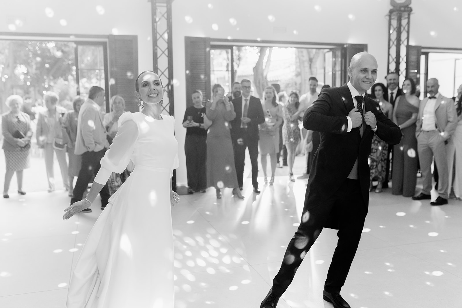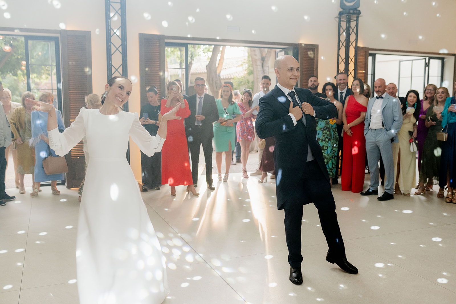 Comenzó con música en directo llevada a cabo por Los Guapos, los que hicieron bailar y participar en sus canciones a todos los invitados, ¡cantaron hasta los novios!