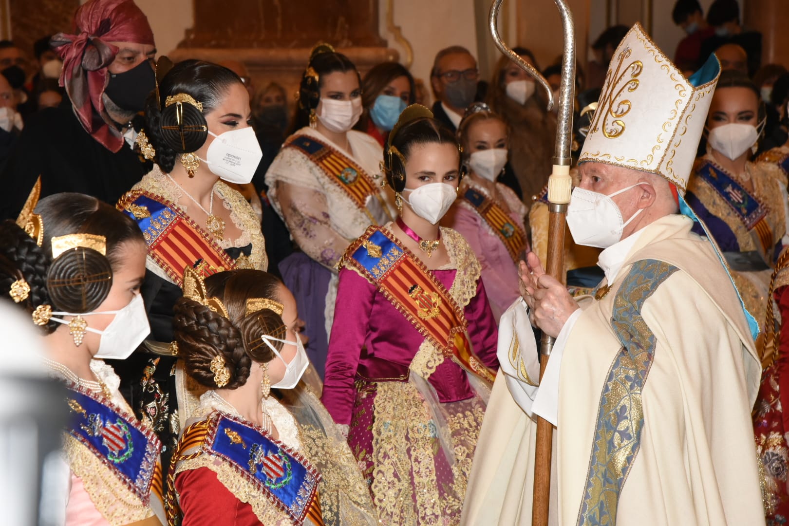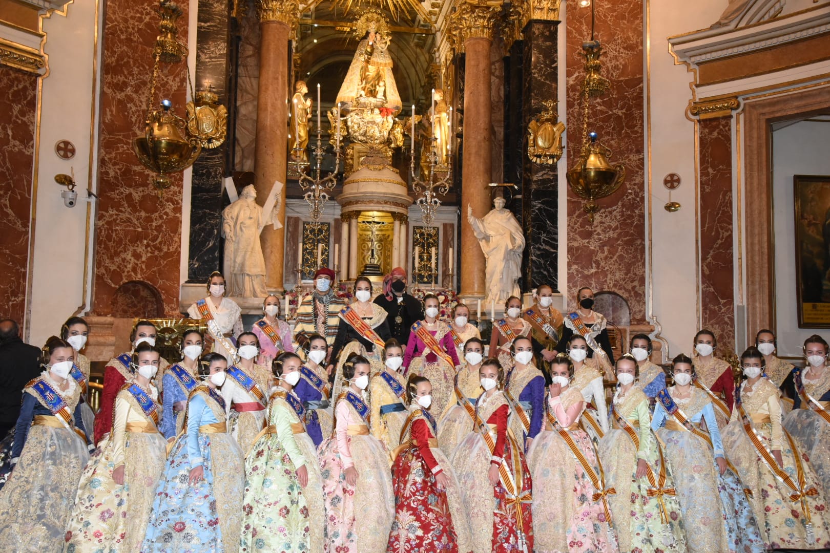 Allí, ante los pies de la Mare de Déu,  las máximas representantes han entregado sus ramos realizando una emotiva ofrenda en la que han tenido la oportunidad de agradecer los instantes vividos en este año tan especial y al mismo tiempo rezar a la Patrona por la fiesta de las Fallas que acaba de dar inicio.