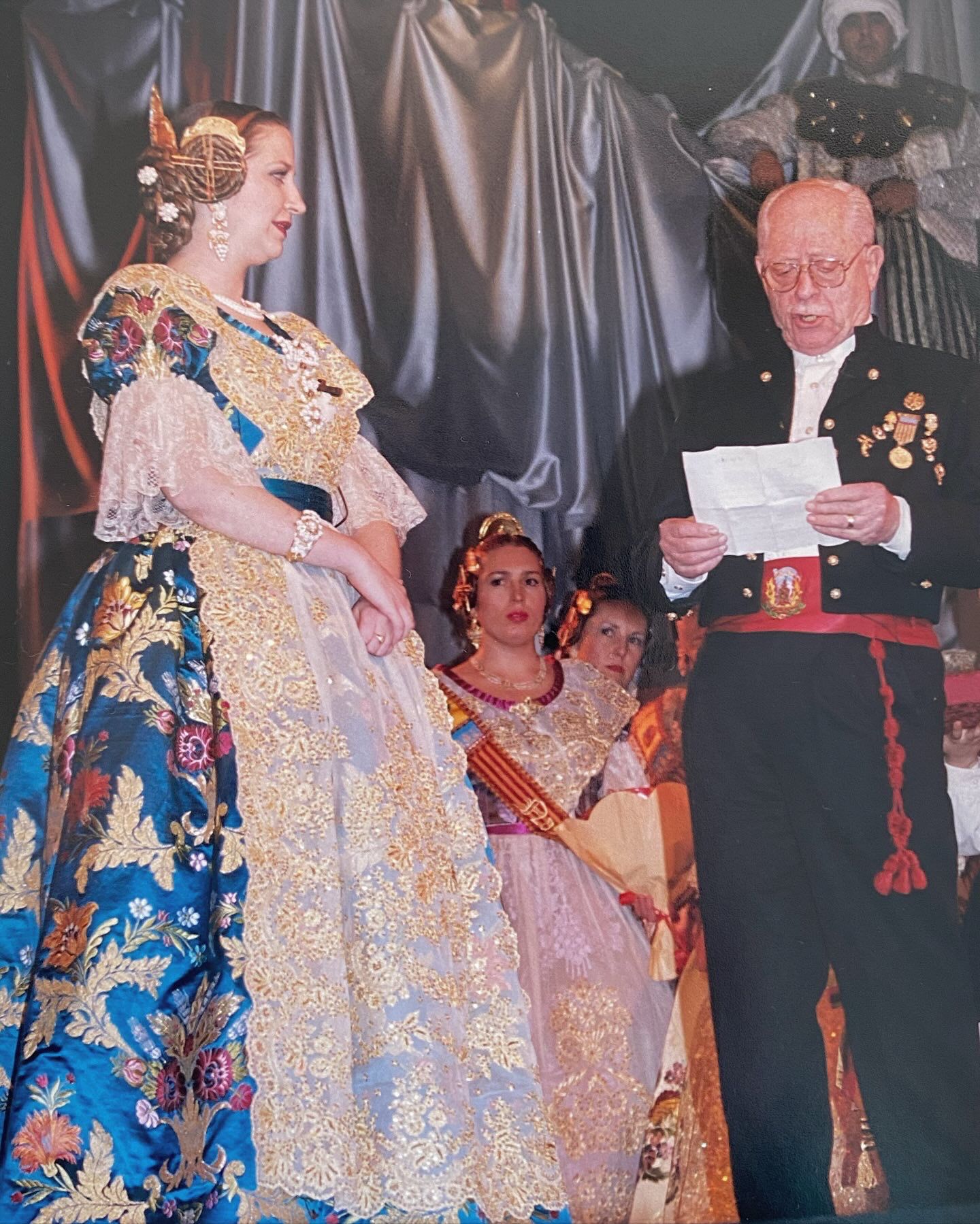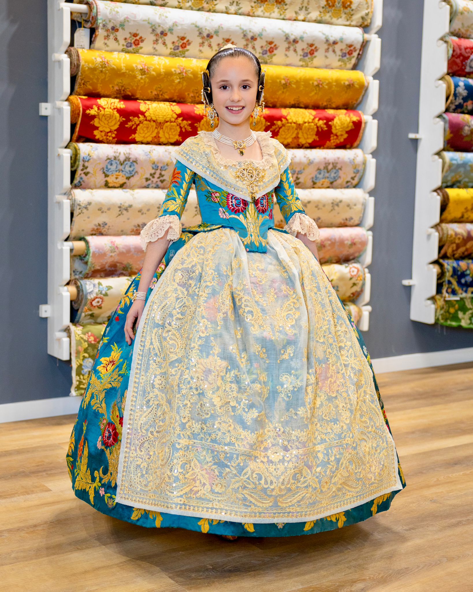 El espolín azul Egeo fue estrenado hace más de dos décadas por la tía de Daniella, Patricia Borrego, Fallera Mayor de la comisión Na Jordana en el año 2000. Para su sobrina, el tejido fue restaurado y se añadieron metros adicionales para garantizar una confección perfecta, adaptándolo al cuerpo de Daniella con un resultado impecable gracias a Compañía Valenciana de la Seda