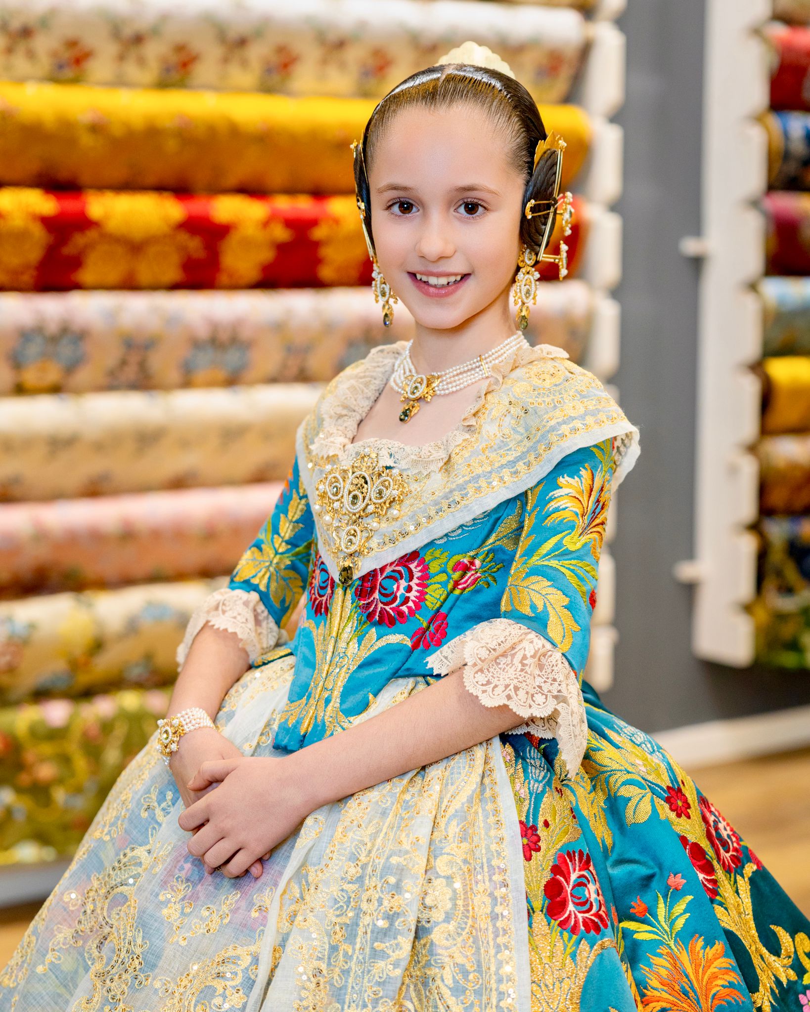Daniella lució un espectacular traje de siglo XVIII confeccionado en Marian Indumentaria, la tienda familiar reconocida por su dedicación a la indumentaria fallera. Este atuendo, confeccionado en el histórico espolín «Espigas de Montserrat» en azul Egeo, tiene un legado único que lo hace aún más especial.
