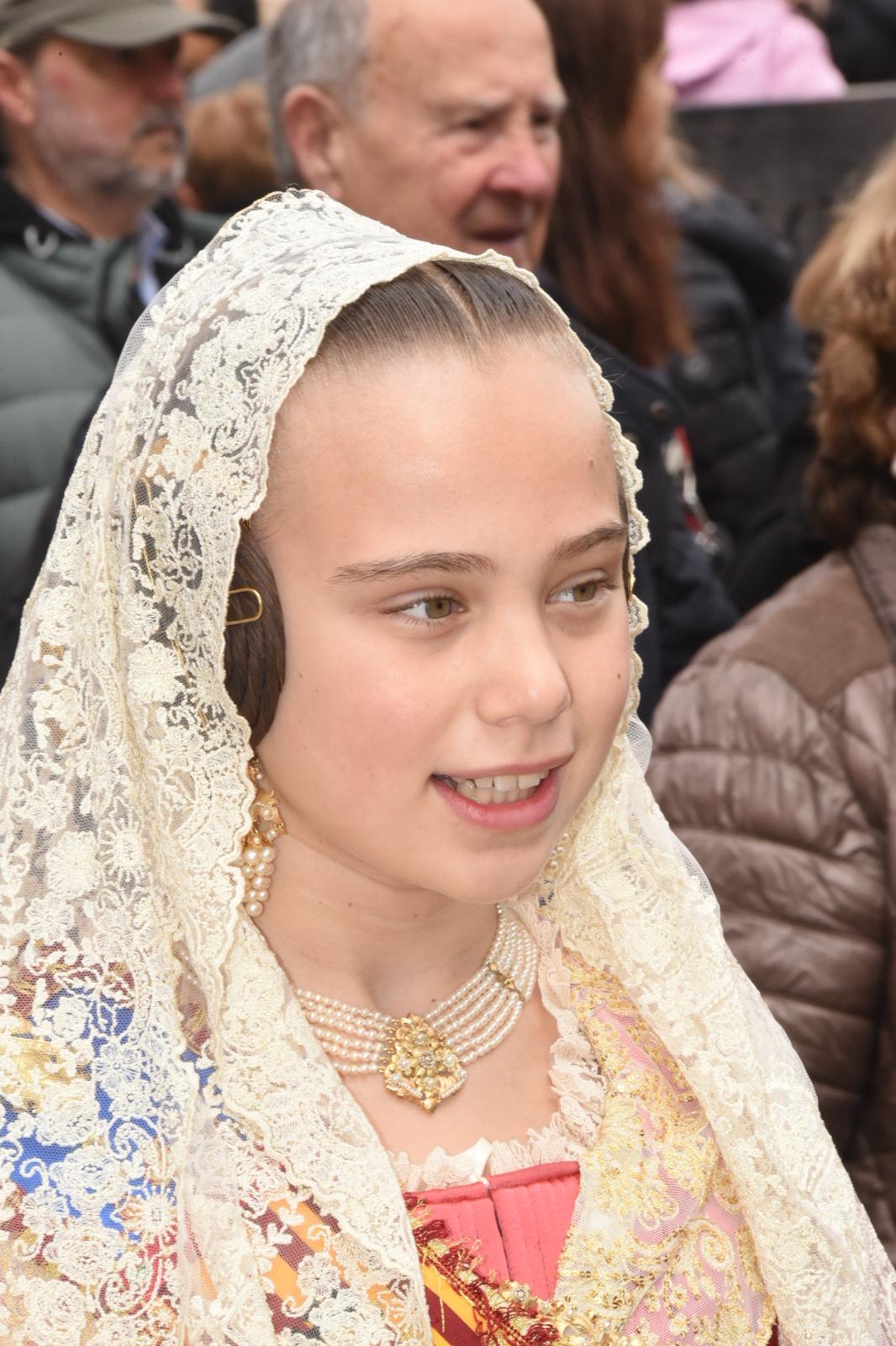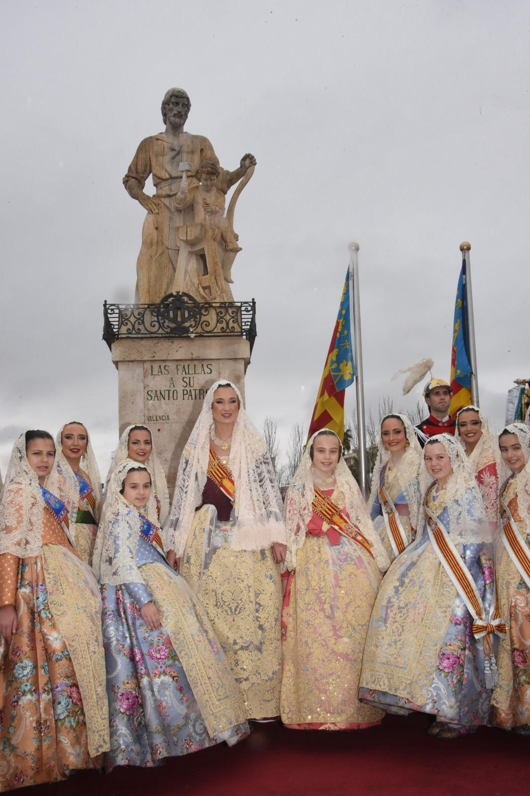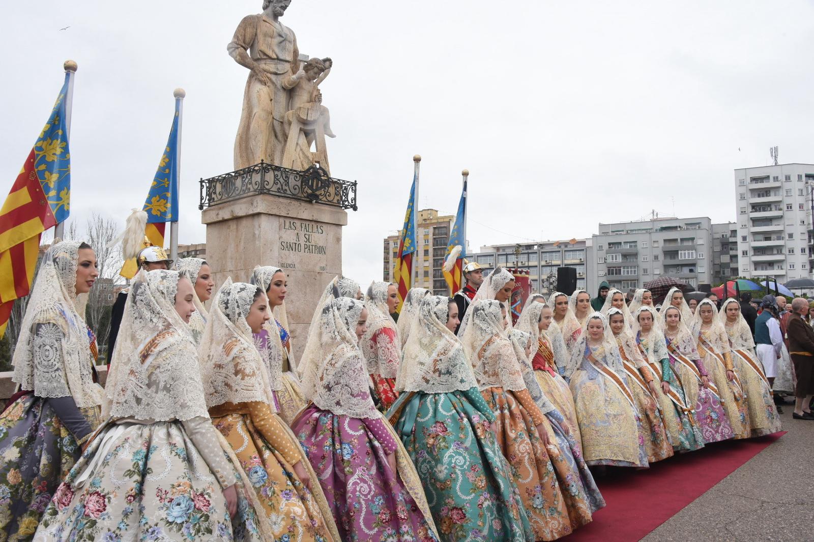 Antes de participar en la misa solemne en la Catedral, las Falleras Mayores de Valencia y sus Cortes de Honor han realizado una ofrenda de flores ante la imagen de San José, ubicada en el Puente de San José de Valencia.