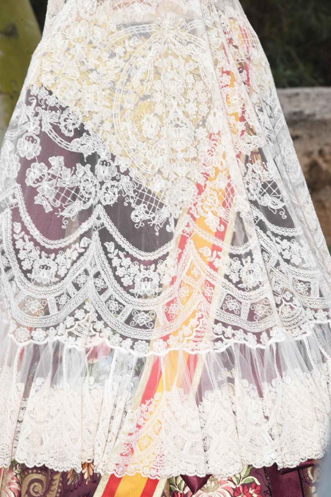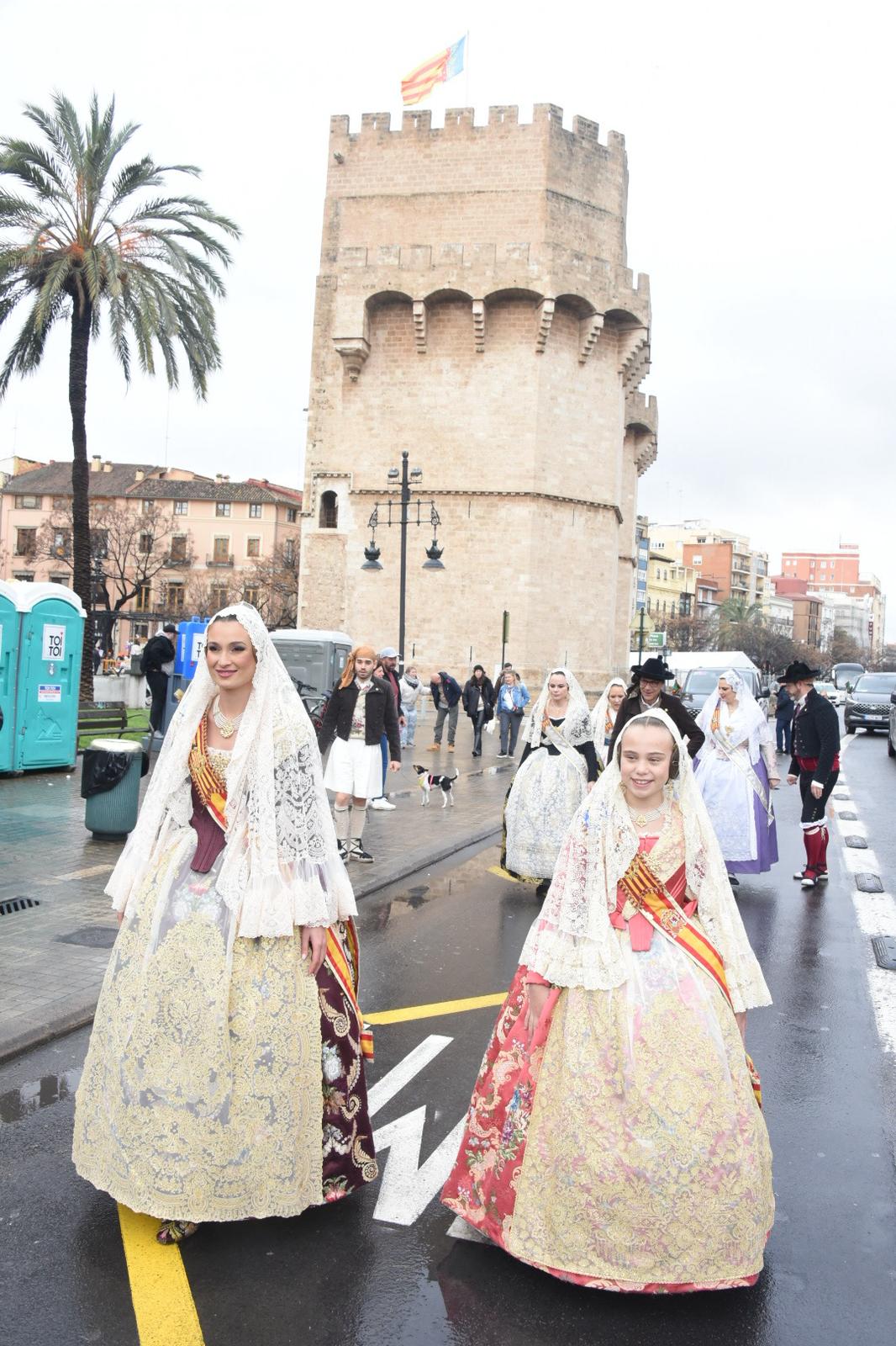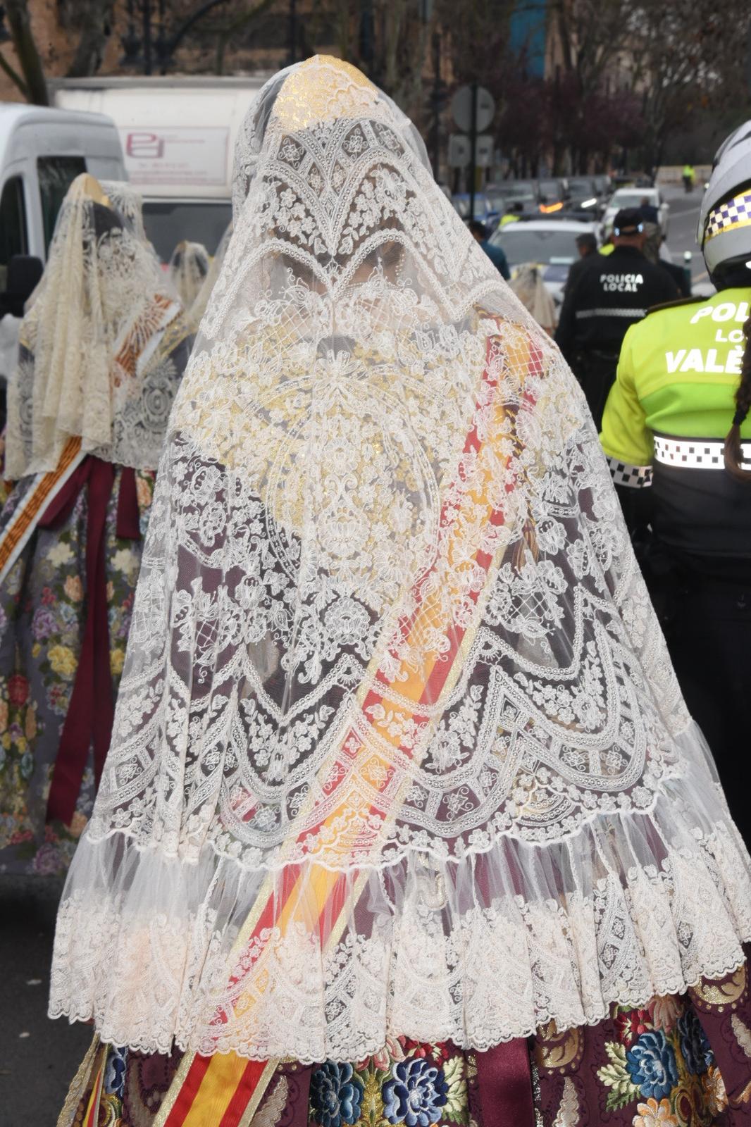 Antes de participar en la misa solemne en la Catedral, las Falleras Mayores de Valencia y sus Cortes de Honor han realizado una ofrenda de flores ante la imagen de San José, ubicada en el Puente de San José de Valencia.