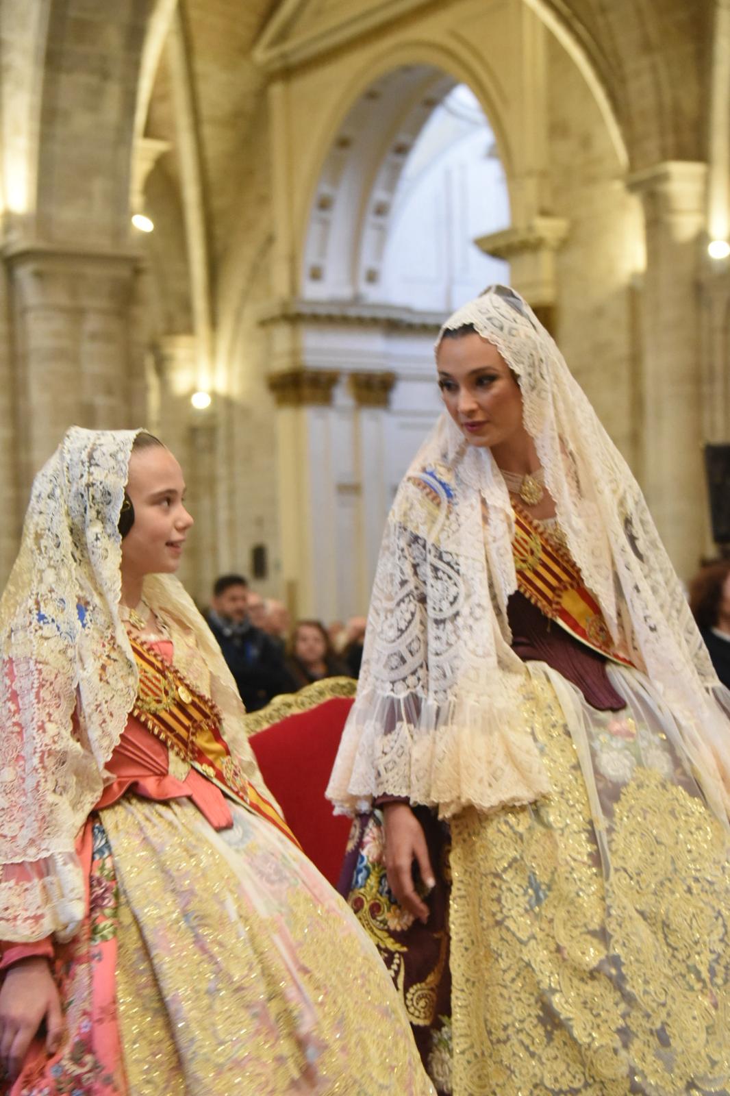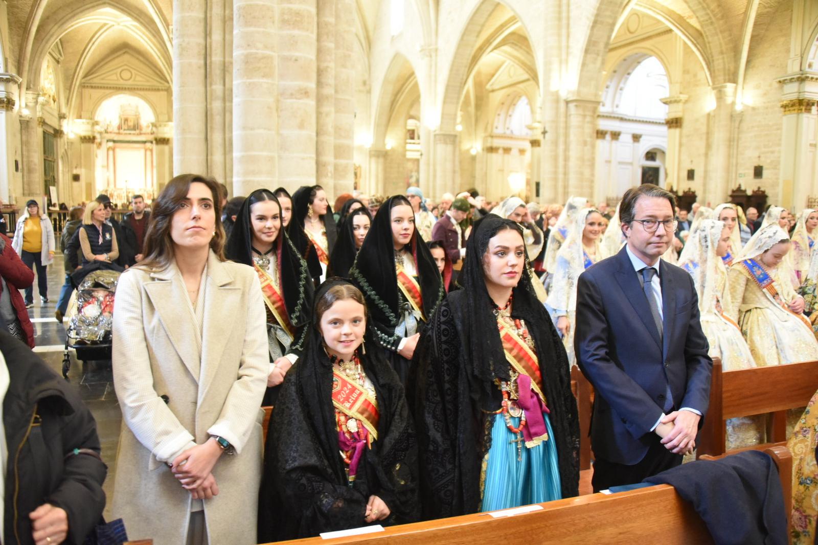 Las Falleras Mayores de València , Berta Peiró y Lucía García, acompañadas de sus Cortes de Honor han asistido a misa de la Catedral de València en honor a San José. El cardenal arzobispo de Valencia, Enrique Benavent, ha saludado «con especial afecto» a los que por su situación de vulnerabilidad no han podido estar en la eucaristía. En el solemne acto ha estado el concejal de Fallas, miembros de la Junta central Fallera, el Gremi de Fusters, representantes de la Bellea del Foc d’Alacant y de la Magdalena de Castelló, así como de las Casas regionales.