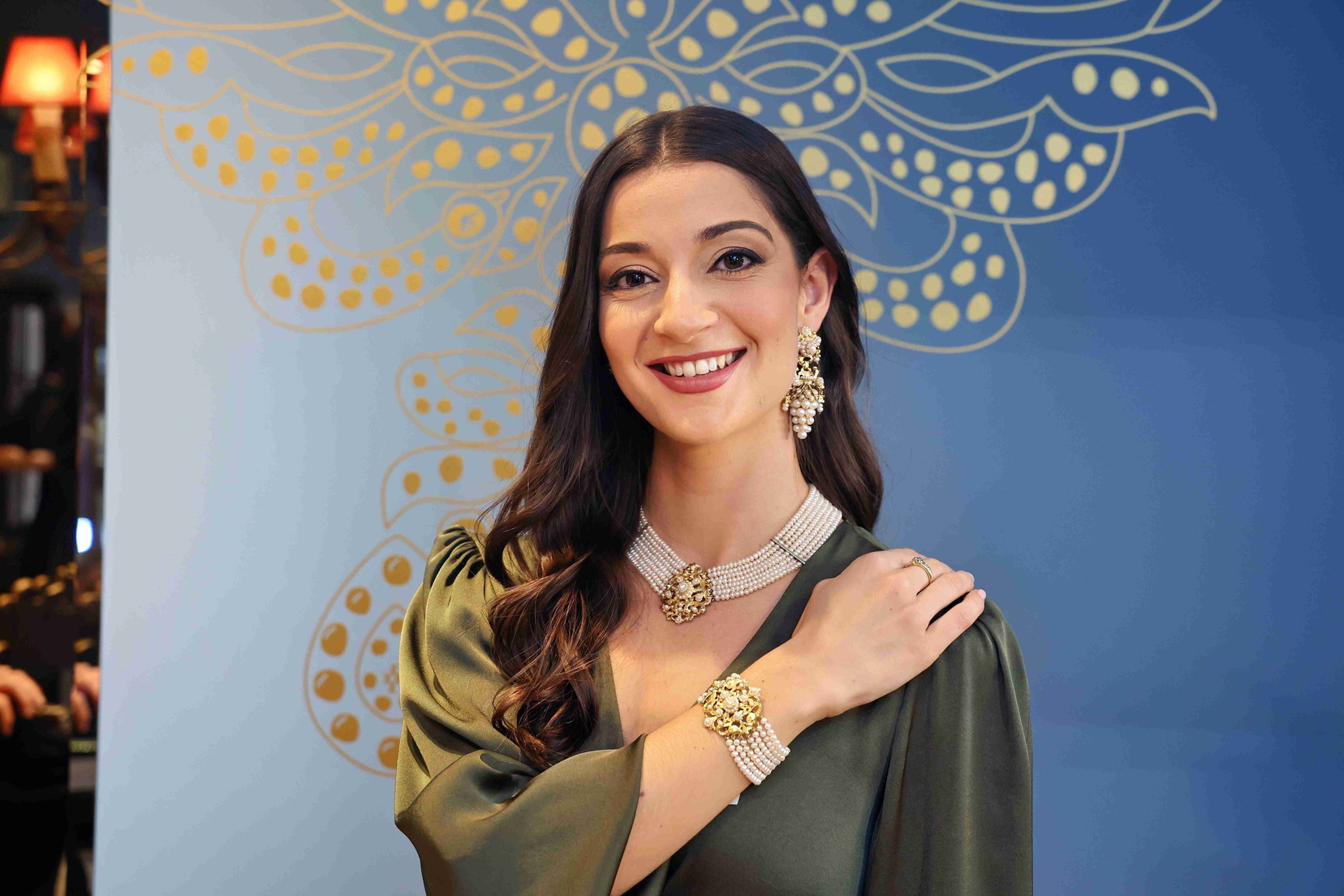 El tejido ha sido elaborado por Vives y Marí en seda color “citrino”, enriquecida con metal en oro viejo y una paleta de colores empolvados que aportan un delicado aspecto antiguo, elegante y lleno de matices. Un diseño que no pasa desapercibido y que destaca por su equilibrio entre sobriedad y riqueza ornamental.