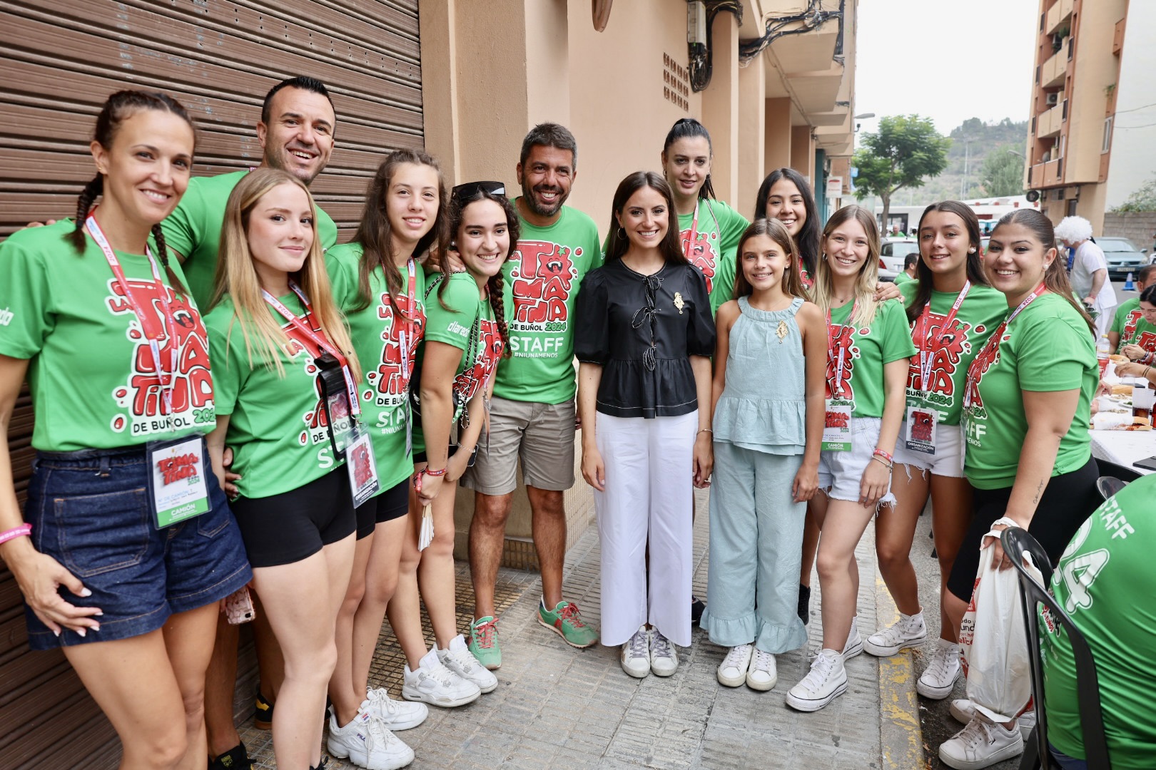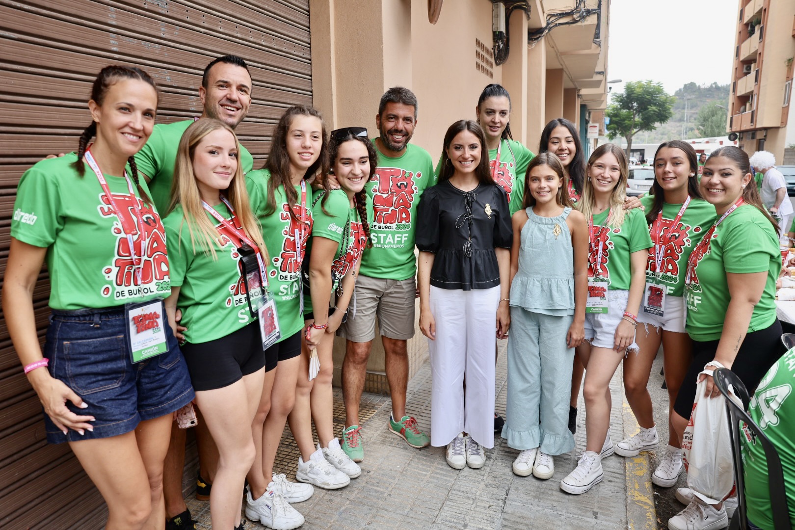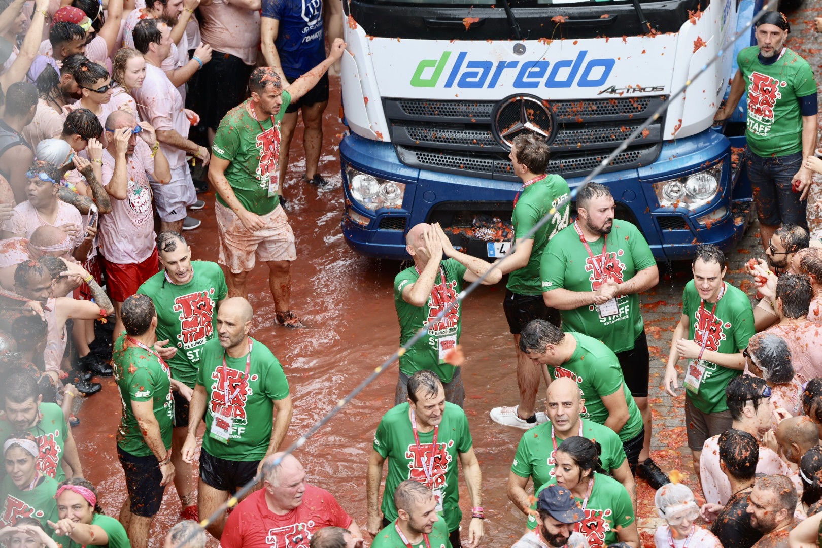 Las Falleras Mayores, con sus imponentes trajes tradicionales y su carisma, aportaron un toque de distinción a la Tomatina, recordando a todos los presentes que, aunque Buñol se tiñe de rojo una vez al año, el corazón de la fiesta sigue latiendo con la misma fuerza que en las calles de Valencia durante las Fallas.