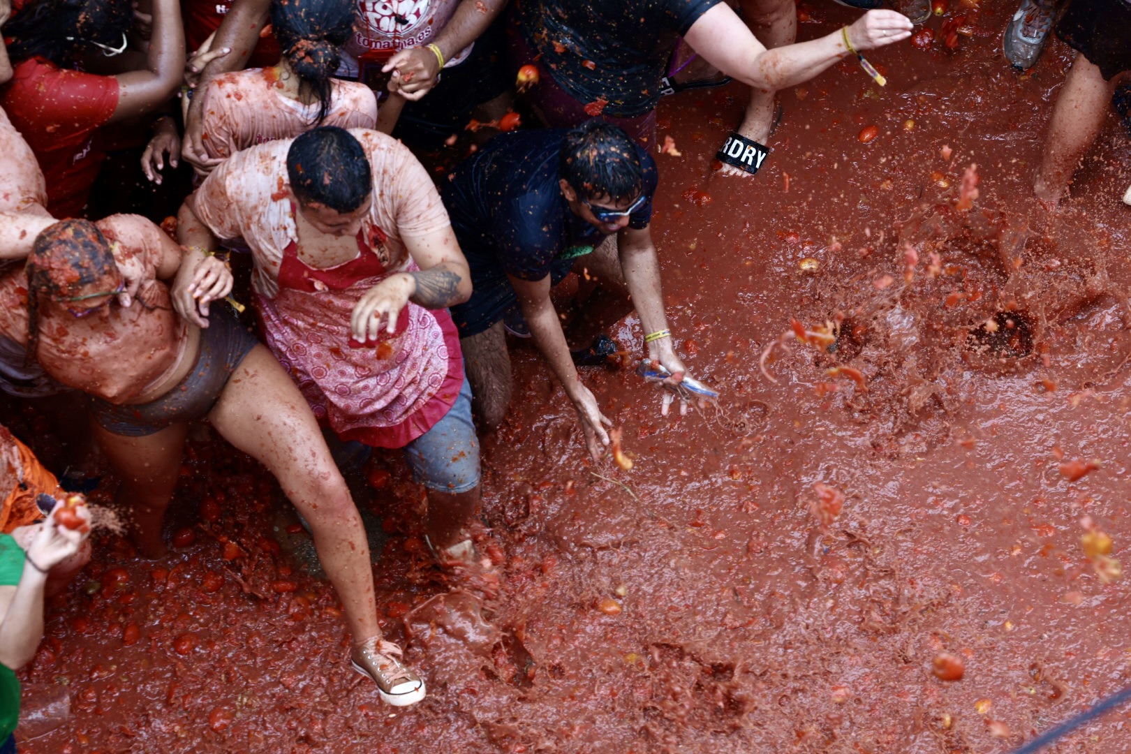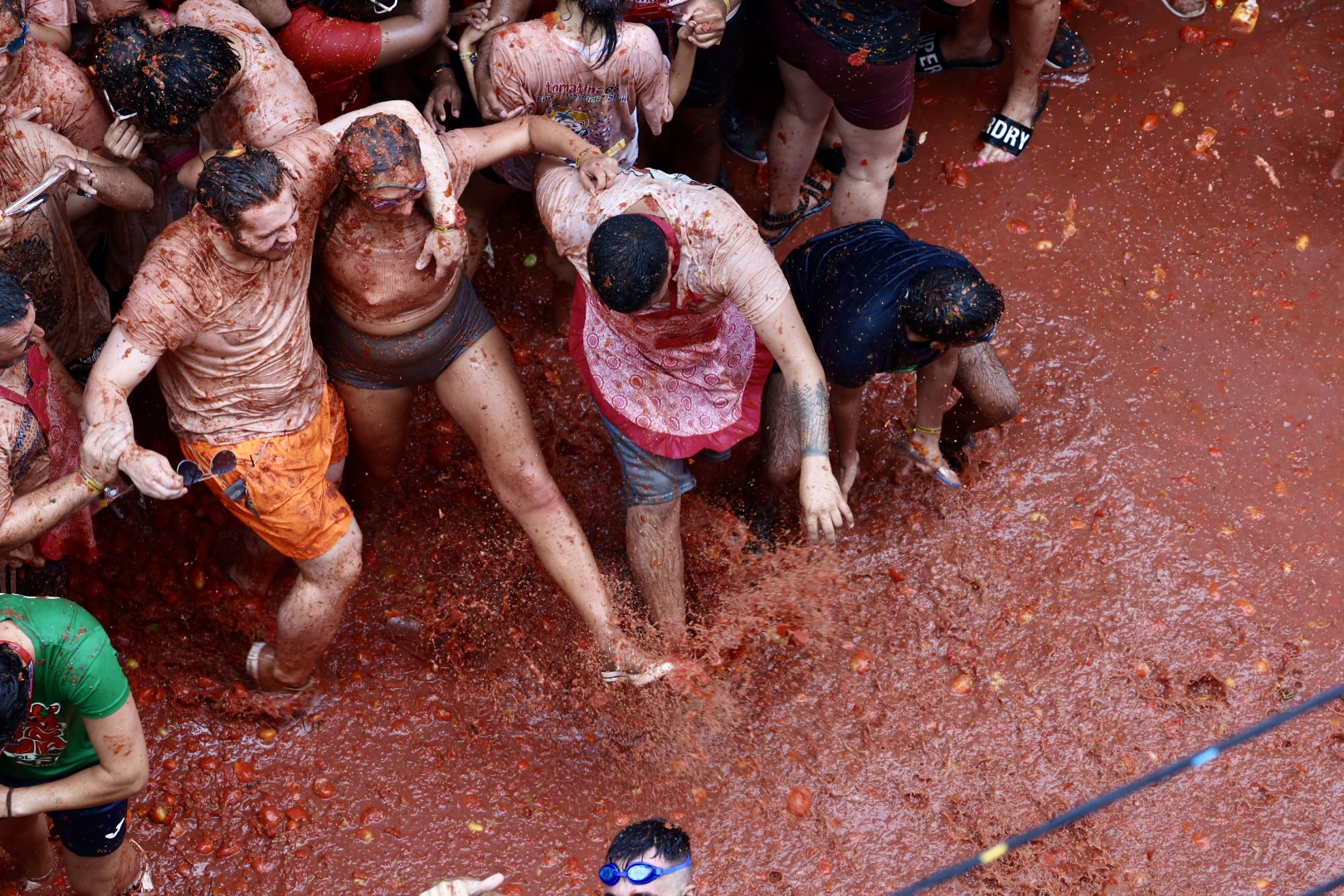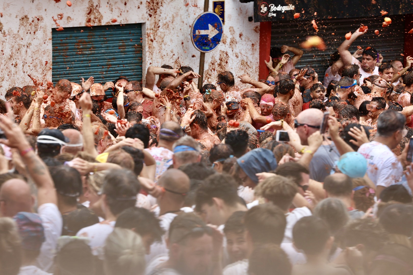La Tomatina, la icónica fiesta que se celebra cada año en la localidad valenciana de Buñol, volvió a teñir de rojo sus calles el pasado miércoles 28 de agosto de 2024. Este evento, conocido mundialmente por su impresionante batalla de tomates, reunió a miles de participantes de todas partes del mundo que se sumergieron en la alegría y el descontrol de lanzar y recibir toneladas de tomates maduros.