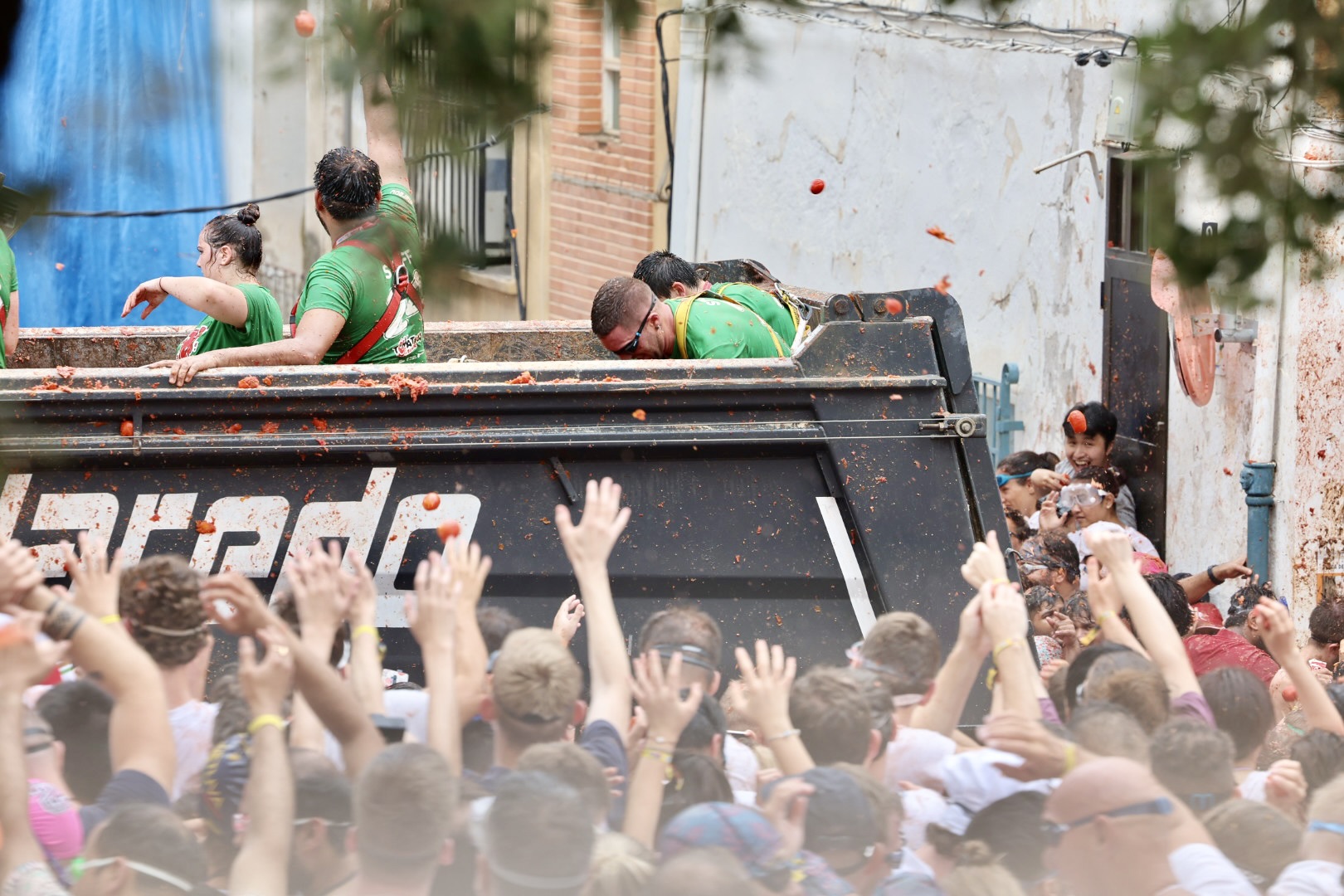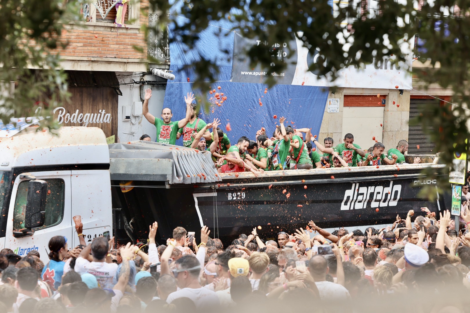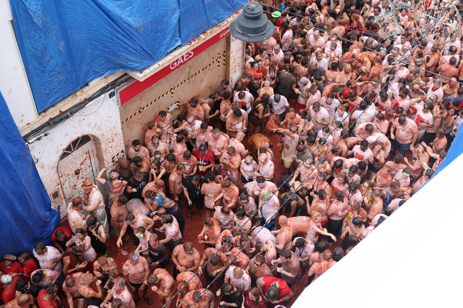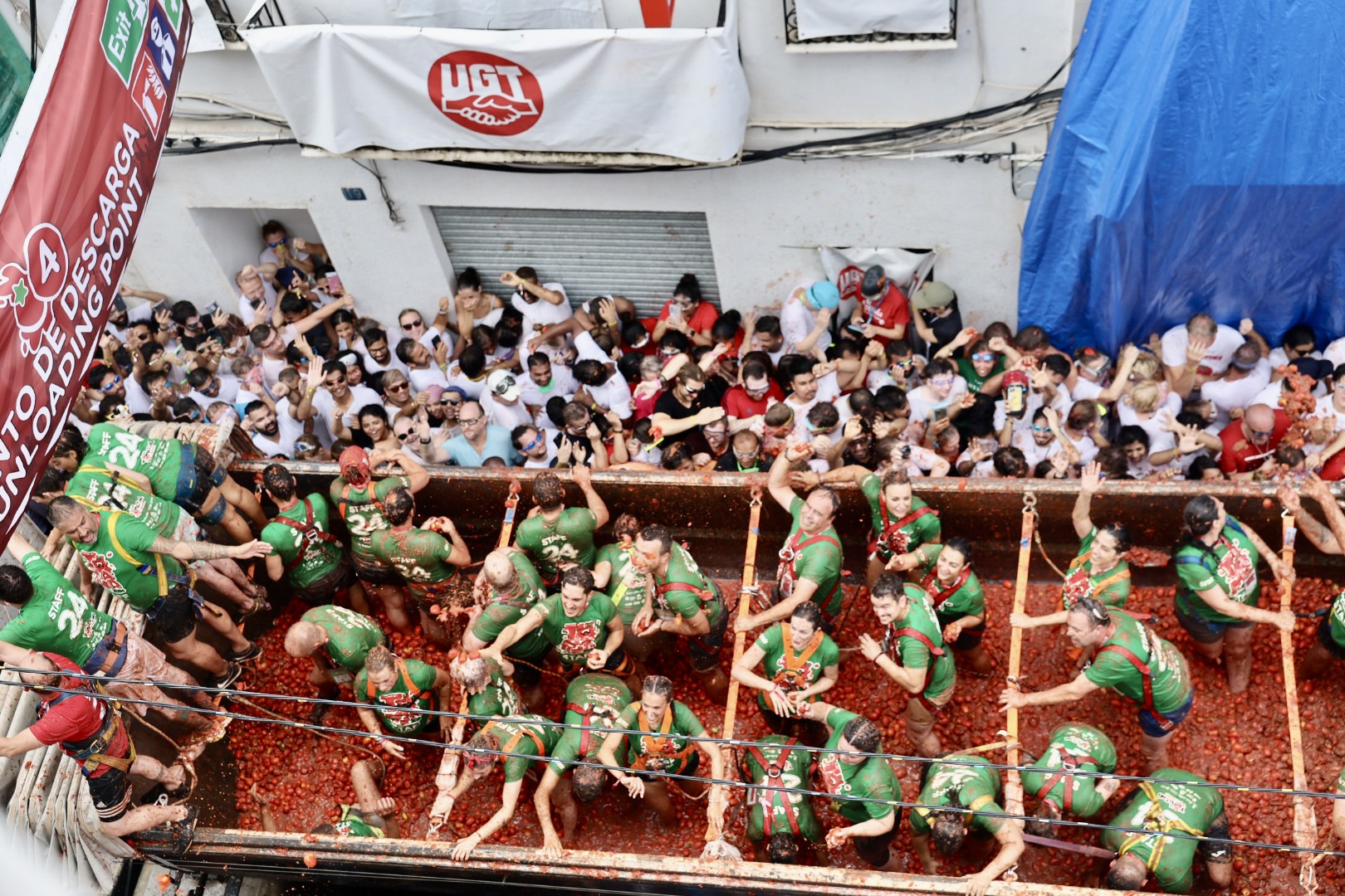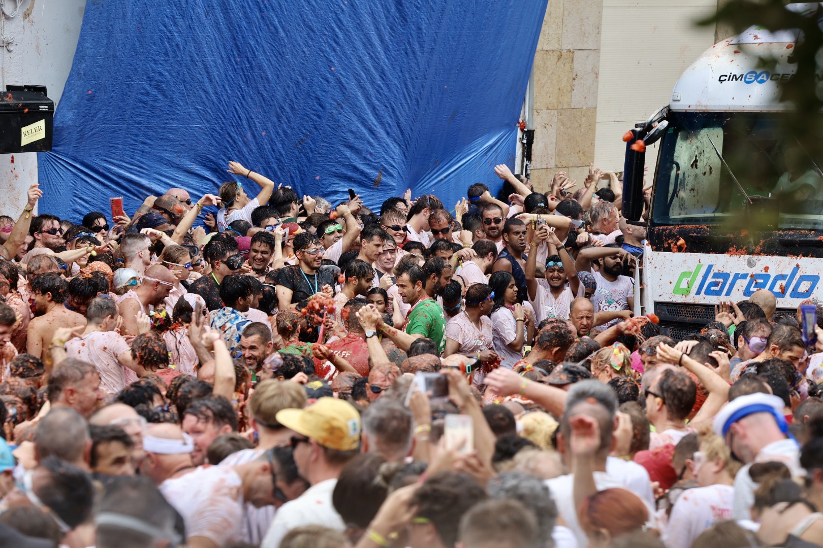 El acto comenzó a las 11:00 de la mañana, tras el tradicional «palo jabón», un evento previo en el que los participantes intentan alcanzar un jamón colocado en lo alto de un poste enjabonado. Una vez conseguido, el estruendo de un cañón de agua dio inicio a la batalla campal de tomates. Durante una hora, la Plaza del Pueblo y las calles adyacentes se transformaron en un mar rojo de pulpa y jugo de tomate, mientras la música y los gritos de alegría resonaban por toda la localidad.