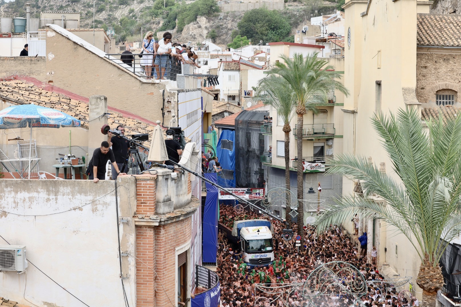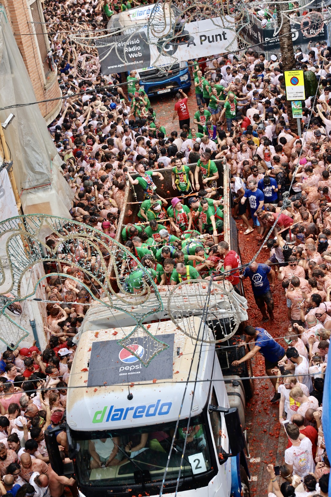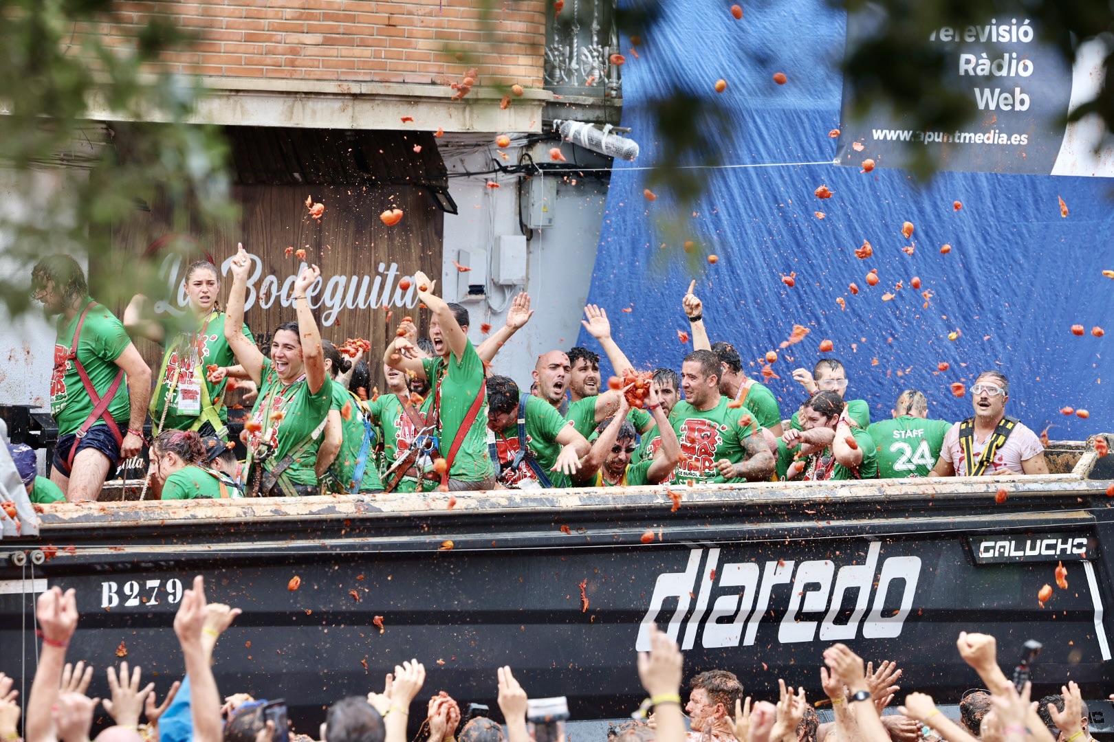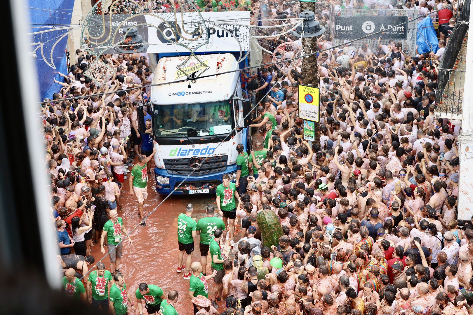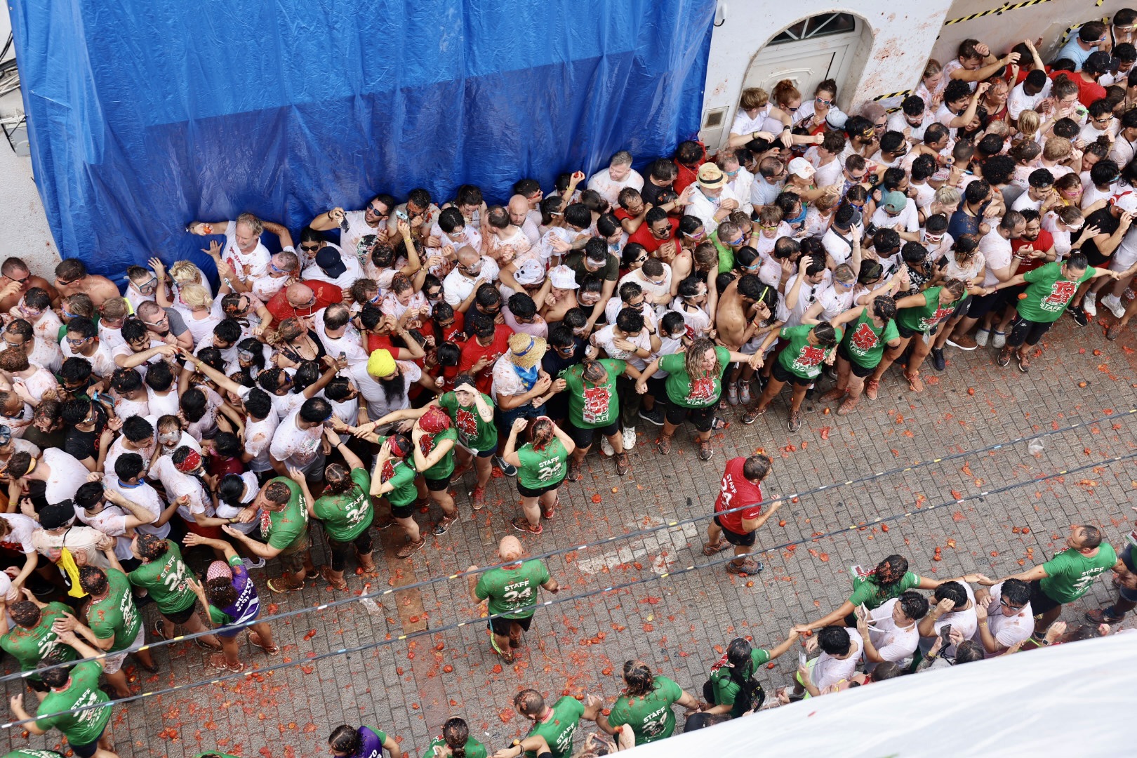 El acto comenzó a las 11:00 de la mañana, tras el tradicional «palo jabón», un evento previo en el que los participantes intentan alcanzar un jamón colocado en lo alto de un poste enjabonado. Una vez conseguido, el estruendo de un cañón de agua dio inicio a la batalla campal de tomates. Durante una hora, la Plaza del Pueblo y las calles adyacentes se transformaron en un mar rojo de pulpa y jugo de tomate, mientras la música y los gritos de alegría resonaban por toda la localidad.